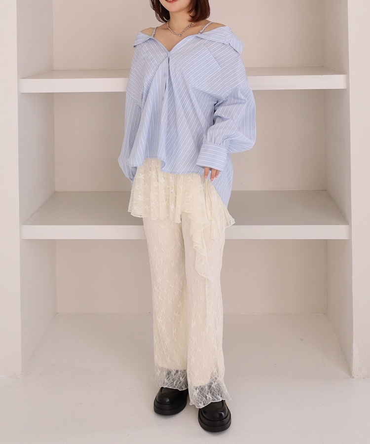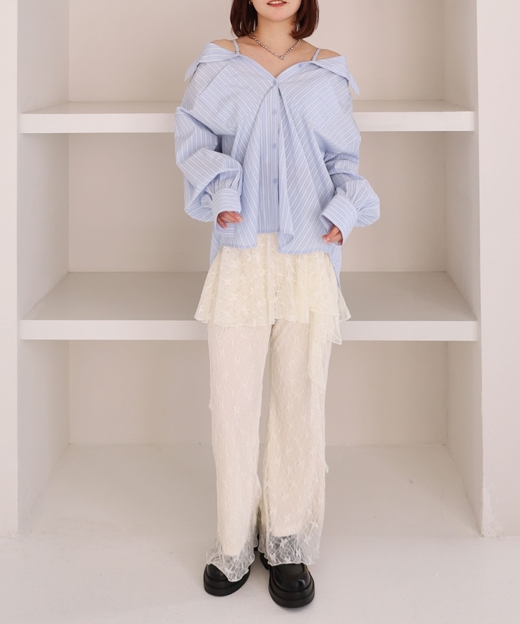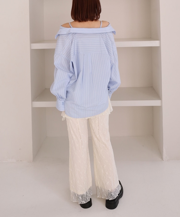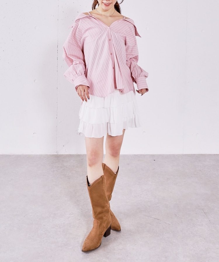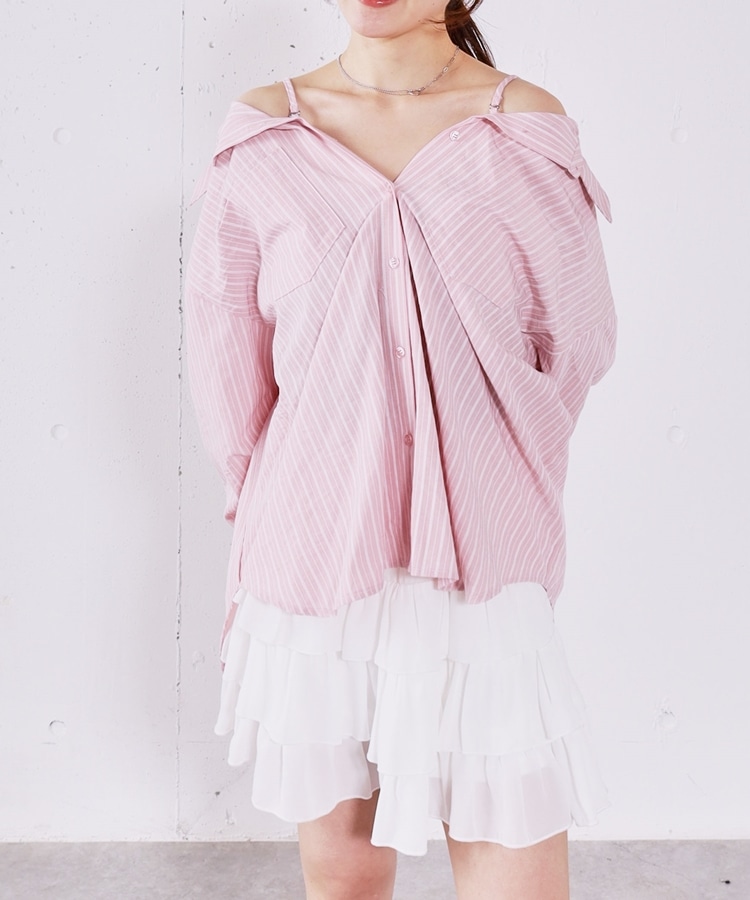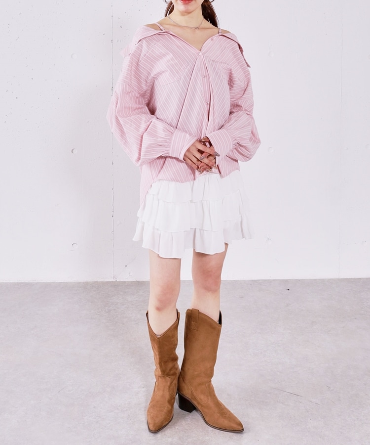 ・シンプルなシャツデザインながら、オフショルにすることで一気に旬な印象に