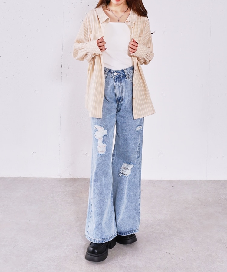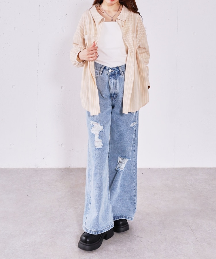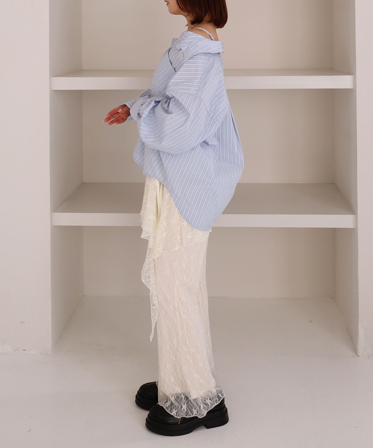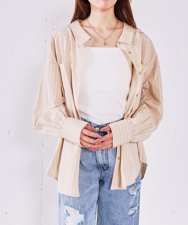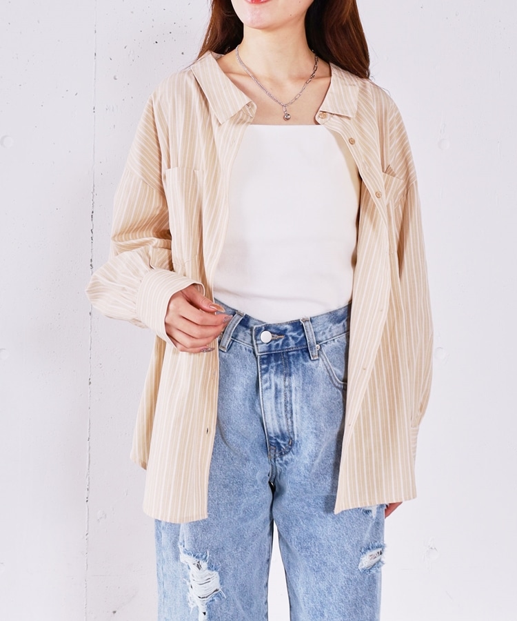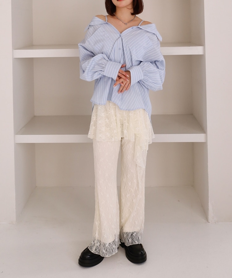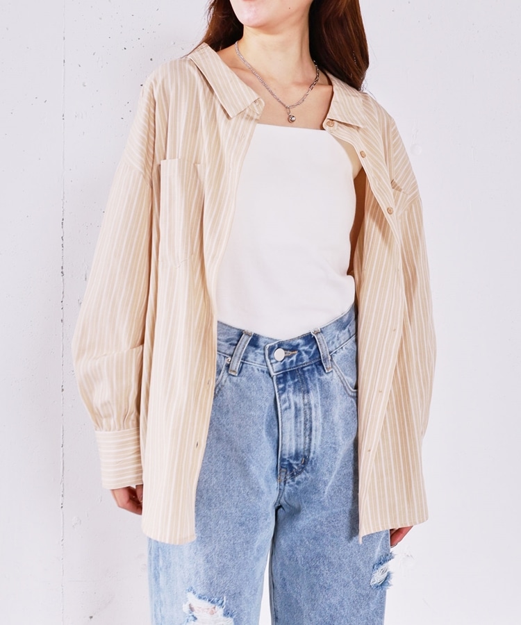 ・シンプルなシャツデザインながら、オフショルにすることで一気に旬な印象に