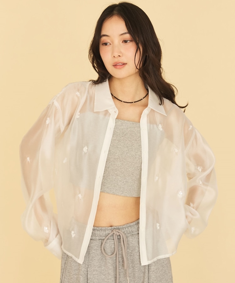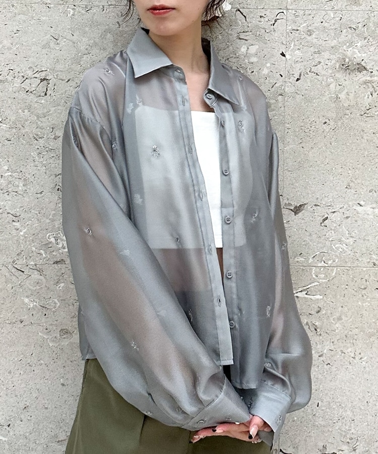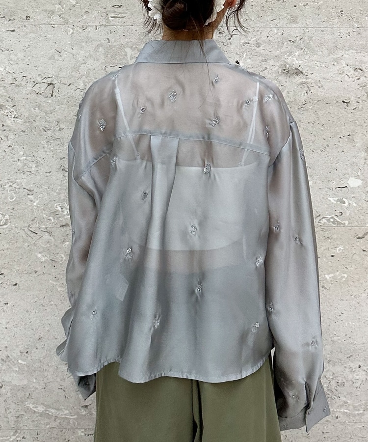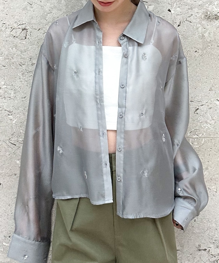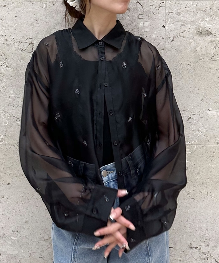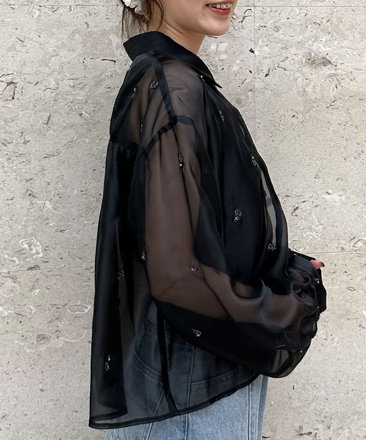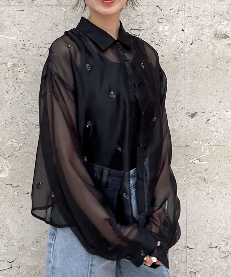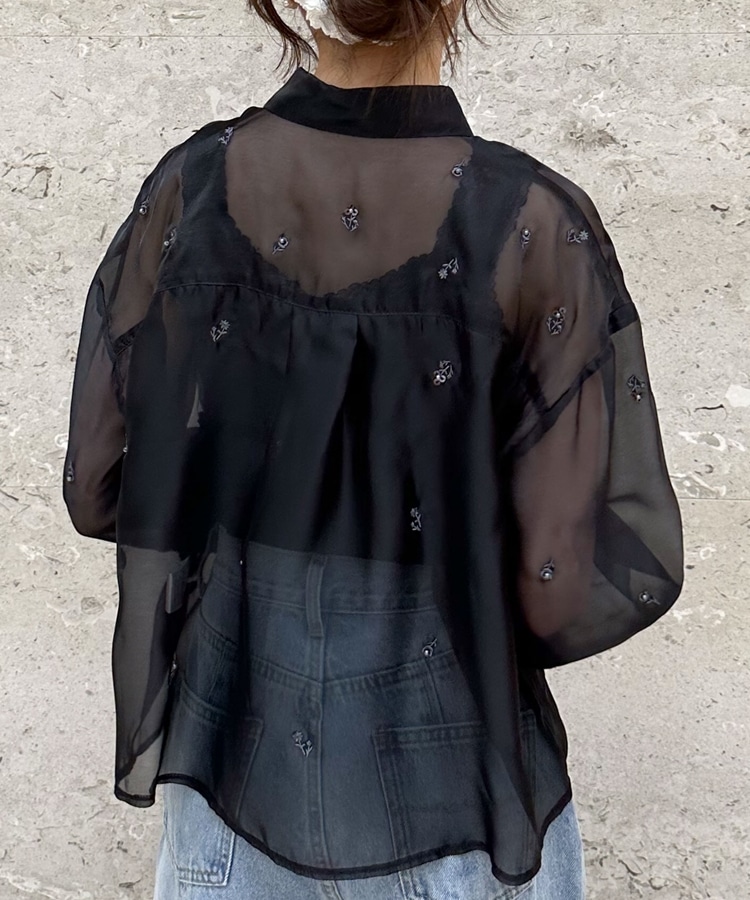 ビーズ花柄刺繍シアーショートシャツ