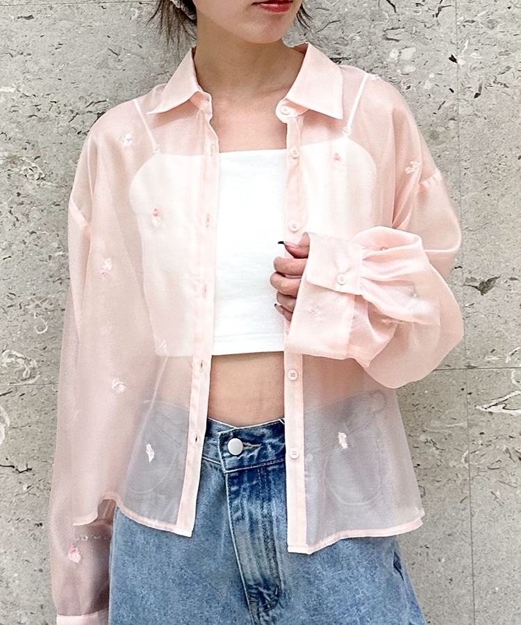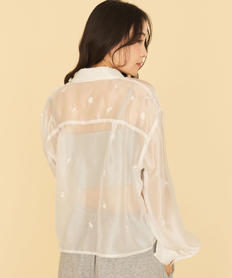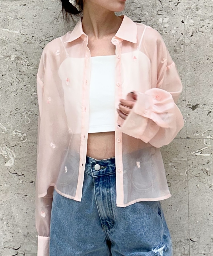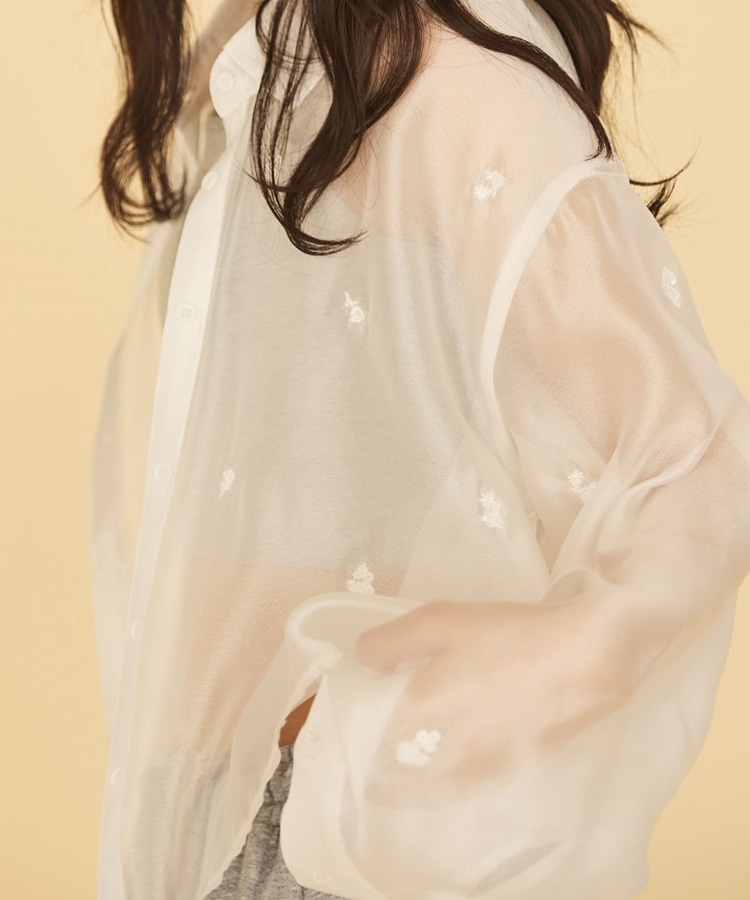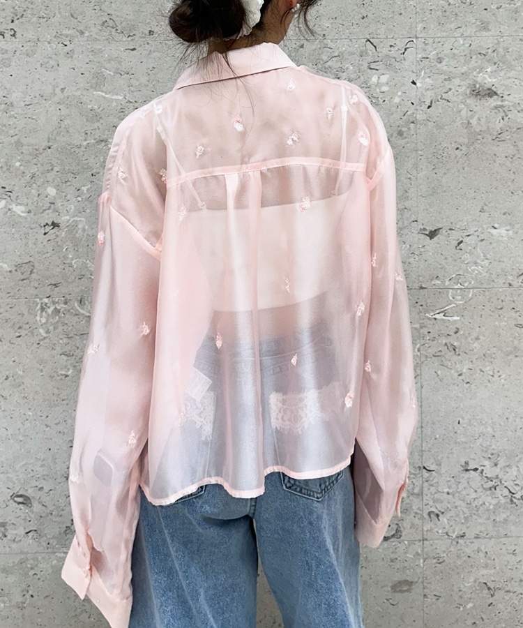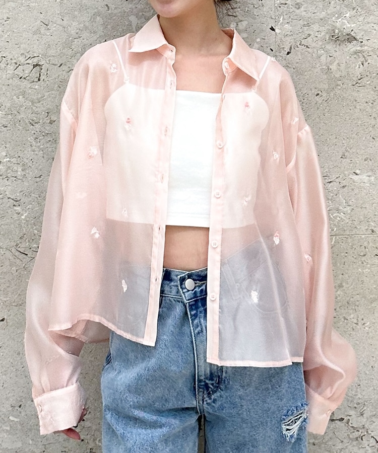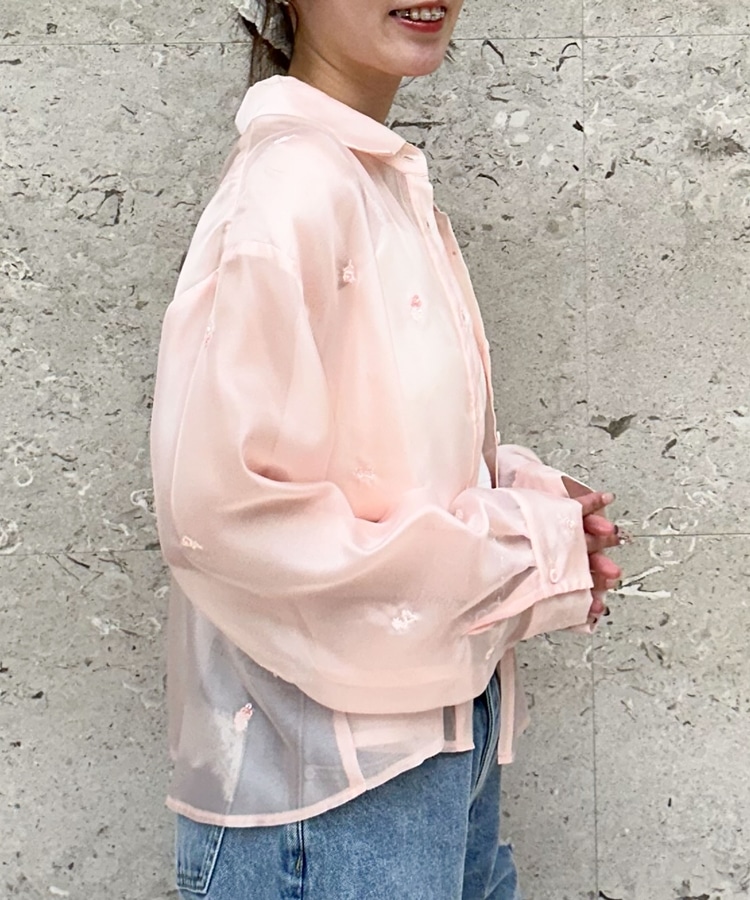 ビーズ花柄刺繍シアーショートシャツ