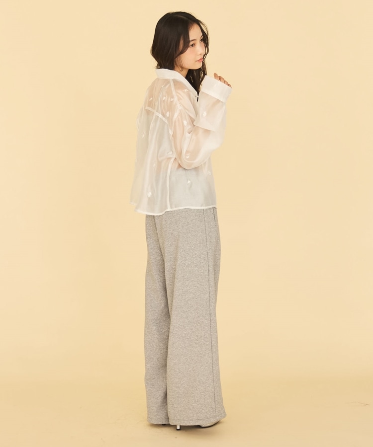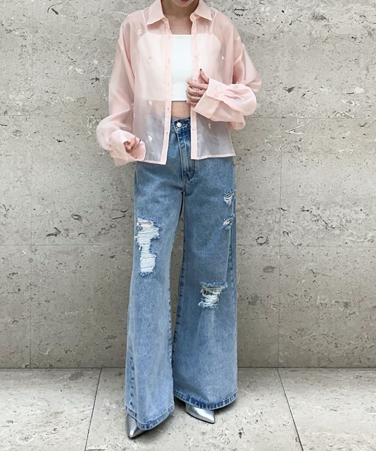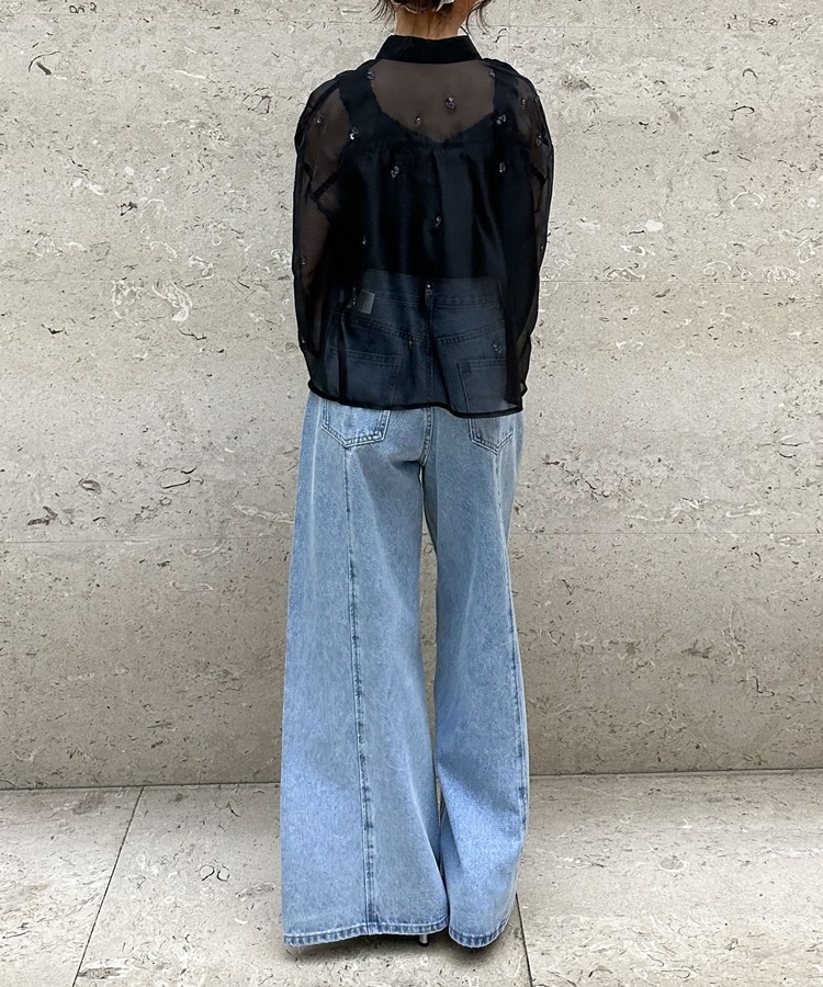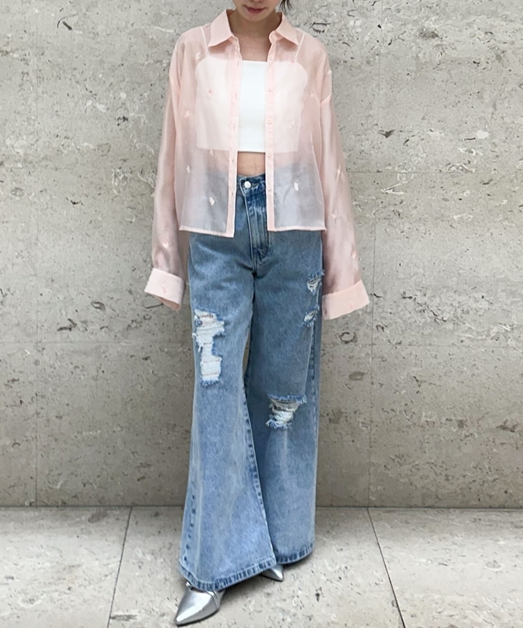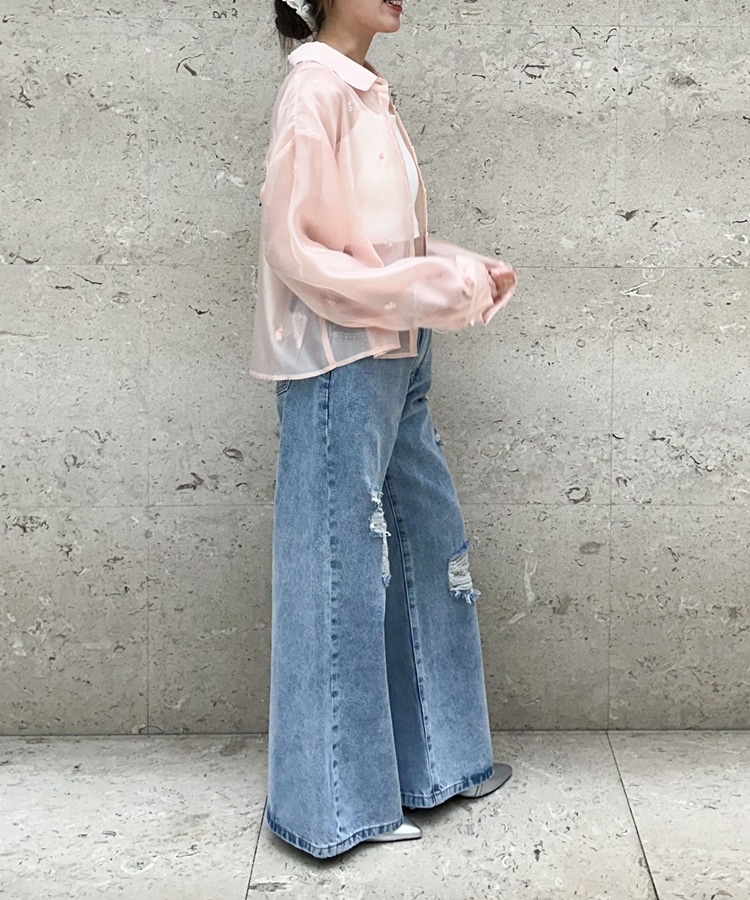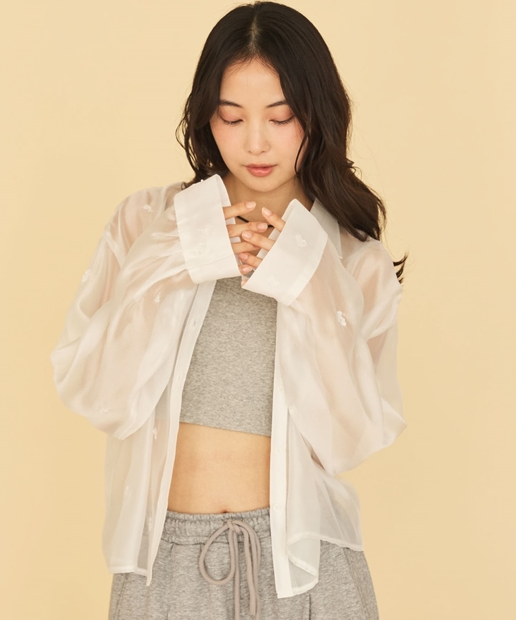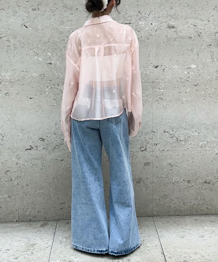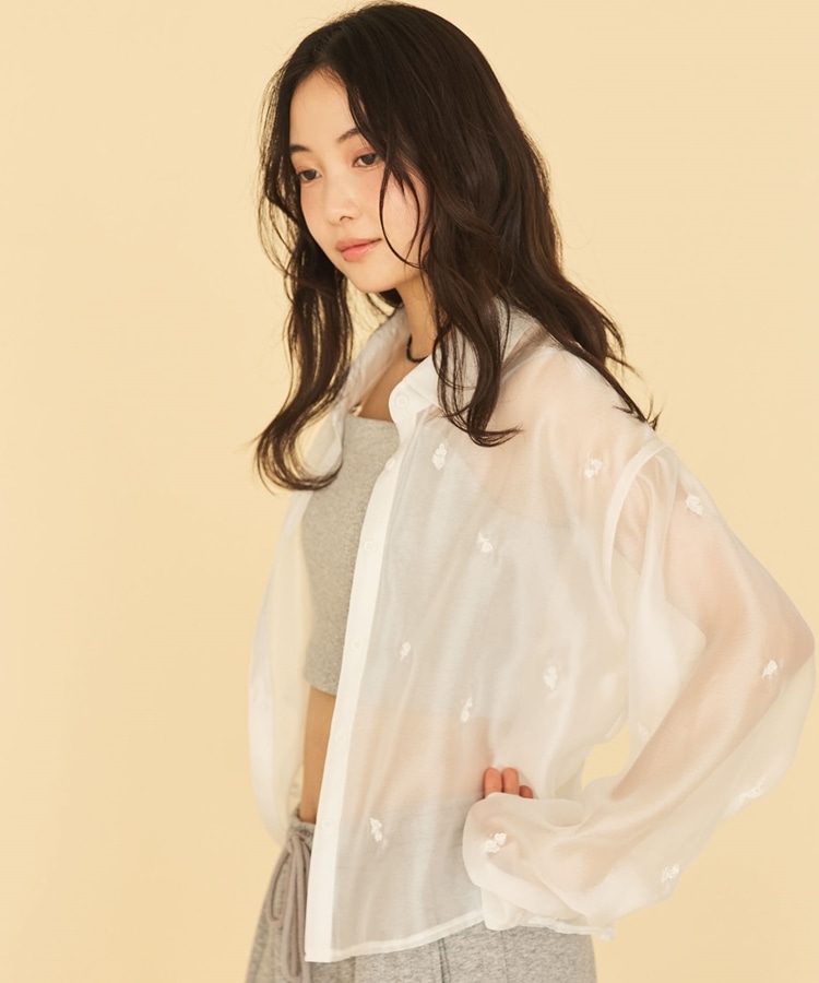 ビーズ花柄刺繍シアーショートシャツ