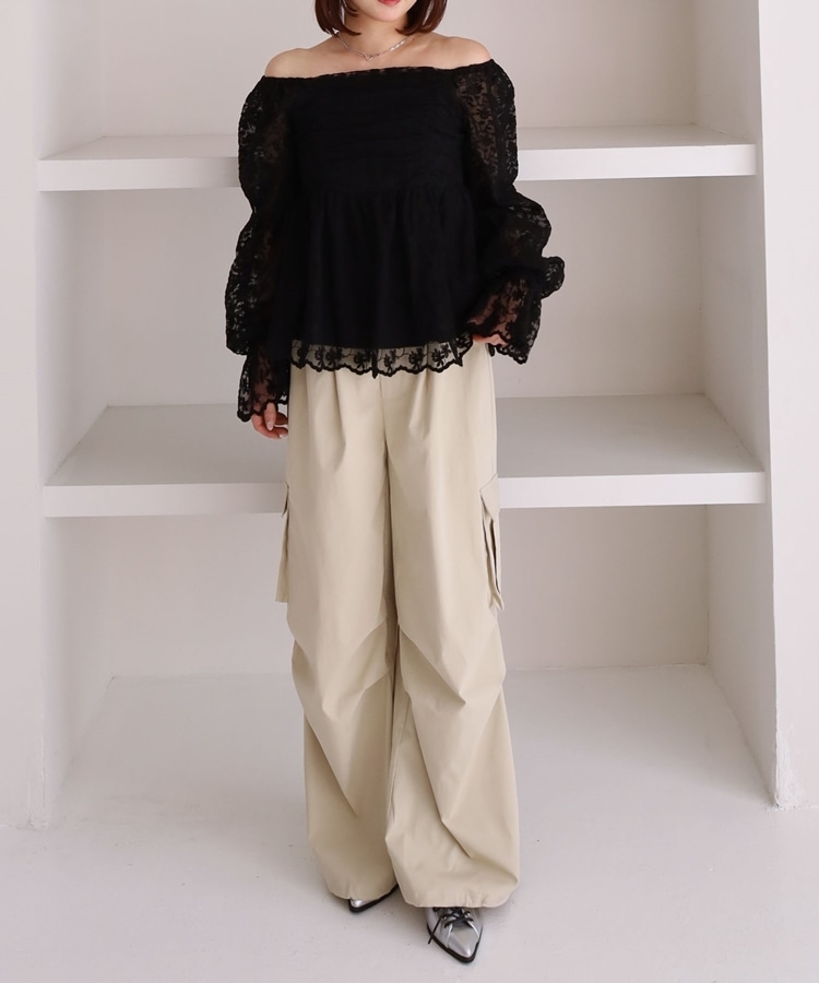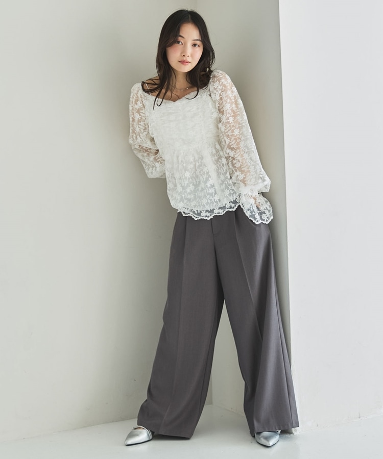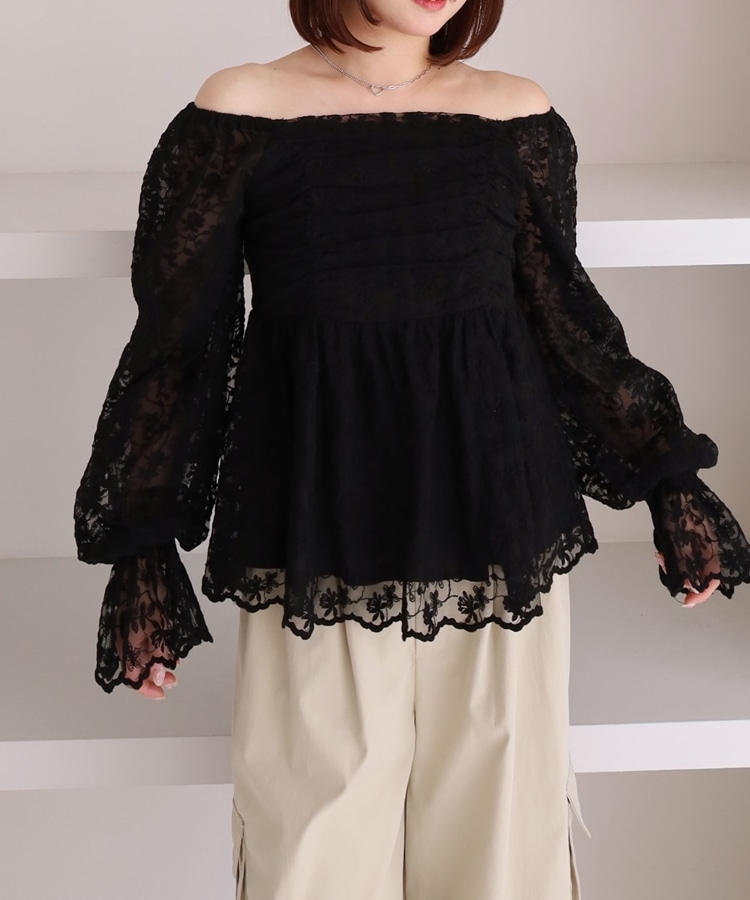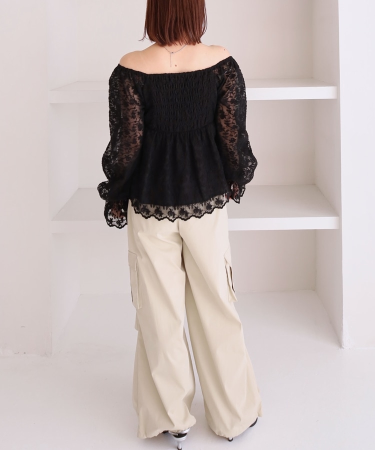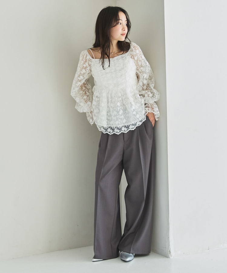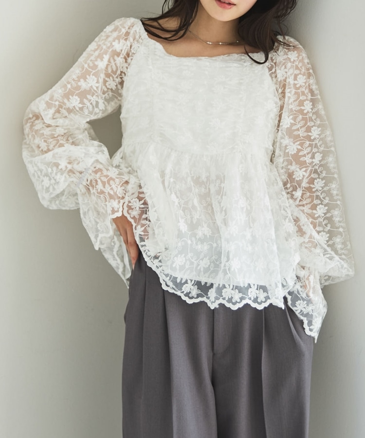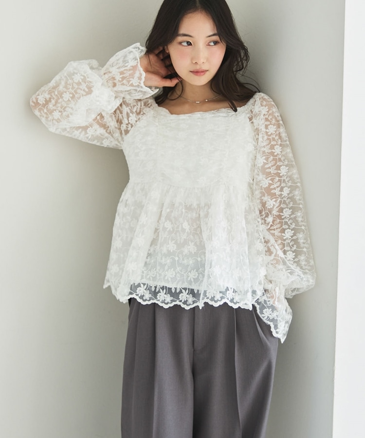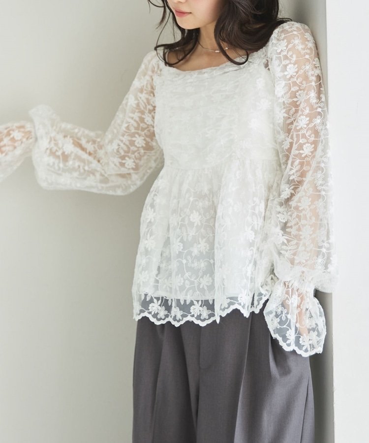 ■刺繍レースのトレンドブラウス■【デザイン】・刺繍レースにシアー素材で春のトレンドを一気に味わえるデザイン・オフショルでも着こなせる広めな襟元でスッキリ見え・長すぎない丈感でインでもアウトでも着こなせます♪・襟と袖にもゴムが入っていて、細部まで可愛く着られます【素材感】・透け感のある刺繍レースの生地で甘すぎないデザイン・綿混素材で長く着られる素材感です・袖も別布付きで上品な透け感です。ーーーーーーーーーーーーーー透け感:あり裏地:あり伸縮性:えり、袖あり光沢感:なし生地厚さ:普通洗濯方法:手洗い可能※詳しいお手入れ方法は商品についているタグをご覧くださいーーーーーーーーーーーーーーー※ご利用のモニター環境により、実際の色味と多少異なる場合がございます。【スタイリング】・スラックスに合わせてキレイめコーデに・デニムやスウェットとのMIXコーデがおすすめ▼スタッフ別の詳しい着こなしは下のCOORDINATEをチェック