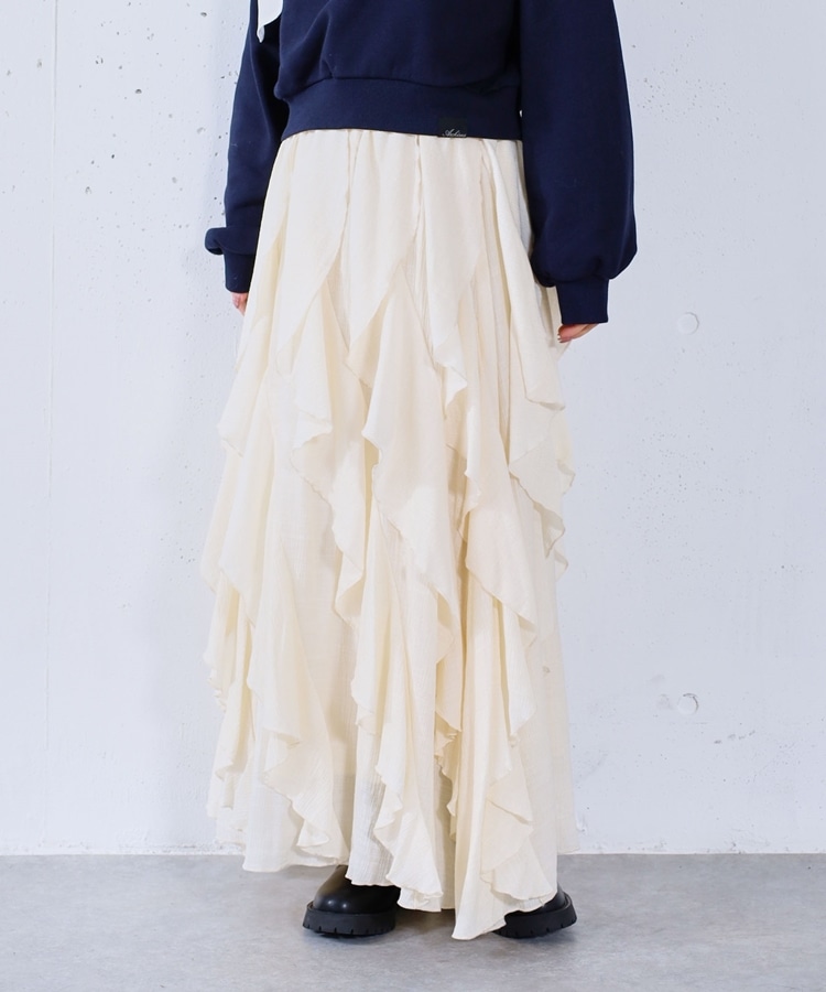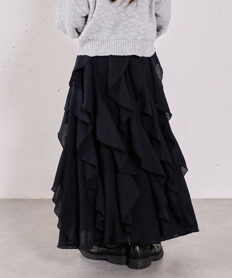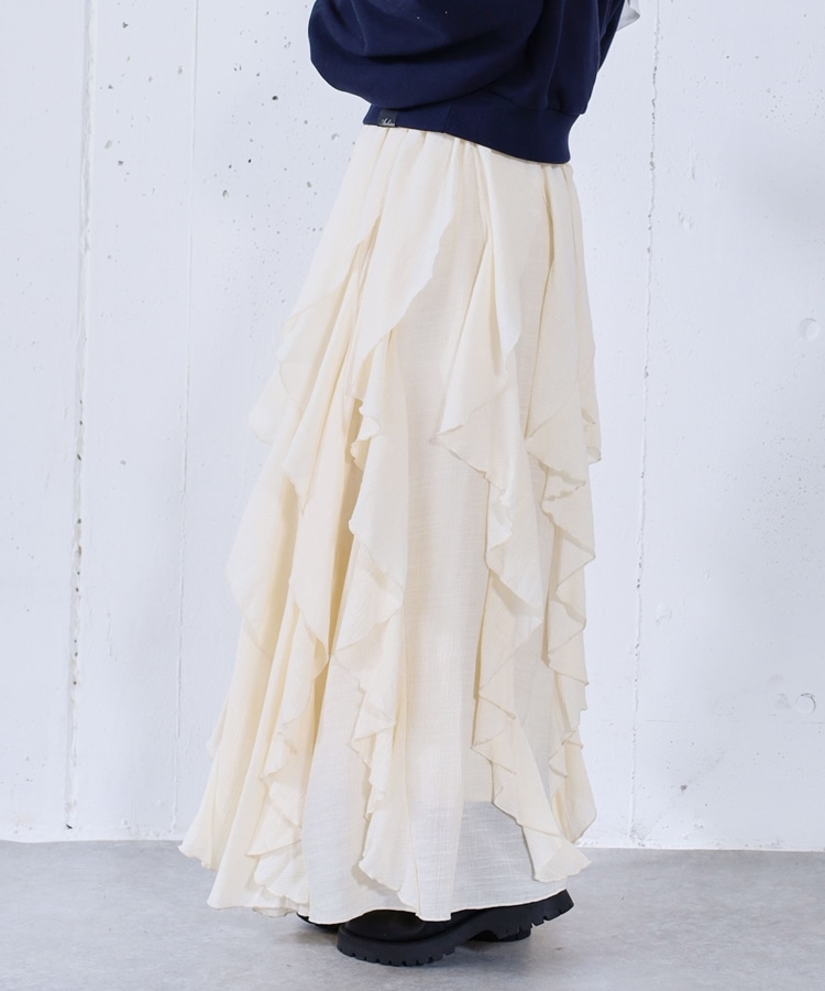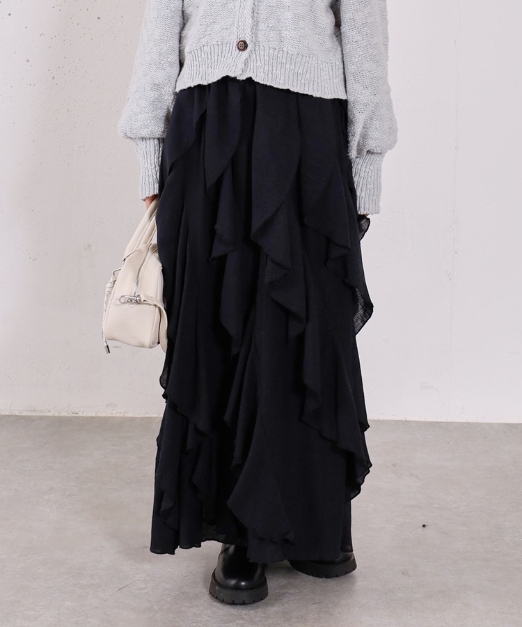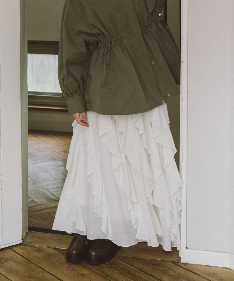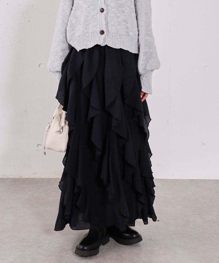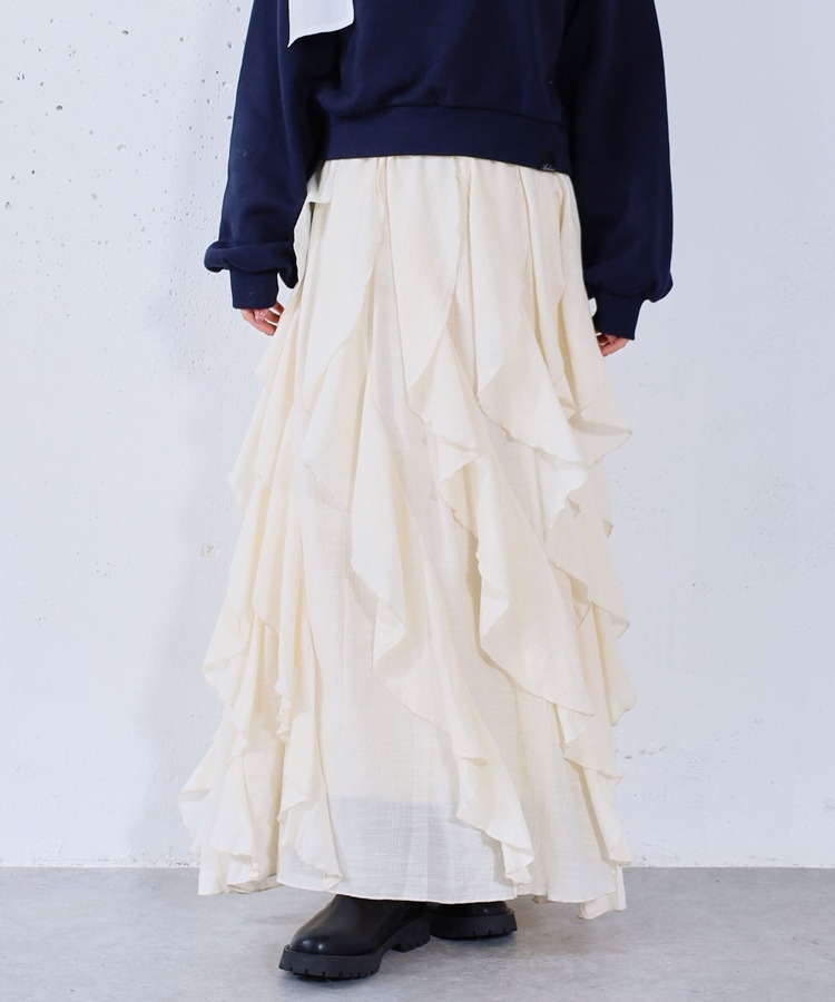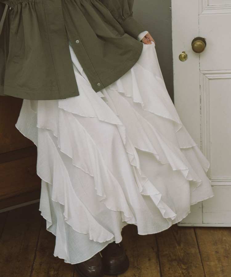 ■一味違ったボリュームデザインスカート■【デザイン】・何重にも重なったボリュームラッフル・動くたびに揺れるので春気分も上昇・ボリュームを出しつつも広がらない作り・ウエストはゴム仕様で、ストレスフリーで履いていただけます・カラー展開は使いやすい3色展開【素材感】・レーヨン混で広がりが少なく落ち感のある素材・表面感のある生地で、カジュアルな印象で穿いていただけますーーーーーーーーーーーーーーー透け感:なし裏地:あり伸縮性:あり光沢感:なし生地厚さ:普通洗濯方法:手洗い推奨※詳しいお手入れ方法は商品についているタグをご覧くださいーーーーーーーーーーーーーーー※ご利用のモニター環境により、実際の色味と多少異なる場合がございます。【スタイリング】・ボリュームのあるスカートはコンパクトなトップスと相性◎・今季おすすめブルゾンとスタイリングが一押し・スウェットなどでラフに合わせるのもおすすめ▼スタッフ別の詳しい着こなしは下のCOORDINATEをチェック