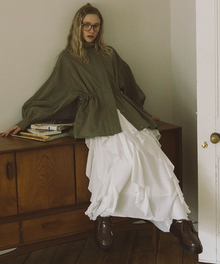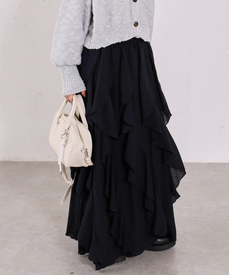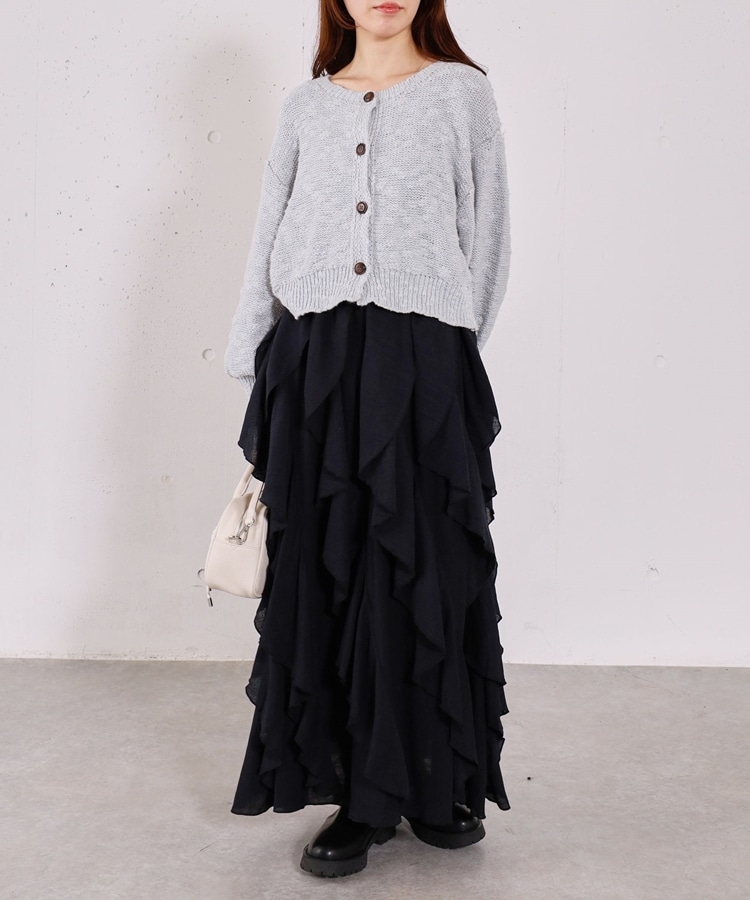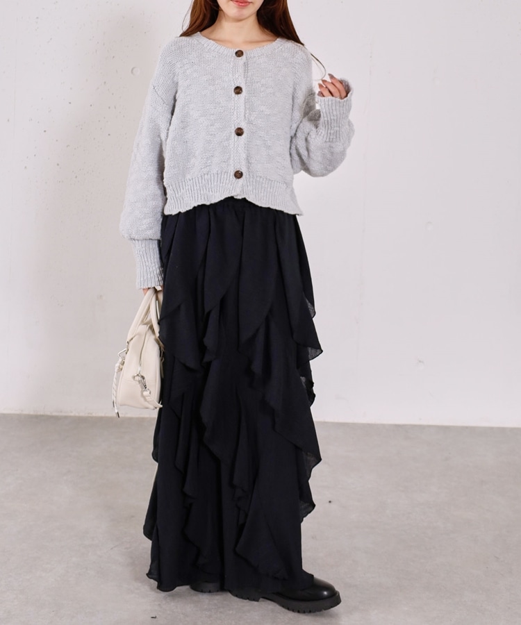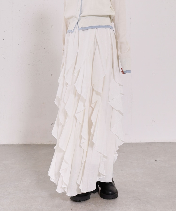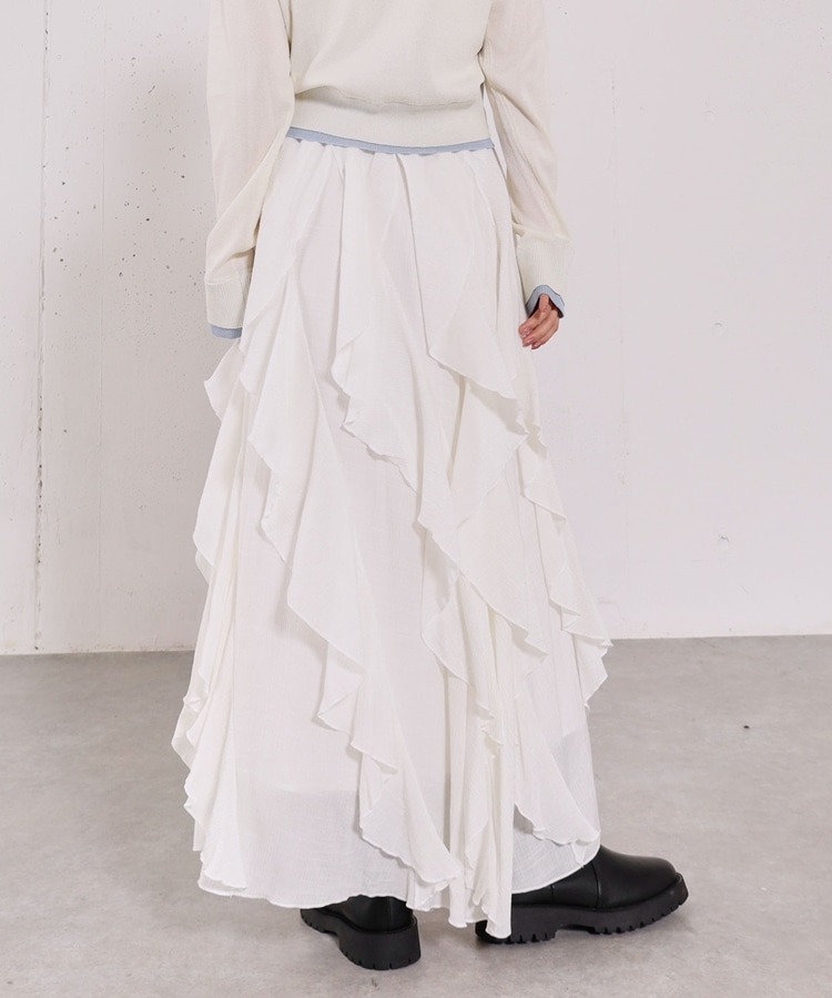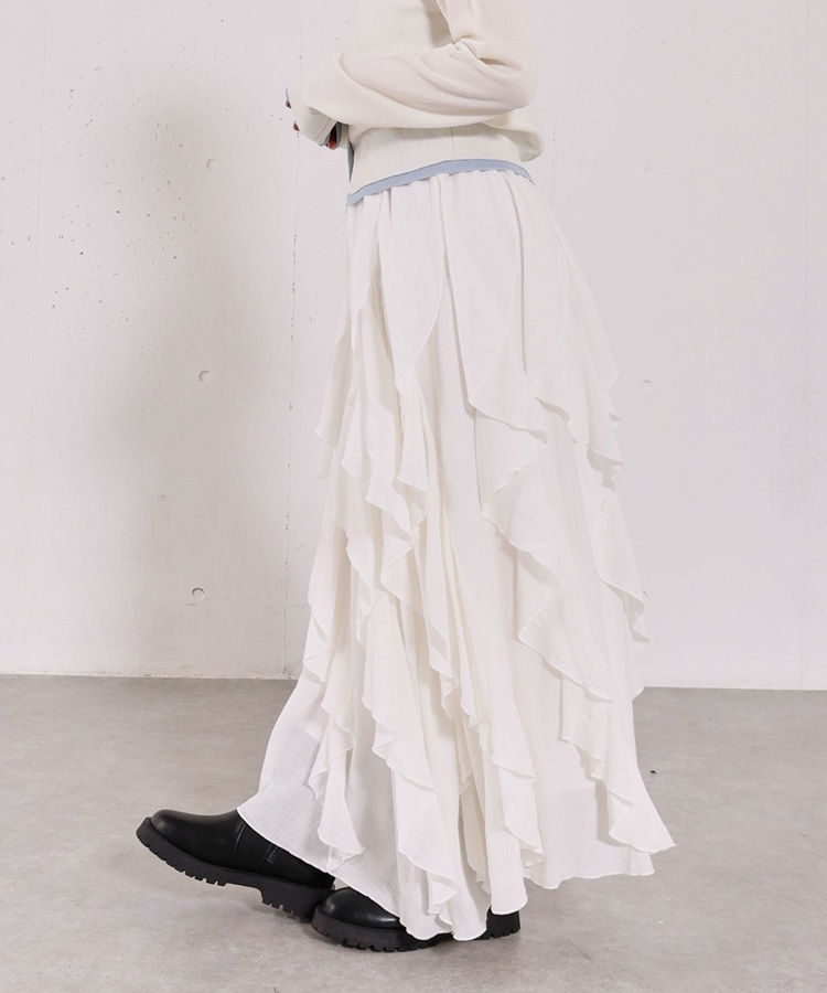 ■一味違ったボリュームデザインスカート■【デザイン】・何重にも重なったボリュームラッフル・動くたびに揺れるので春気分も上昇・ボリュームを出しつつも広がらない作り・ウエストはゴム仕様で、ストレスフリーで履いていただけます・カラー展開は使いやすい3色展開【素材感】・レーヨン混で広がりが少なく落ち感のある素材・表面感のある生地で、カジュアルな印象で穿いていただけますーーーーーーーーーーーーーーー透け感:なし裏地:あり伸縮性:あり光沢感:なし生地厚さ:普通洗濯方法:手洗い推奨※詳しいお手入れ方法は商品についているタグをご覧くださいーーーーーーーーーーーーーーー※ご利用のモニター環境により、実際の色味と多少異なる場合がございます。【スタイリング】・ボリュームのあるスカートはコンパクトなトップスと相性◎・今季おすすめブルゾンとスタイリングが一押し・スウェットなどでラフに合わせるのもおすすめ▼スタッフ別の詳しい着こなしは下のCOORDINATEをチェック