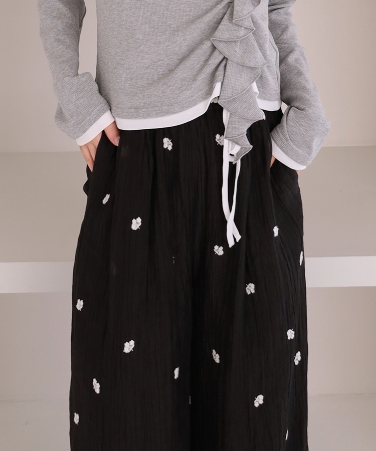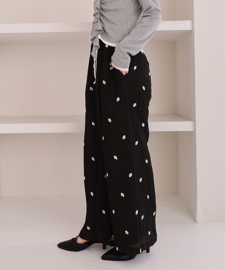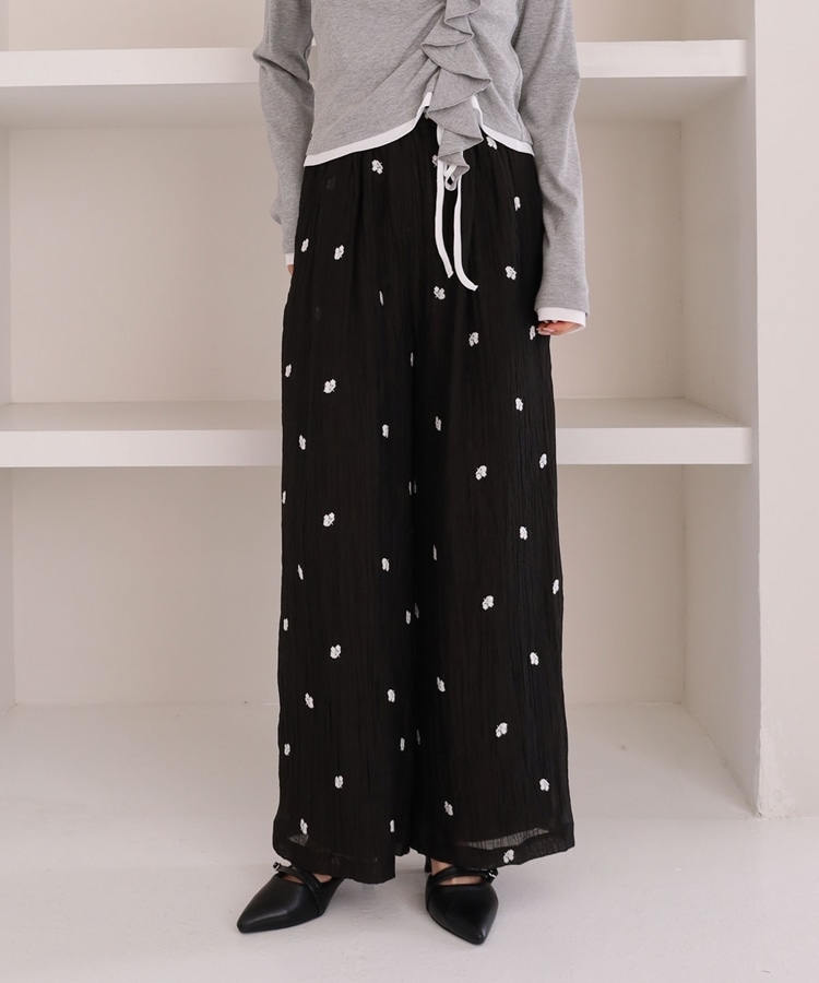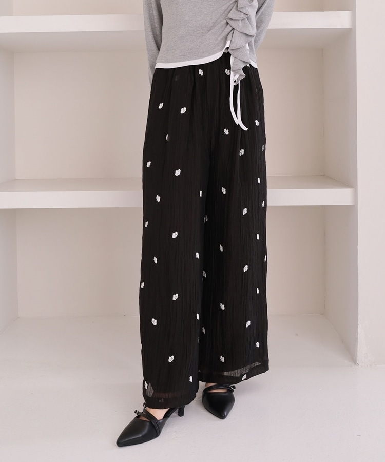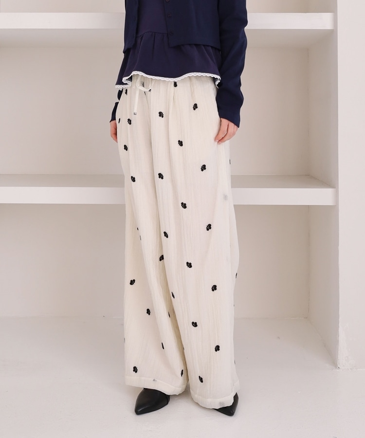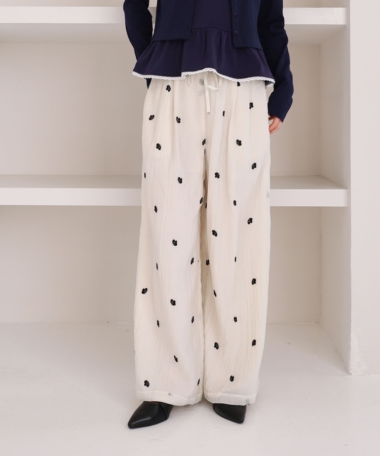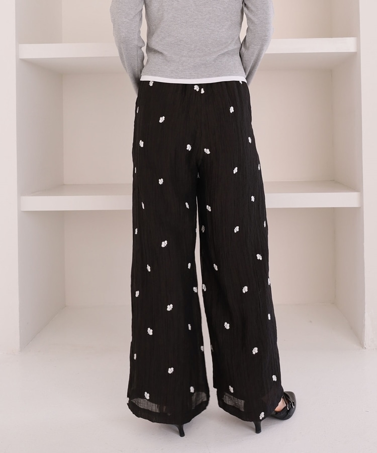 ■ナチュラルに華やぐ、花柄刺繍イージーワイドパンツ■
