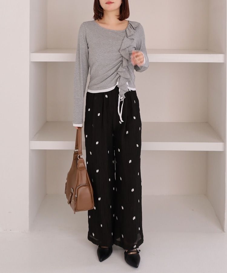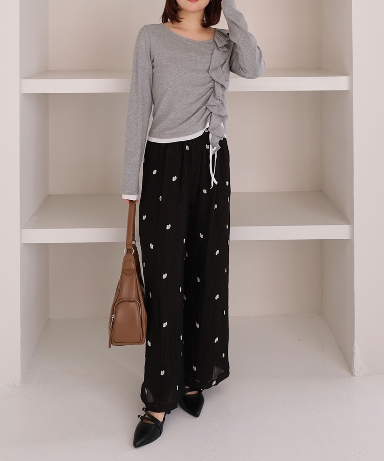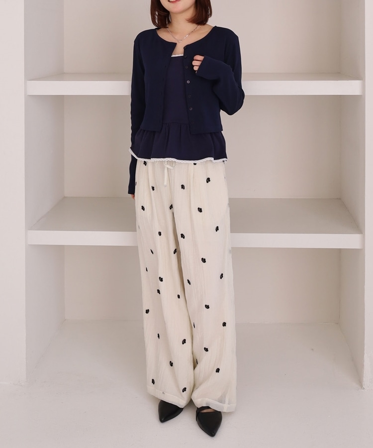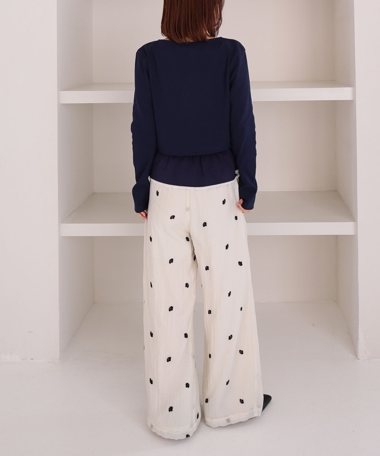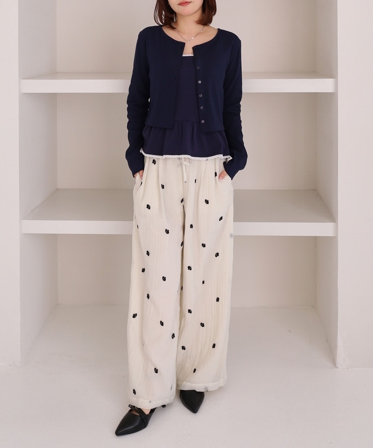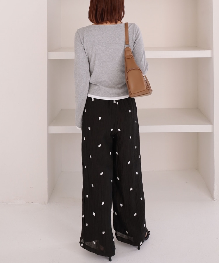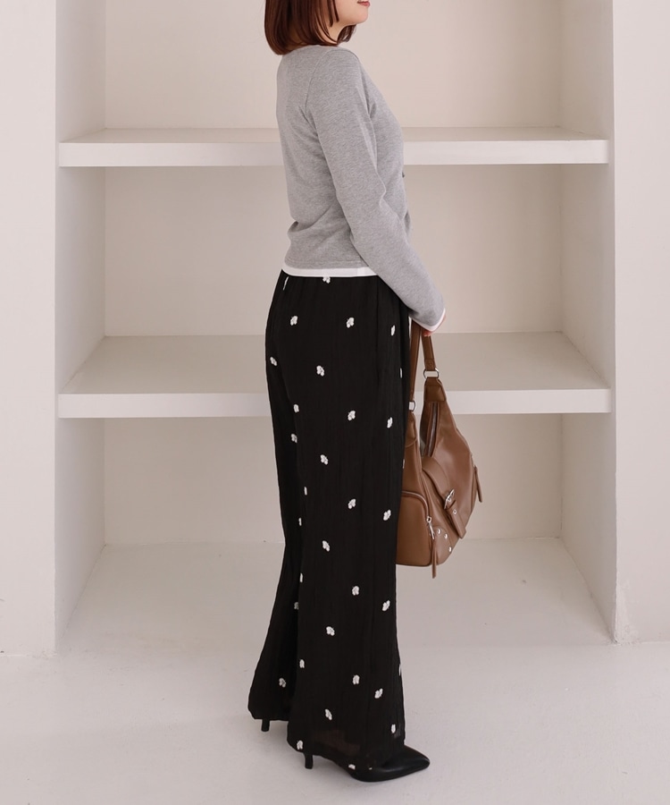 ■ナチュラルに華やぐ、花柄刺繍イージーワイドパンツ■