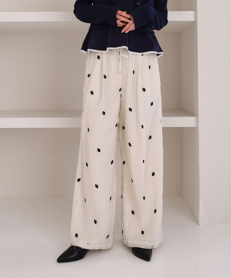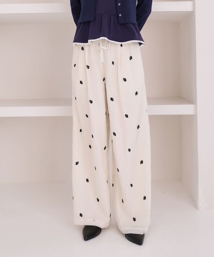 ・ナチュラルな花柄刺繍が目を引く、イージーパンツ