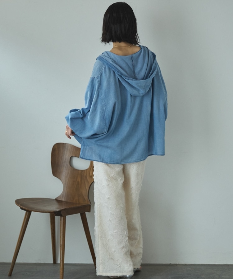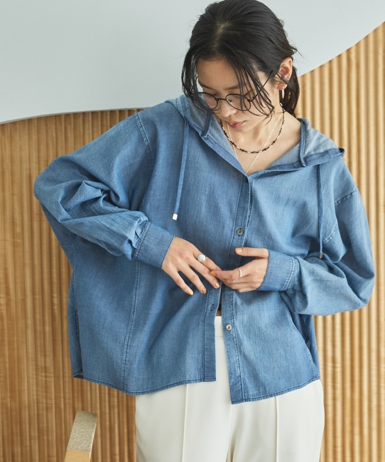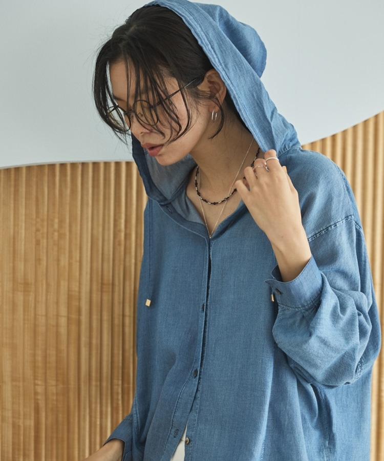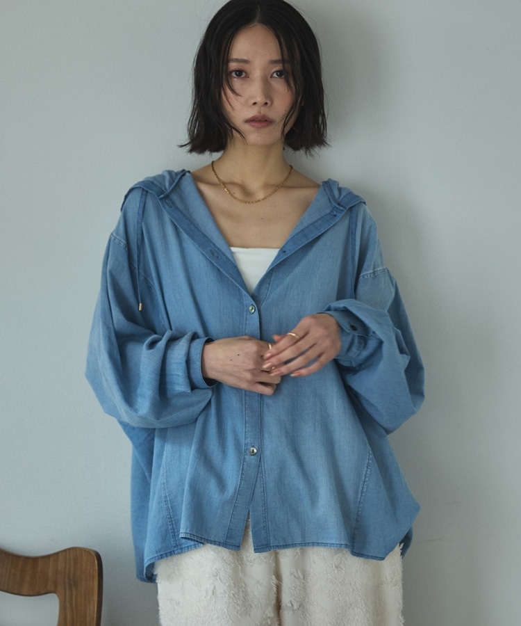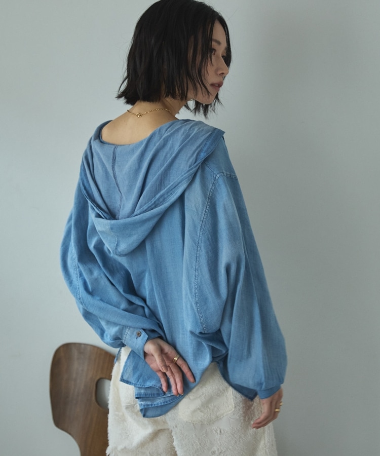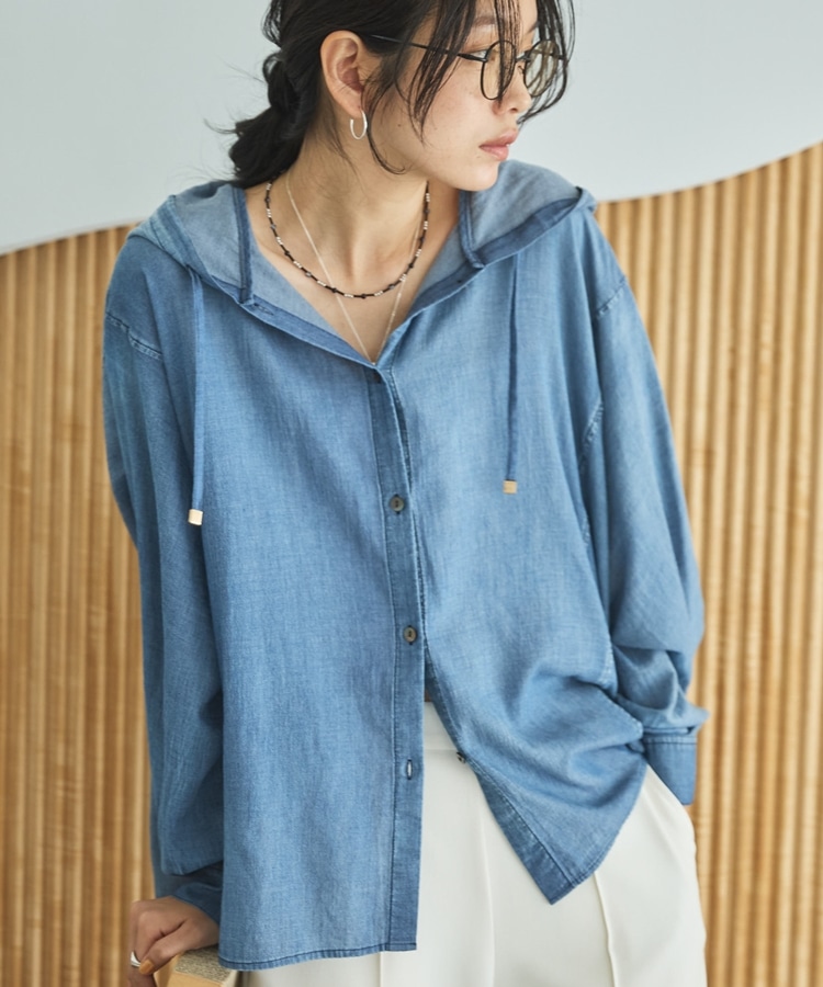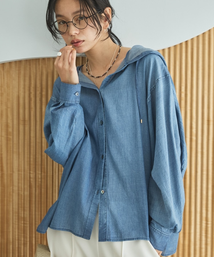 シアーデニムシャツをフーディー仕様にしてトレンド感アップ