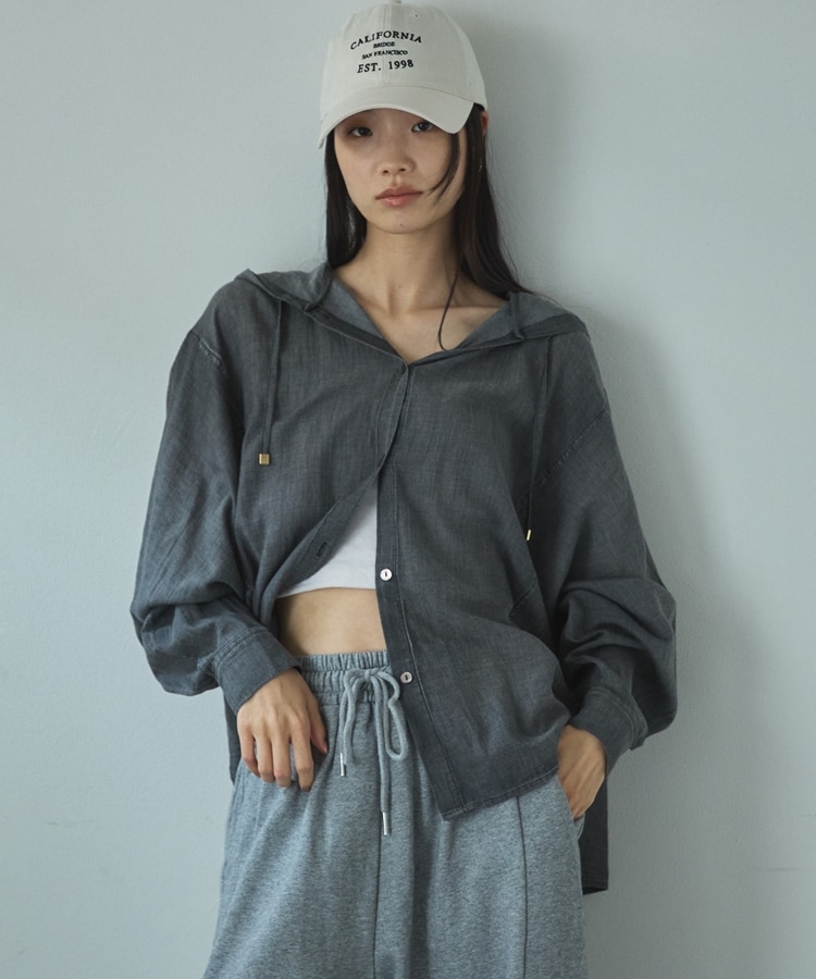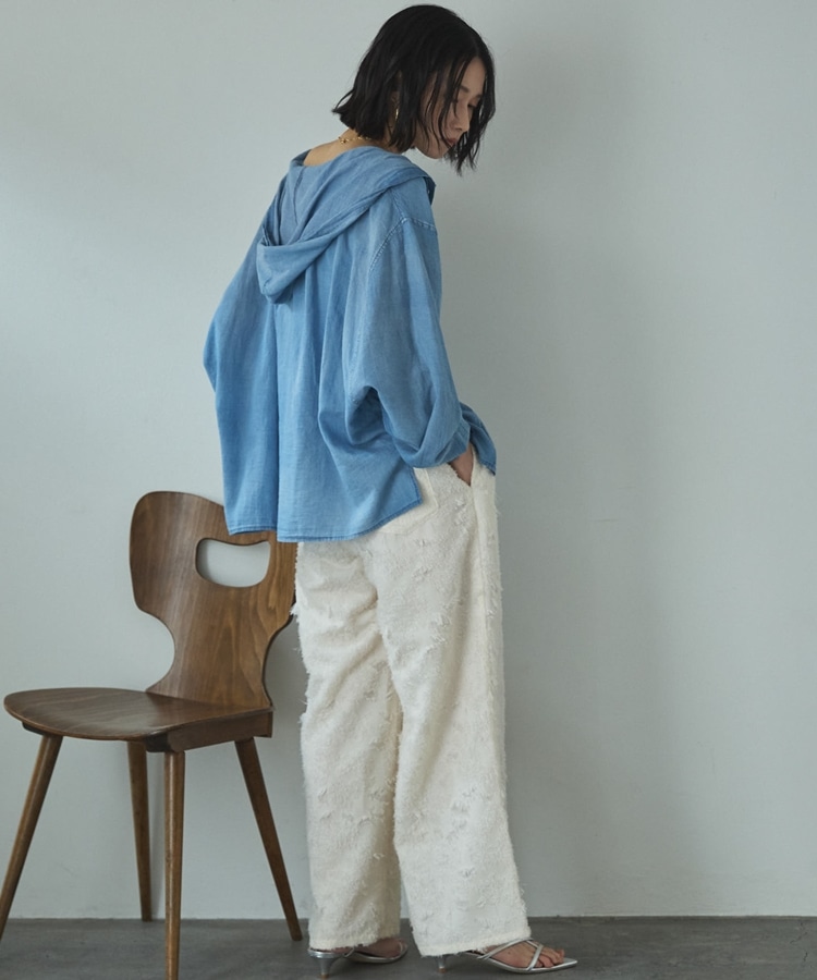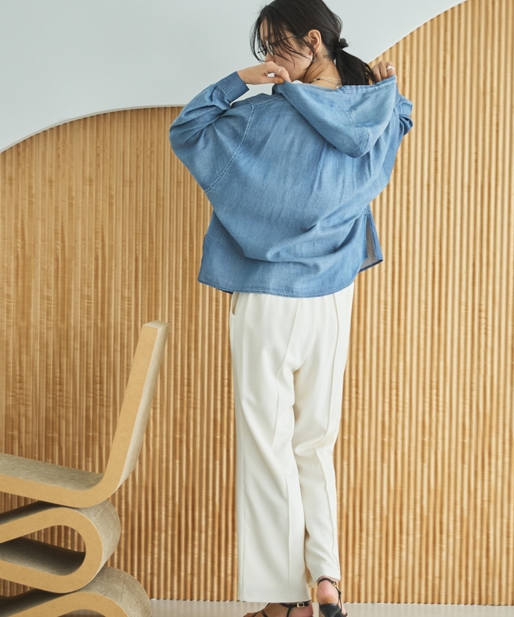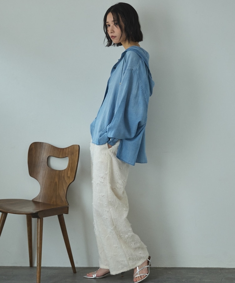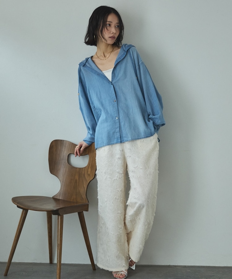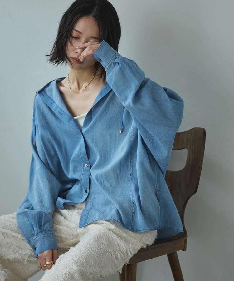 シアーデニムシャツをフーディー仕様にしてトレンド感アップ
