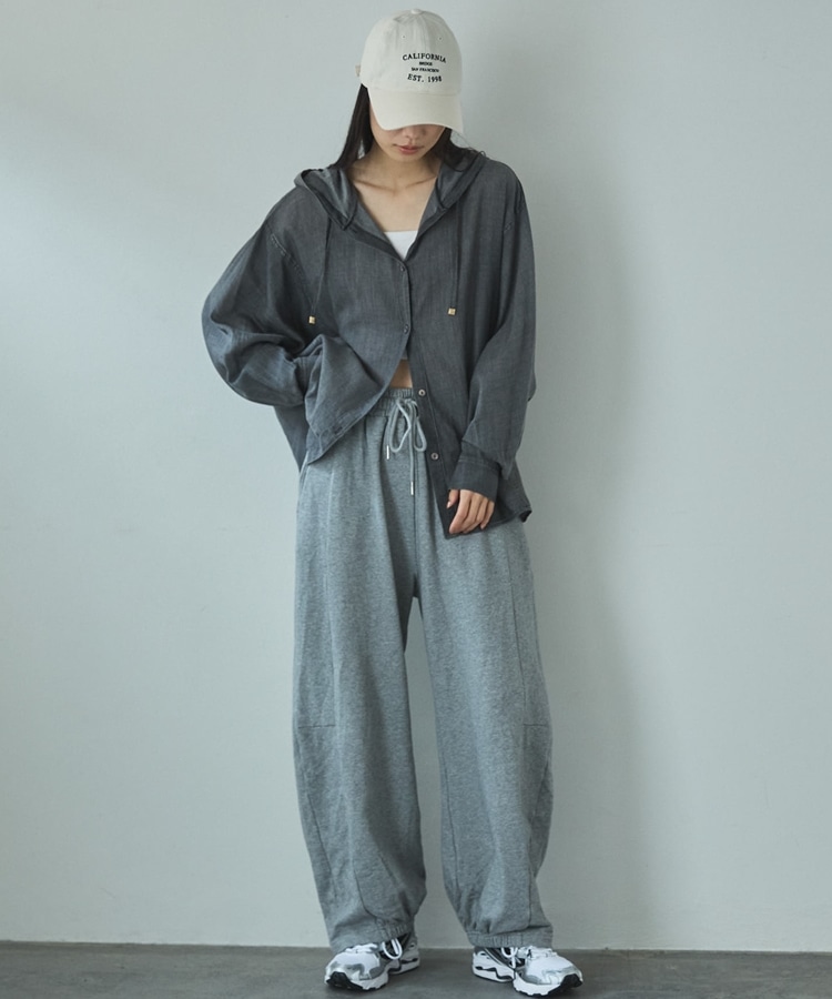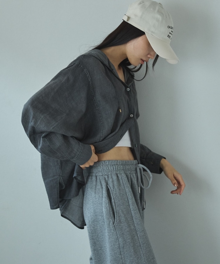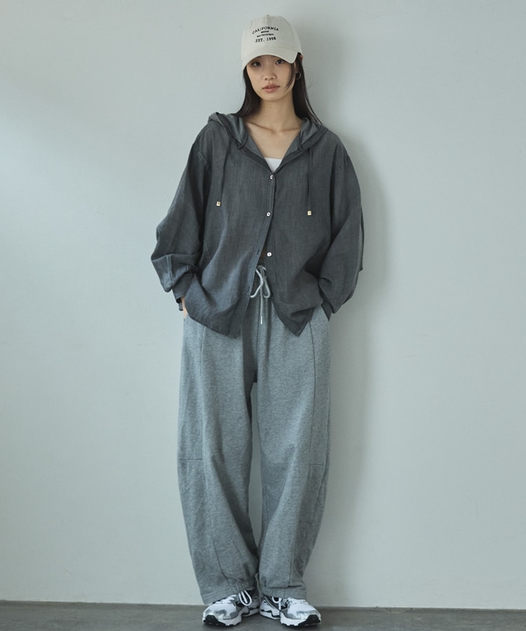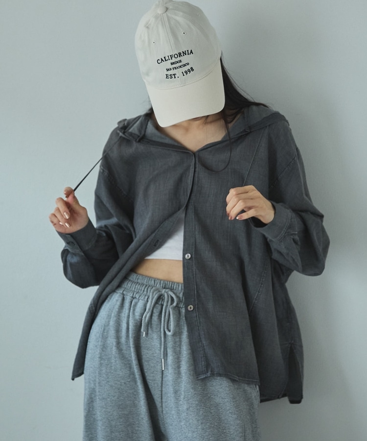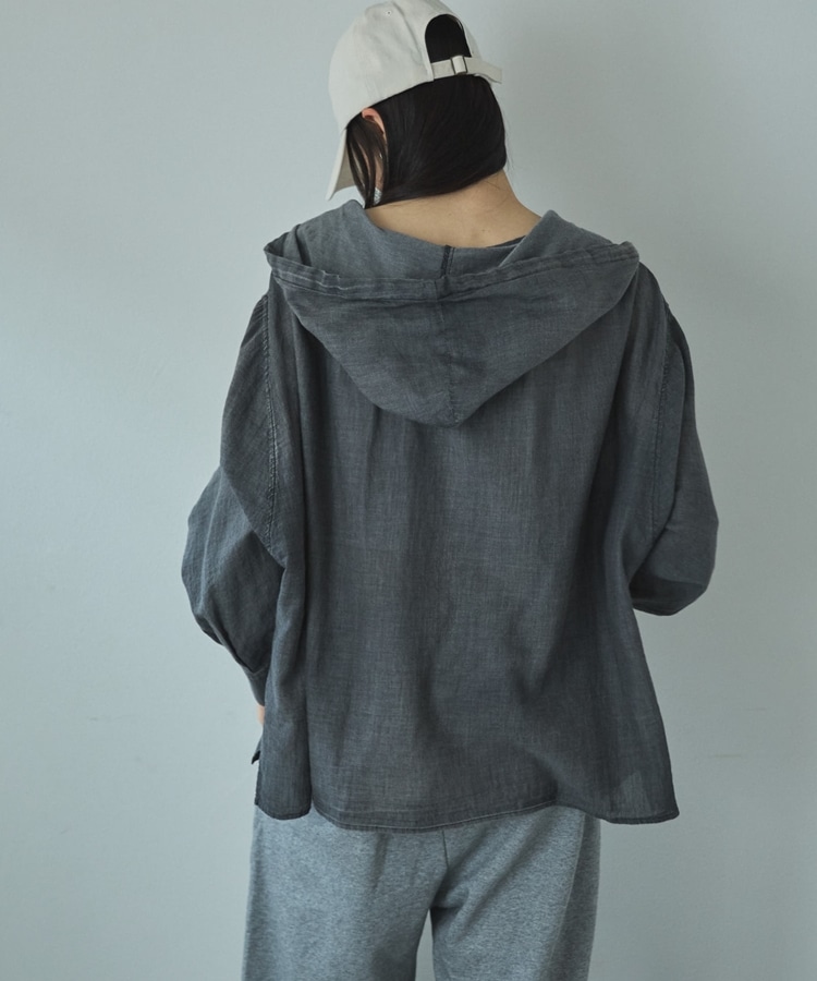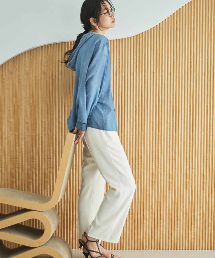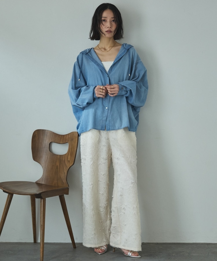 シアーデニムシャツをフーディー仕様にしてトレンド感アップ
