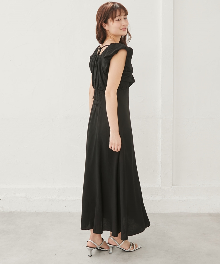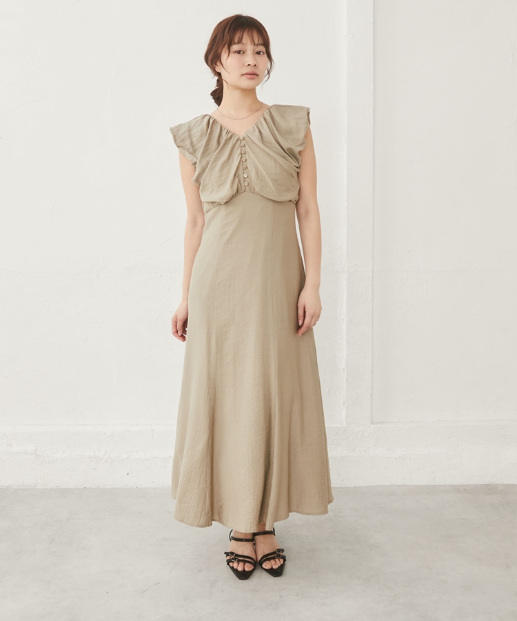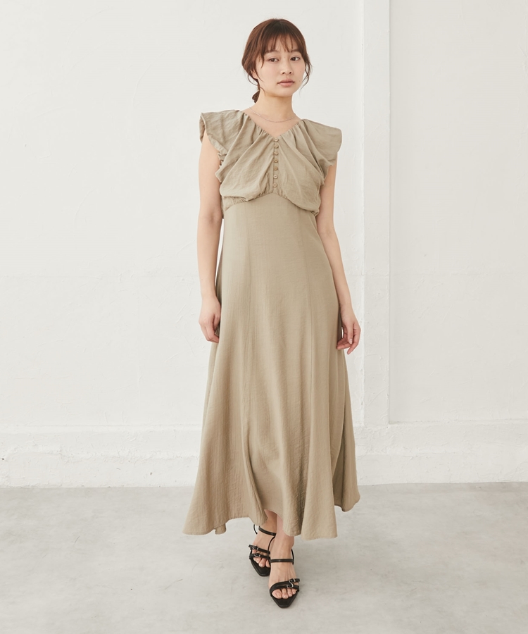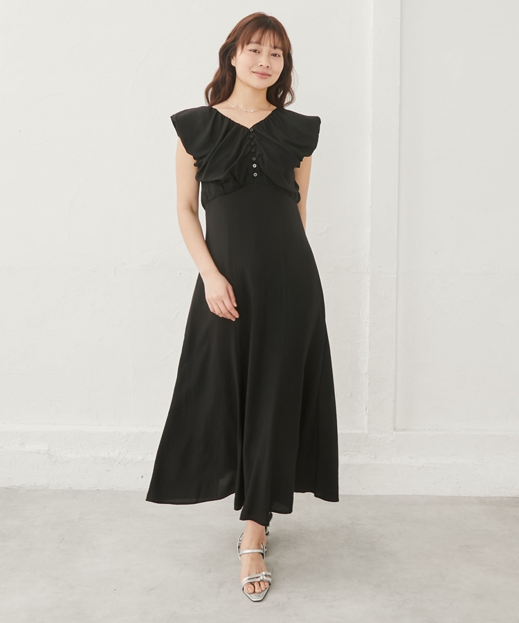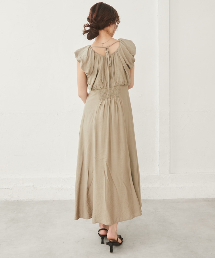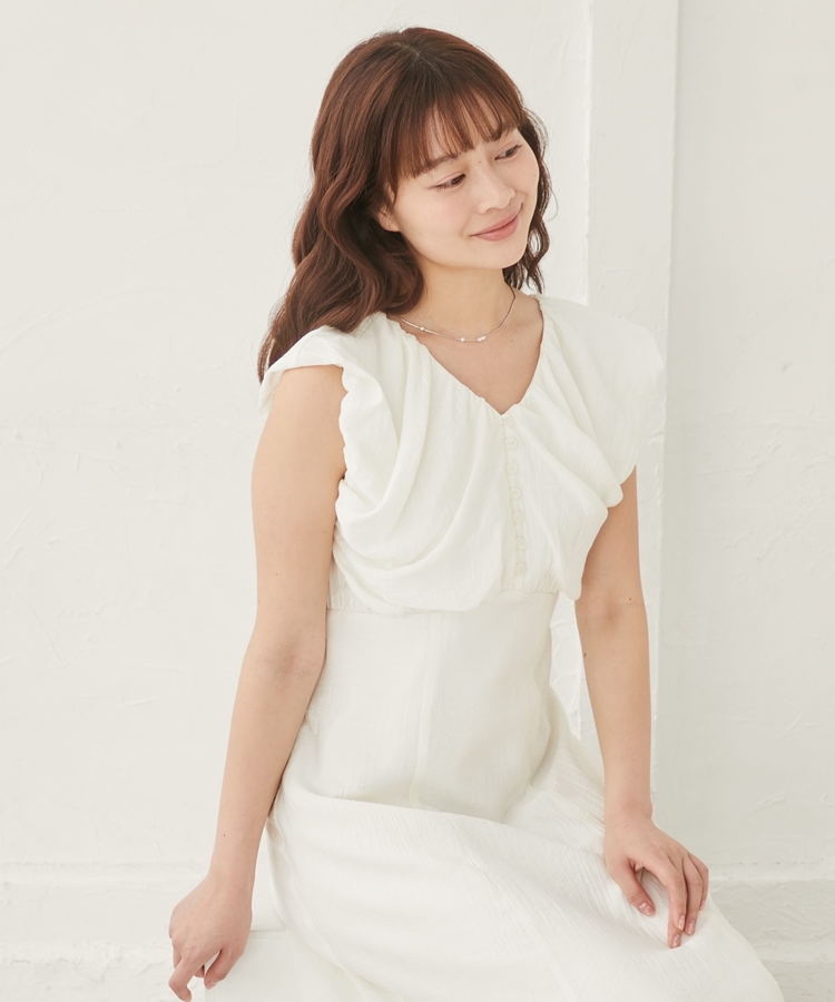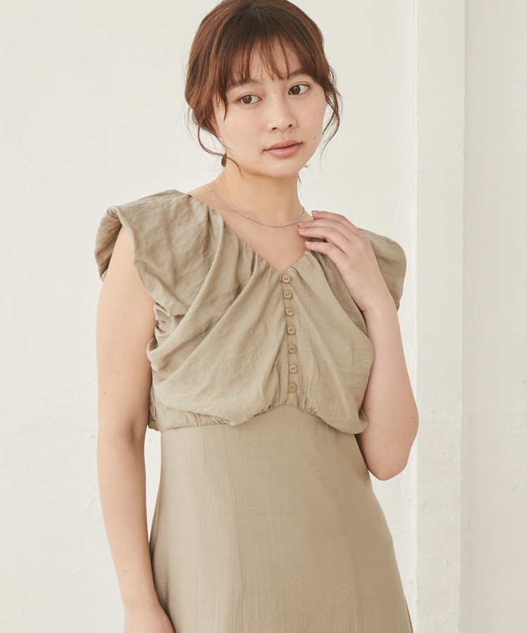 ■バルーンデザインが華やかさと大人っぽさを引き出す。ノースリーブワンピース■【デザイン】・ふんわりとしたボリューム感が目を惹く、立体感のあるバルーンデザイン・胸元のギャザーとフロントボタンがクラシックな印象をプラス・顔周りをすっきりと見せる、程良い開きのVネックデザイン・高めのウエスト切り替えでスタイルアップ効果抜群◎・ウエスト周りはタイトすぎず、裾に向かって緩やかに広がるナローシルエット【素材感】・肌なじみの良いさらりとした質感で、夏場でも快適な着心地・動くたびにしなやかに揺れる落ち感のある素材・裏地付きで透けにくく、1枚でさらりと着れる質感ーーーーーーーーーーーーーーー透け感:なし裏地:あり伸縮性:なし光沢感:なし生地厚さ:普通洗濯方法:手洗い可※詳しいお手入れ方法は商品についているタグをご覧くださいーーーーーーーーーーーーーーー※ご利用のモニター環境により、実際の色味と多少異なる場合がございます。【スタイリング】・華奢なサンダルやパンプスと合わせてドレッシーな雰囲気に・カーディガンやジャケットを肩掛けすれば、ディナーシーンにも最適・スニーカーで外した、カジュアルダウンスタイルも♪▼スタッフ別の詳しい着こなしは下の COORDINATE をチェック