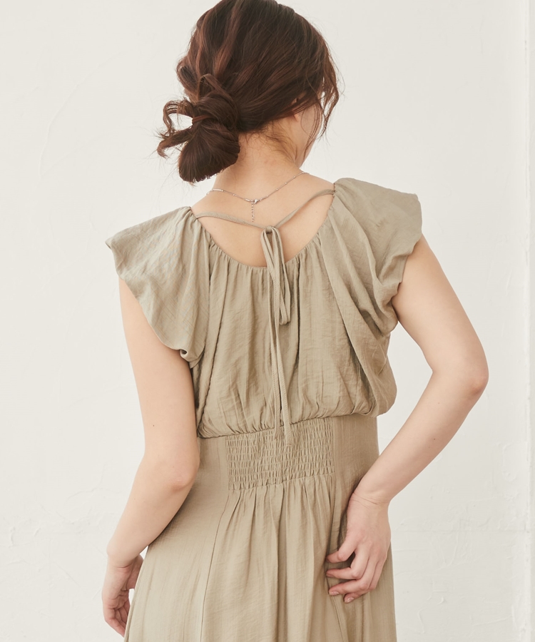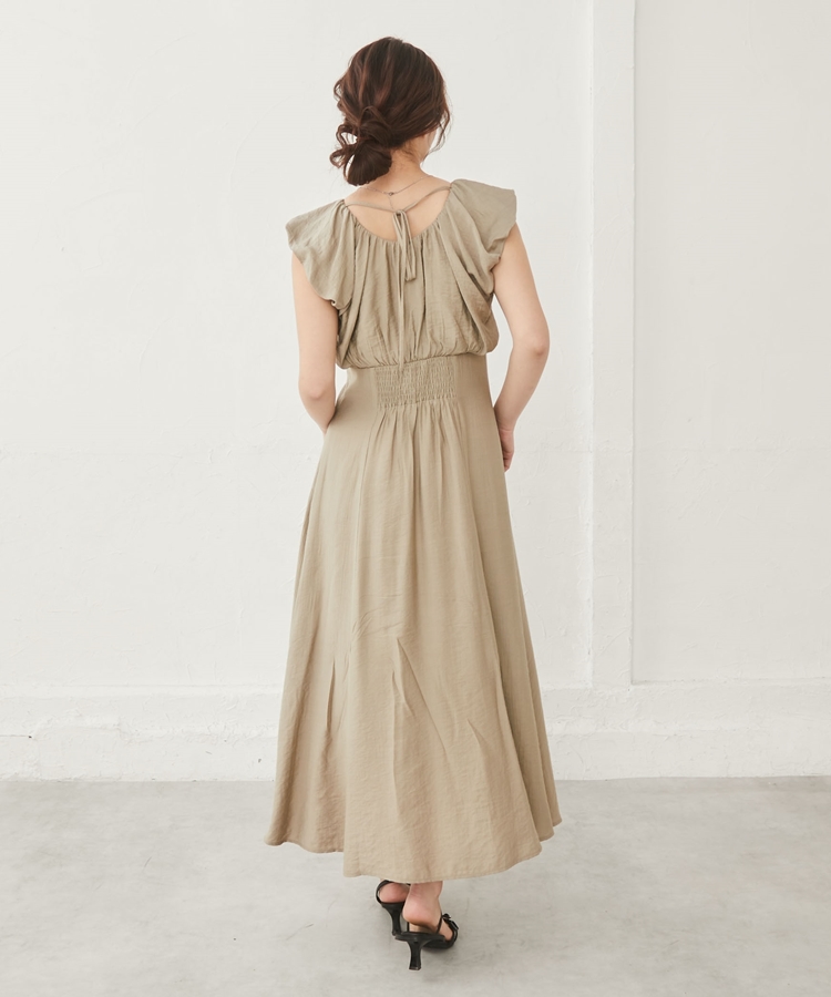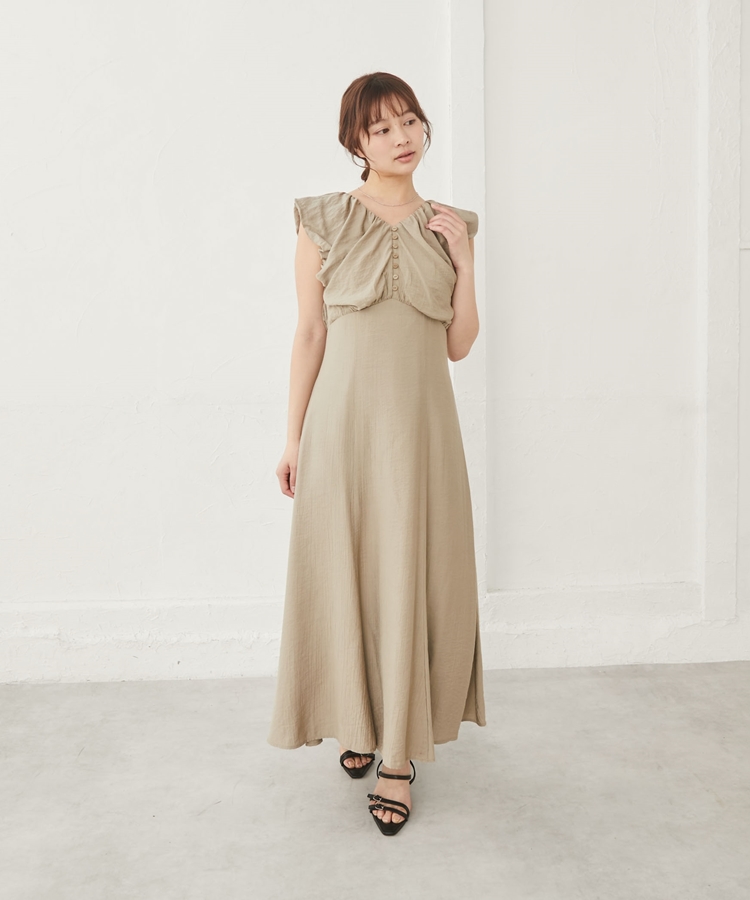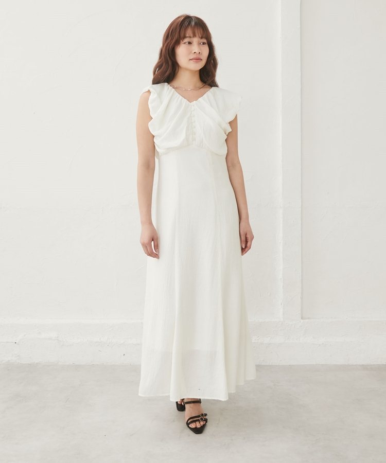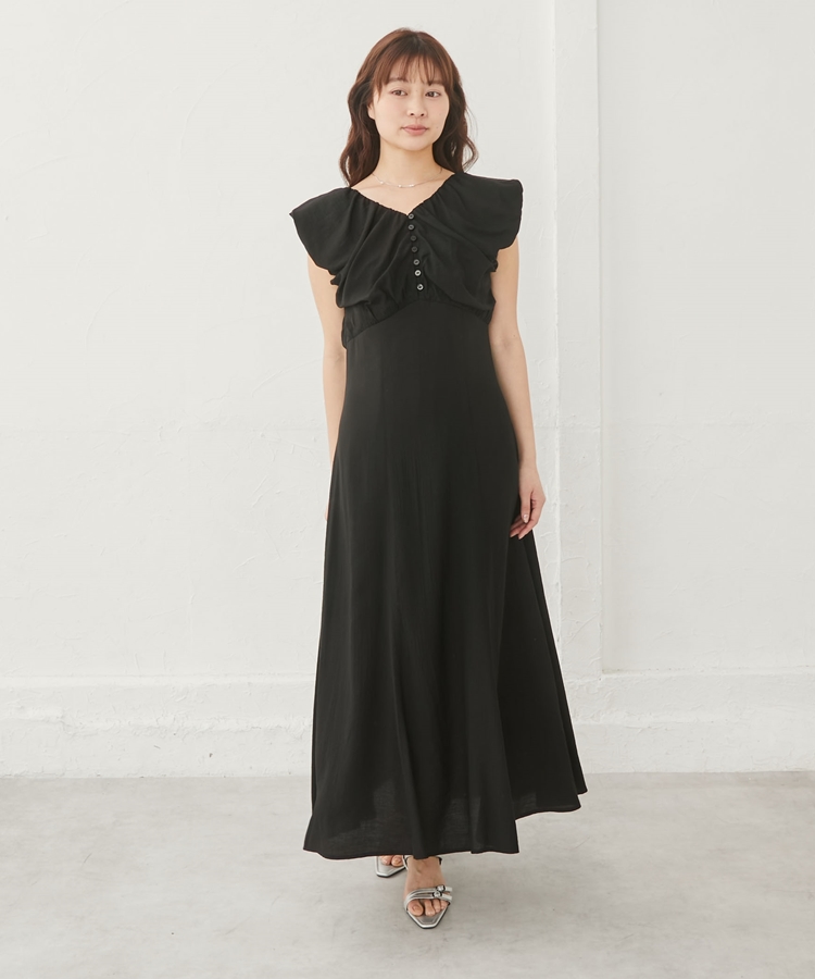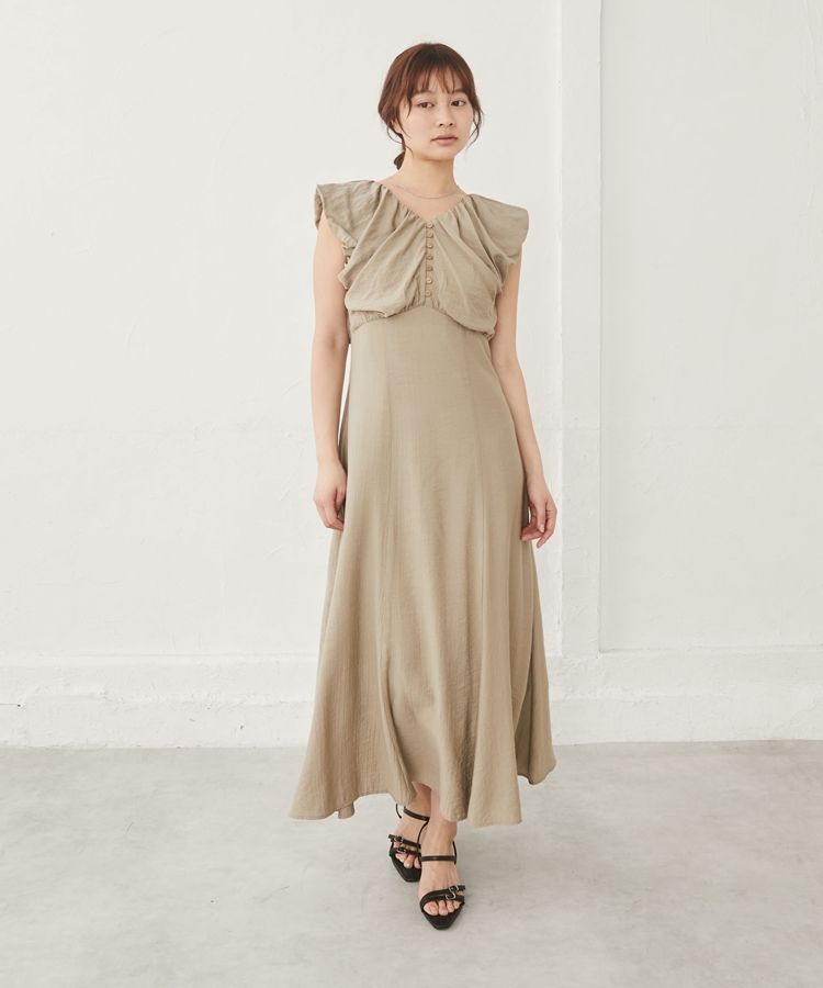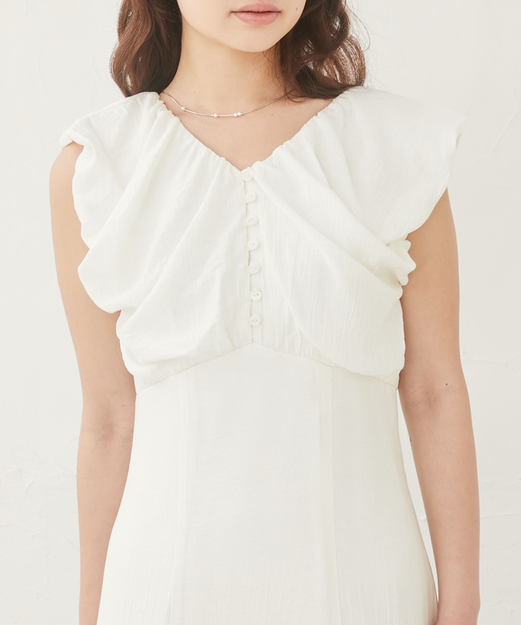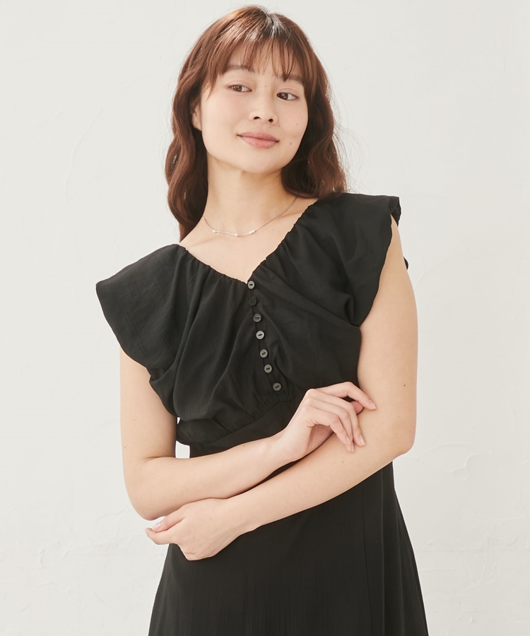 ■バルーンデザインが華やかさと大人っぽさを引き出す。ノースリーブワンピース■【デザイン】・ふんわりとしたボリューム感が目を惹く、立体感のあるバルーンデザイン・胸元のギャザーとフロントボタンがクラシックな印象をプラス・顔周りをすっきりと見せる、程良い開きのVネックデザイン・高めのウエスト切り替えでスタイルアップ効果抜群◎・ウエスト周りはタイトすぎず、裾に向かって緩やかに広がるナローシルエット【素材感】・肌なじみの良いさらりとした質感で、夏場でも快適な着心地・動くたびにしなやかに揺れる落ち感のある素材・裏地付きで透けにくく、1枚でさらりと着れる質感ーーーーーーーーーーーーーーー透け感:なし裏地:あり伸縮性:なし光沢感:なし生地厚さ:普通洗濯方法:手洗い可※詳しいお手入れ方法は商品についているタグをご覧くださいーーーーーーーーーーーーーーー※ご利用のモニター環境により、実際の色味と多少異なる場合がございます。【スタイリング】・華奢なサンダルやパンプスと合わせてドレッシーな雰囲気に・カーディガンやジャケットを肩掛けすれば、ディナーシーンにも最適・スニーカーで外した、カジュアルダウンスタイルも♪▼スタッフ別の詳しい着こなしは下の COORDINATE をチェック