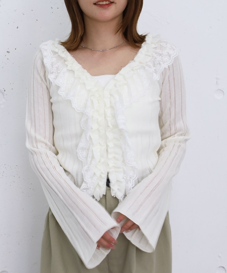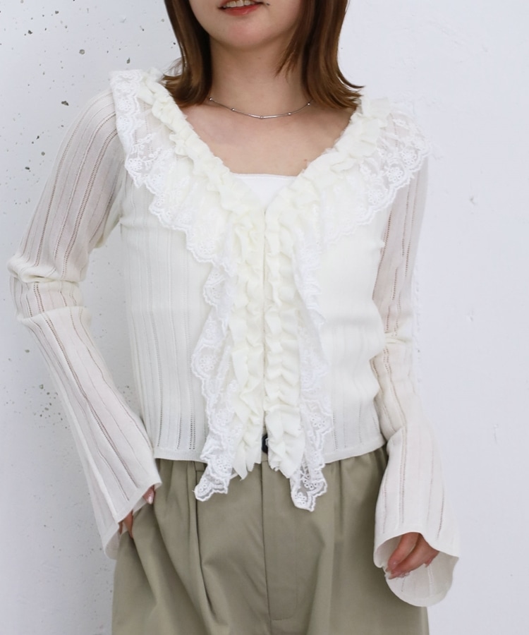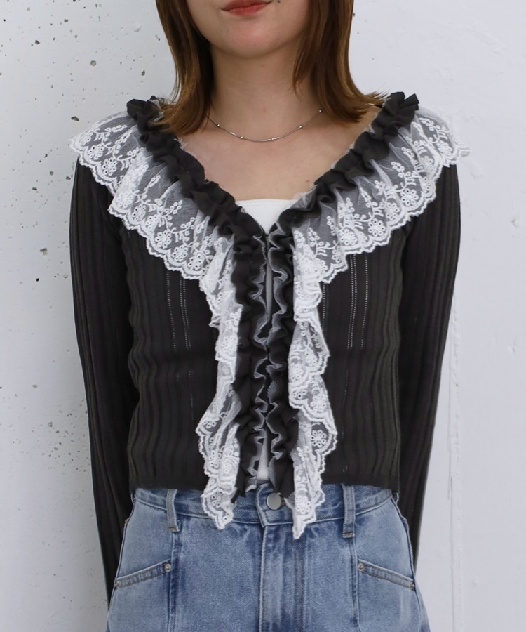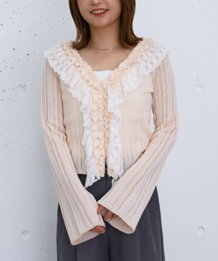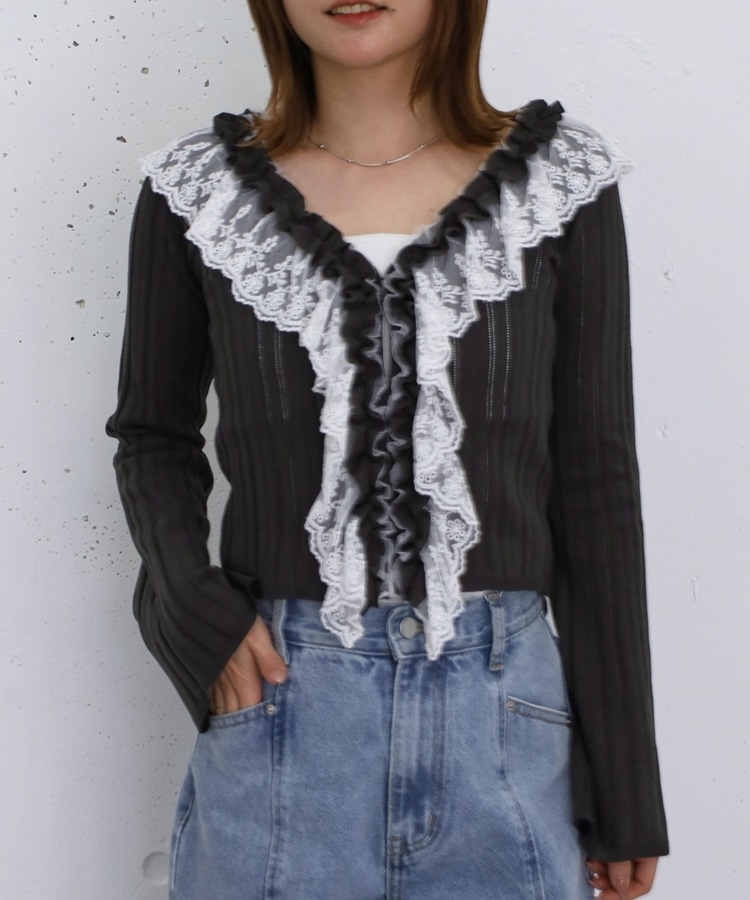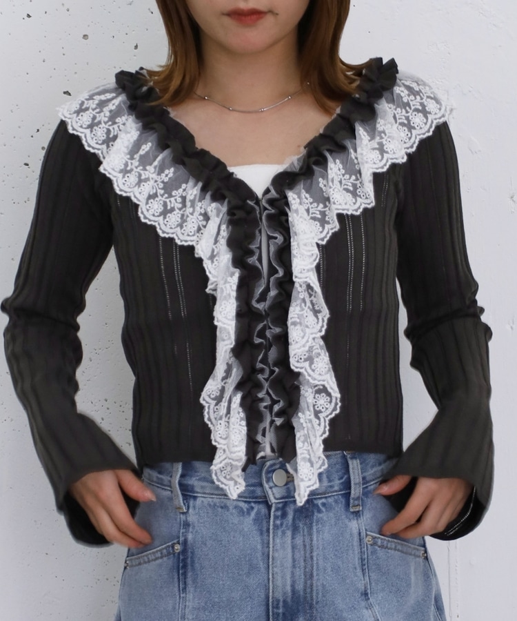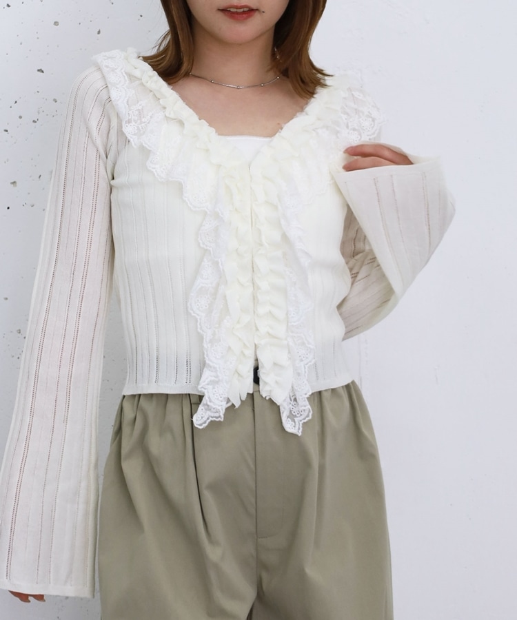 ■華やかに彩る、フロントレースフリルニットカーディガン■【デザイン】・フロントにたっぷり施されたレースフリルが目を引くカーディガン・襟元からボタン部分までレースがあしらわれ、顔まわりを華やかに演出・甘さのあるデザインながら、上品さも兼ね備えた一枚・カラーによって印象が変わり、ピンクはフェミニンに、チャコールグレーはレースが際立つ大人っぽい印象、アイボリーは万能で合わせやすい【素材感】・春夏でも着やすい軽やかなニット素材・程よい透け感で抜け感のある印象に・柔らかく着心地の良い素材感でデイリー使いにも◎ーーーーーーーーーーーーーーー透け感:あり裏地:なし伸縮性:あり光沢感:なし生地厚さ:薄手洗濯方法:洗濯可※詳しいお手入れ方法は商品についているタグをご覧くださいーーーーーーーーーーーーーーー※ご利用のモニター環境により、実際の色味と多少異なる場合がございます。【スタイリング】・デニムと合わせて甘さを抑えたカジュアルミックスに・スラックスと合わせて上品なきれいめコーデに▼スタッフ別の詳しい着こなしは下の COORDINATE をチェック