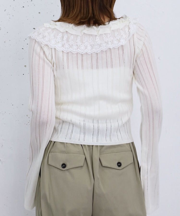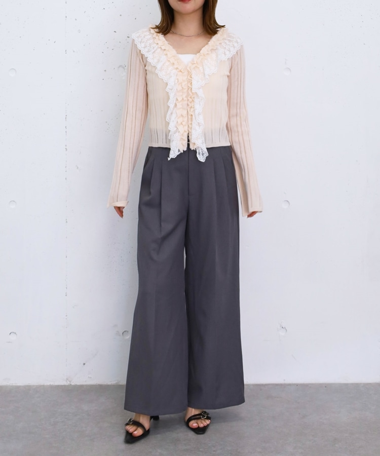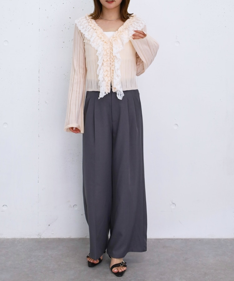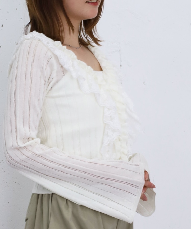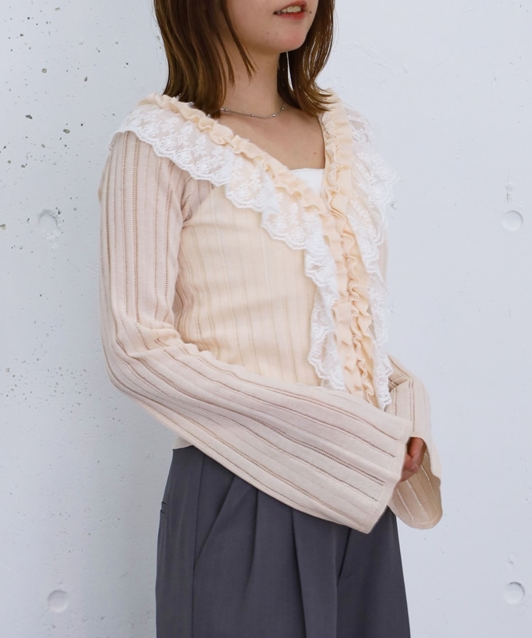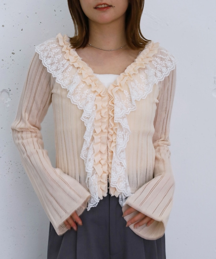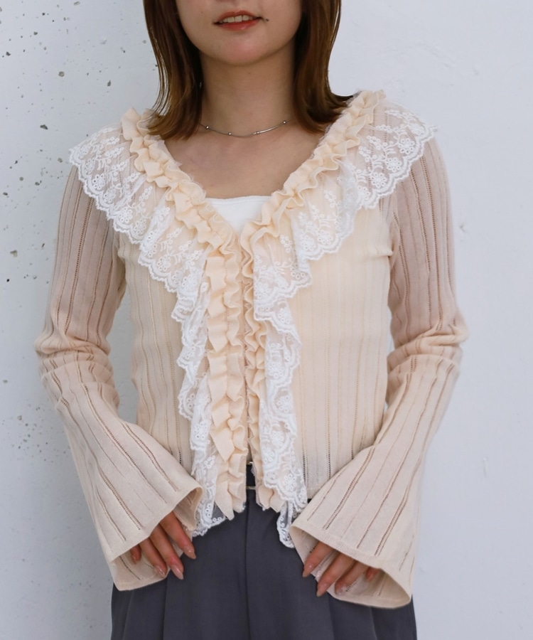 ■華やかに彩る、フロントレースフリルニットカーディガン■【デザイン】・フロントにたっぷり施されたレースフリルが目を引くカーディガン・襟元からボタン部分までレースがあしらわれ、顔まわりを華やかに演出・甘さのあるデザインながら、上品さも兼ね備えた一枚・カラーによって印象が変わり、ピンクはフェミニンに、チャコールグレーはレースが際立つ大人っぽい印象、アイボリーは万能で合わせやすい【素材感】・春夏でも着やすい軽やかなニット素材・程よい透け感で抜け感のある印象に・柔らかく着心地の良い素材感でデイリー使いにも◎ーーーーーーーーーーーーーーー透け感:あり裏地:なし伸縮性:あり光沢感:なし生地厚さ:薄手洗濯方法:洗濯可※詳しいお手入れ方法は商品についているタグをご覧くださいーーーーーーーーーーーーーーー※ご利用のモニター環境により、実際の色味と多少異なる場合がございます。【スタイリング】・デニムと合わせて甘さを抑えたカジュアルミックスに・スラックスと合わせて上品なきれいめコーデに▼スタッフ別の詳しい着こなしは下の COORDINATE をチェック