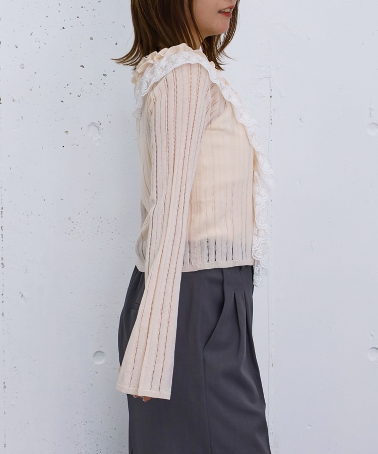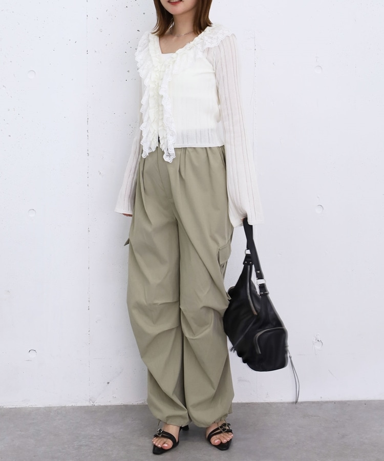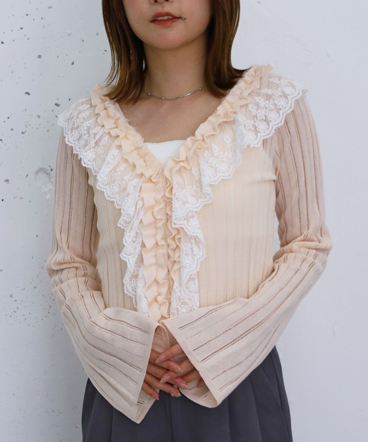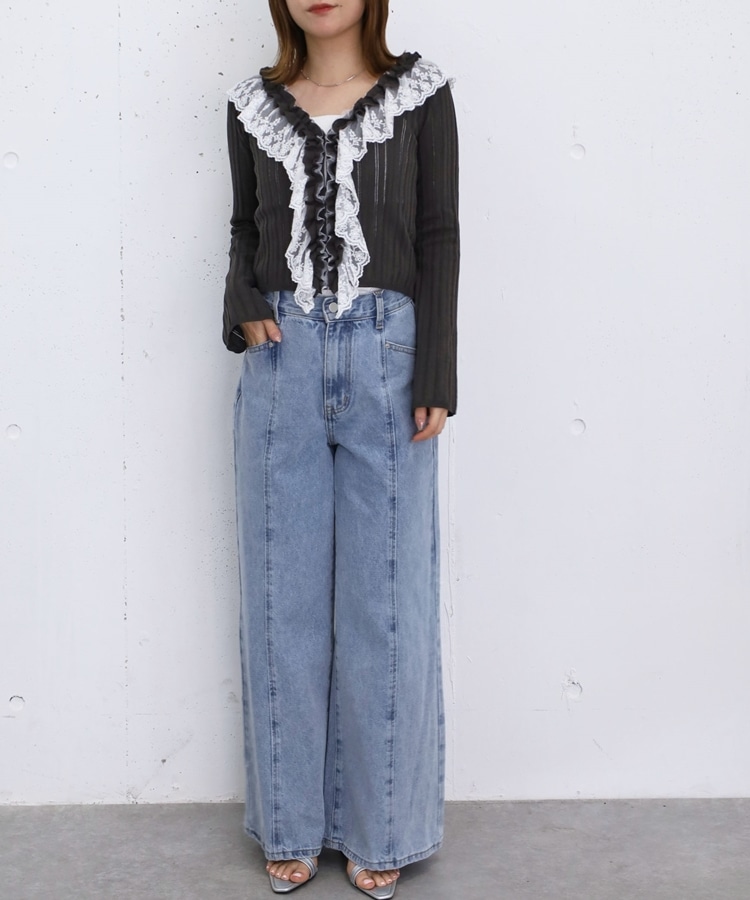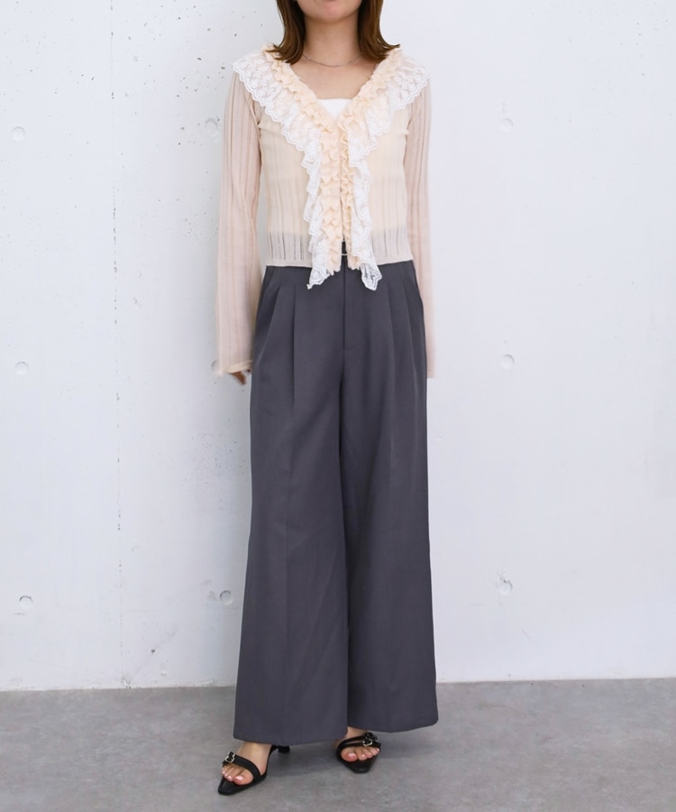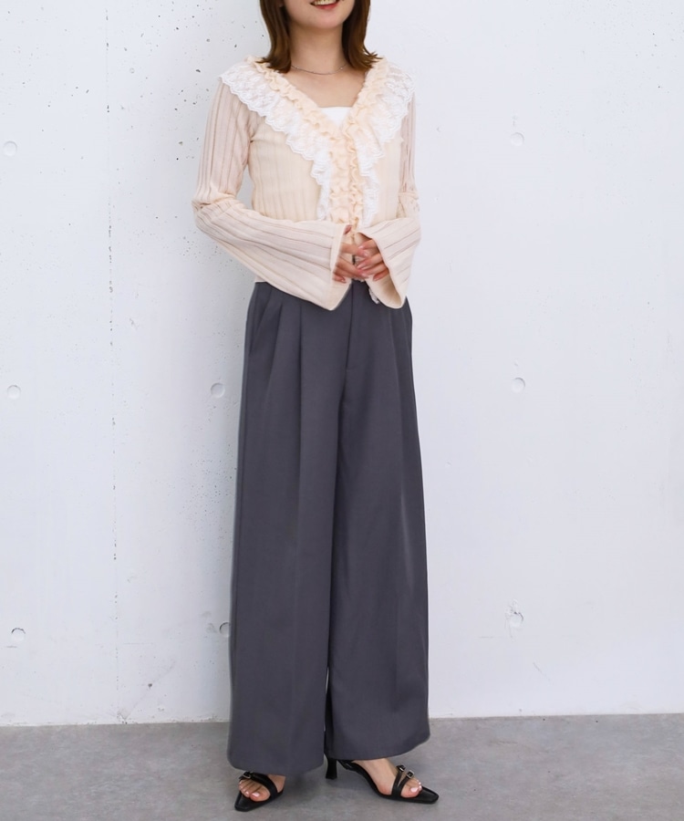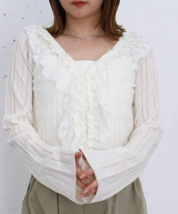 ■華やかに彩る、フロントレースフリルニットカーディガン■【デザイン】・フロントにたっぷり施されたレースフリルが目を引くカーディガン・襟元からボタン部分までレースがあしらわれ、顔まわりを華やかに演出・甘さのあるデザインながら、上品さも兼ね備えた一枚・カラーによって印象が変わり、ピンクはフェミニンに、チャコールグレーはレースが際立つ大人っぽい印象、アイボリーは万能で合わせやすい【素材感】・春夏でも着やすい軽やかなニット素材・程よい透け感で抜け感のある印象に・柔らかく着心地の良い素材感でデイリー使いにも◎ーーーーーーーーーーーーーーー透け感:あり裏地:なし伸縮性:あり光沢感:なし生地厚さ:薄手洗濯方法:洗濯可※詳しいお手入れ方法は商品についているタグをご覧くださいーーーーーーーーーーーーーーー※ご利用のモニター環境により、実際の色味と多少異なる場合がございます。【スタイリング】・デニムと合わせて甘さを抑えたカジュアルミックスに・スラックスと合わせて上品なきれいめコーデに▼スタッフ別の詳しい着こなしは下の COORDINATE をチェック