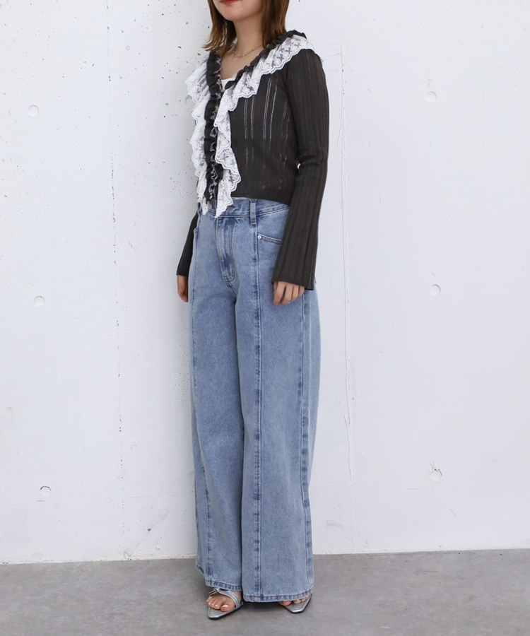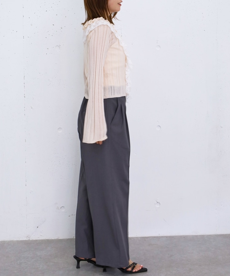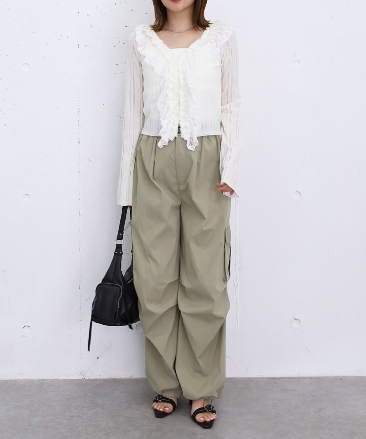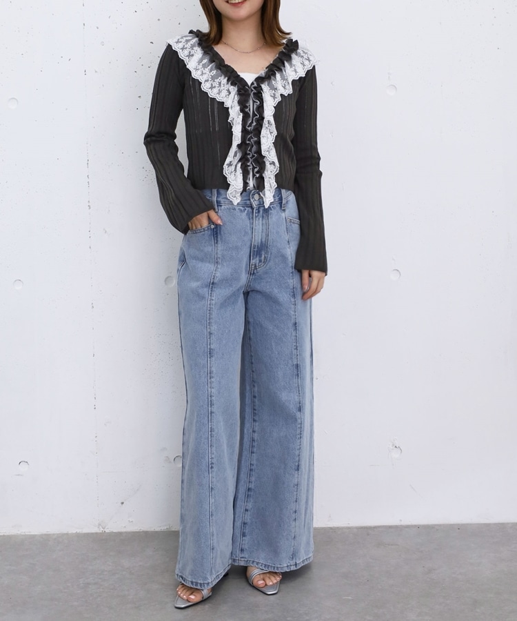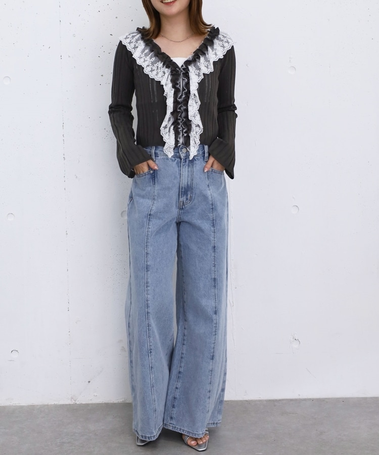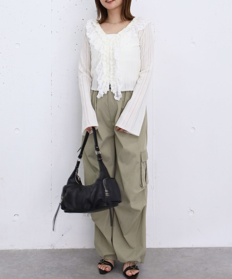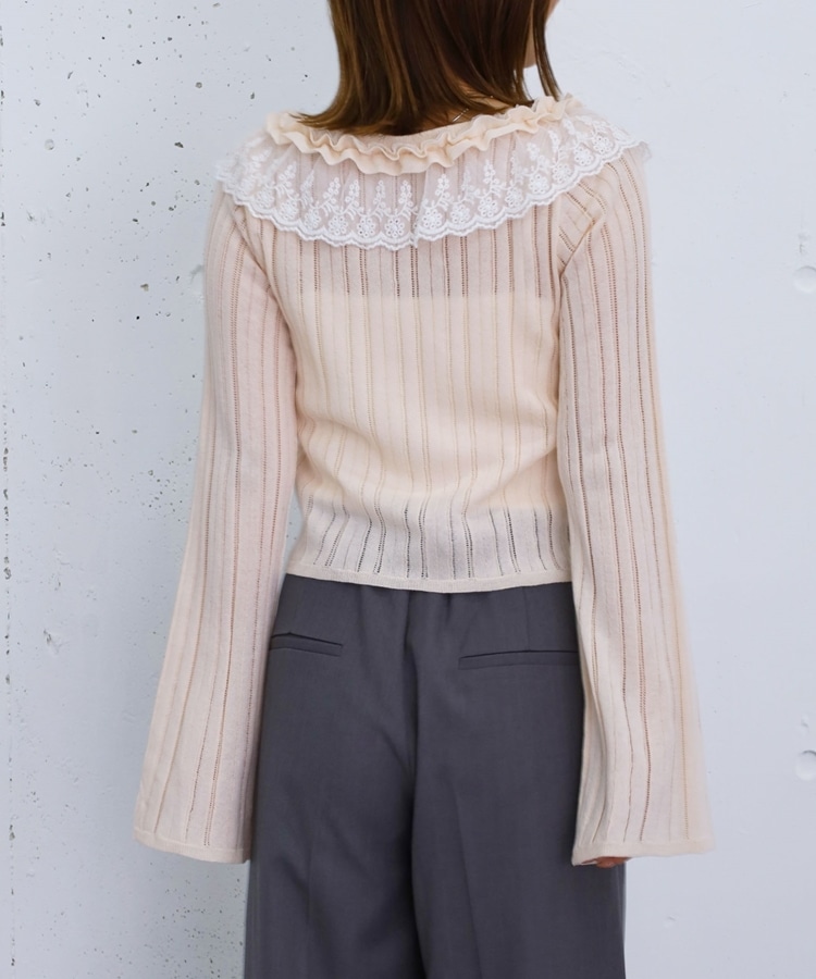 ■華やかに彩る、フロントレースフリルニットカーディガン■【デザイン】・フロントにたっぷり施されたレースフリルが目を引くカーディガン・襟元からボタン部分までレースがあしらわれ、顔まわりを華やかに演出・甘さのあるデザインながら、上品さも兼ね備えた一枚・カラーによって印象が変わり、ピンクはフェミニンに、チャコールグレーはレースが際立つ大人っぽい印象、アイボリーは万能で合わせやすい【素材感】・春夏でも着やすい軽やかなニット素材・程よい透け感で抜け感のある印象に・柔らかく着心地の良い素材感でデイリー使いにも◎ーーーーーーーーーーーーーーー透け感:あり裏地:なし伸縮性:あり光沢感:なし生地厚さ:薄手洗濯方法:洗濯可※詳しいお手入れ方法は商品についているタグをご覧くださいーーーーーーーーーーーーーーー※ご利用のモニター環境により、実際の色味と多少異なる場合がございます。【スタイリング】・デニムと合わせて甘さを抑えたカジュアルミックスに・スラックスと合わせて上品なきれいめコーデに▼スタッフ別の詳しい着こなしは下の COORDINATE をチェック