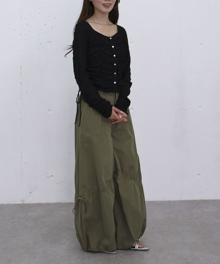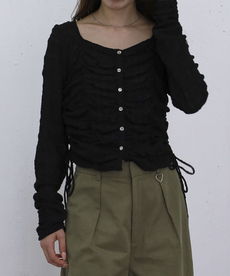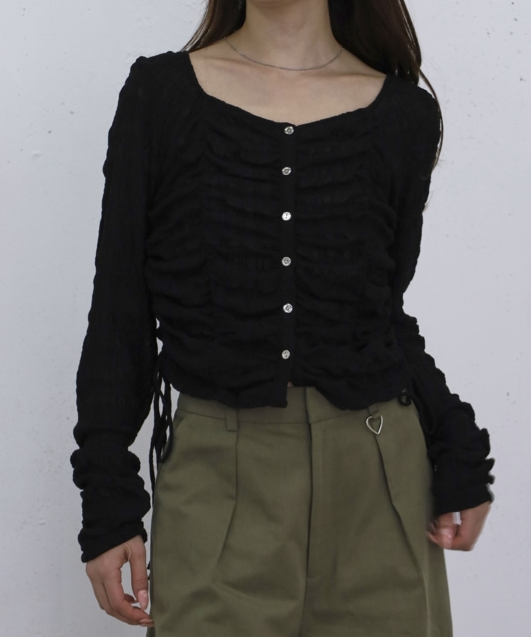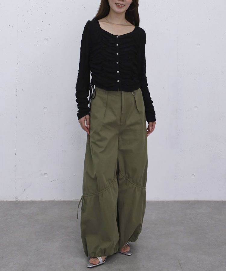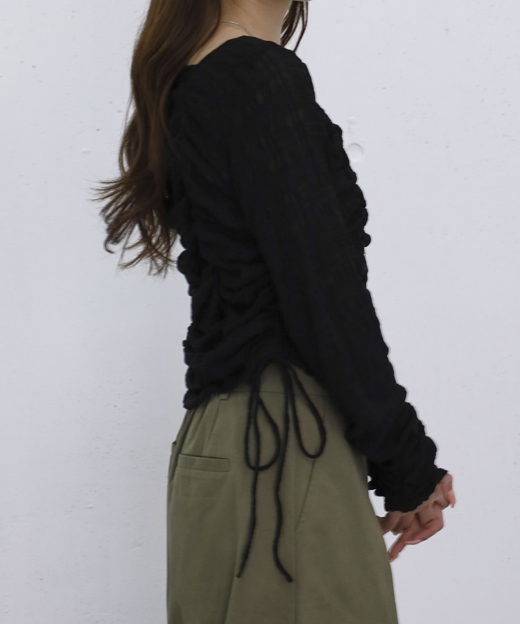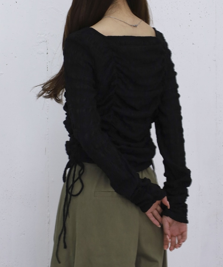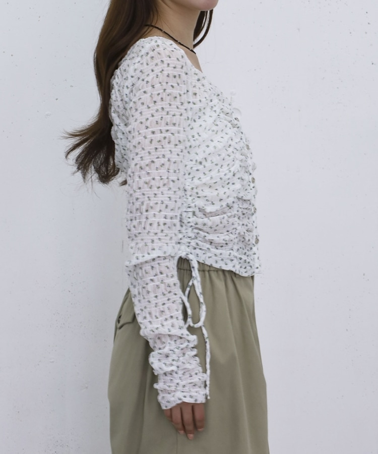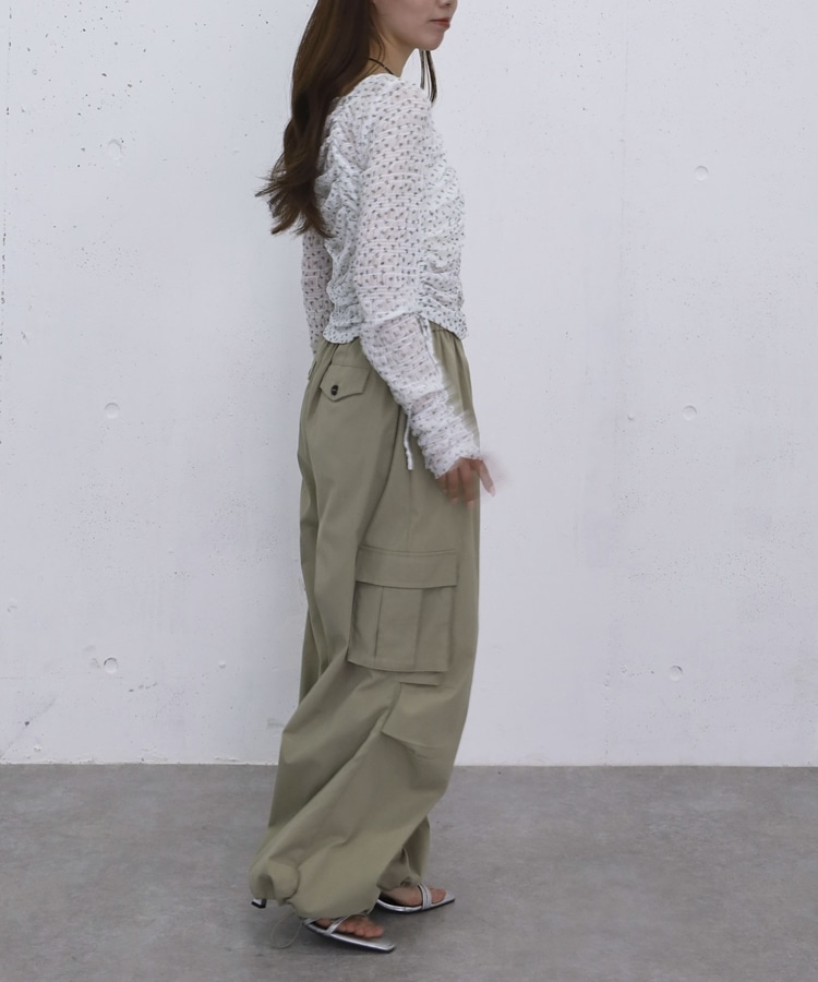 ・胸元のギャザー、サイドのドロスト、袖口のギャザーと、全体にくしゅっと感をプラスしたデザイン