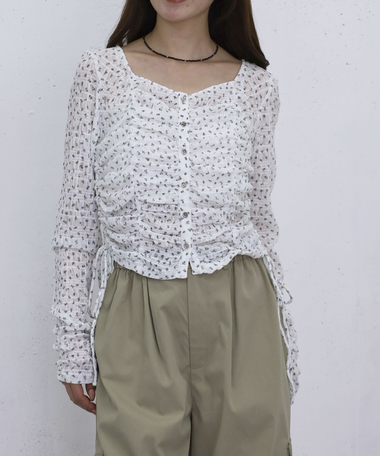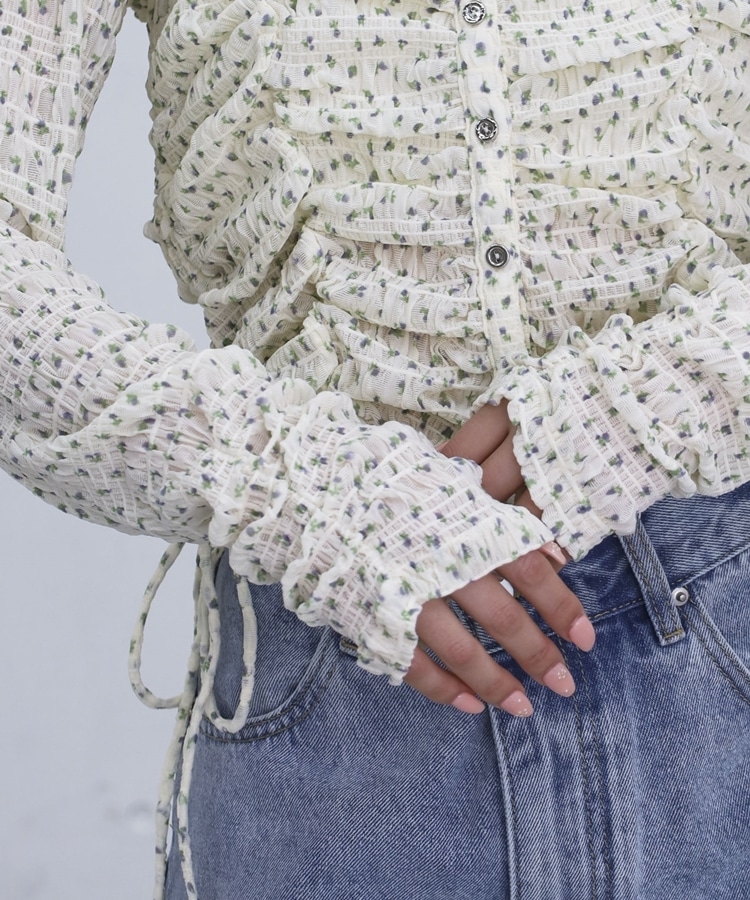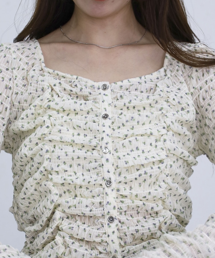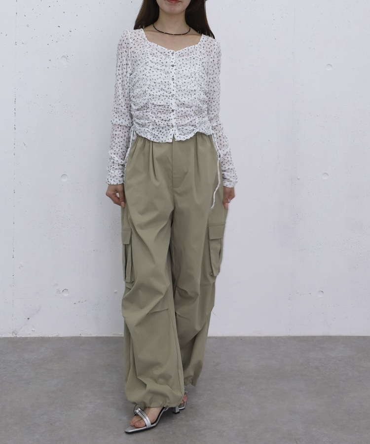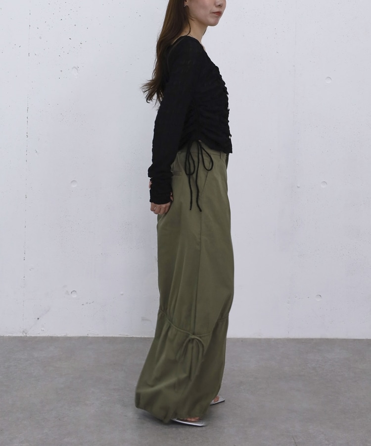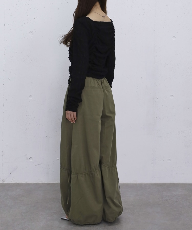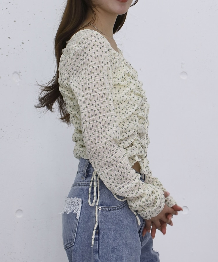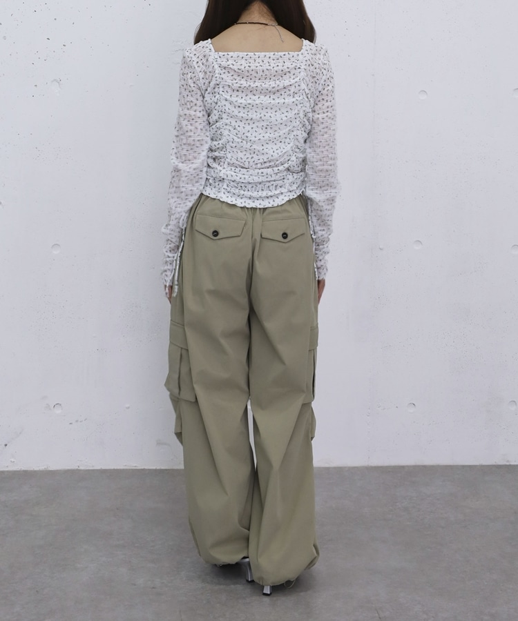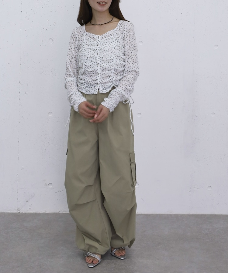 ・胸元のギャザー、サイドのドロスト、袖口のギャザーと、全体にくしゅっと感をプラスしたデザイン