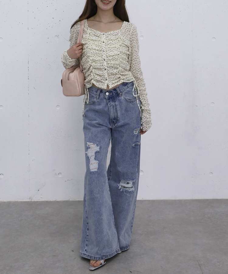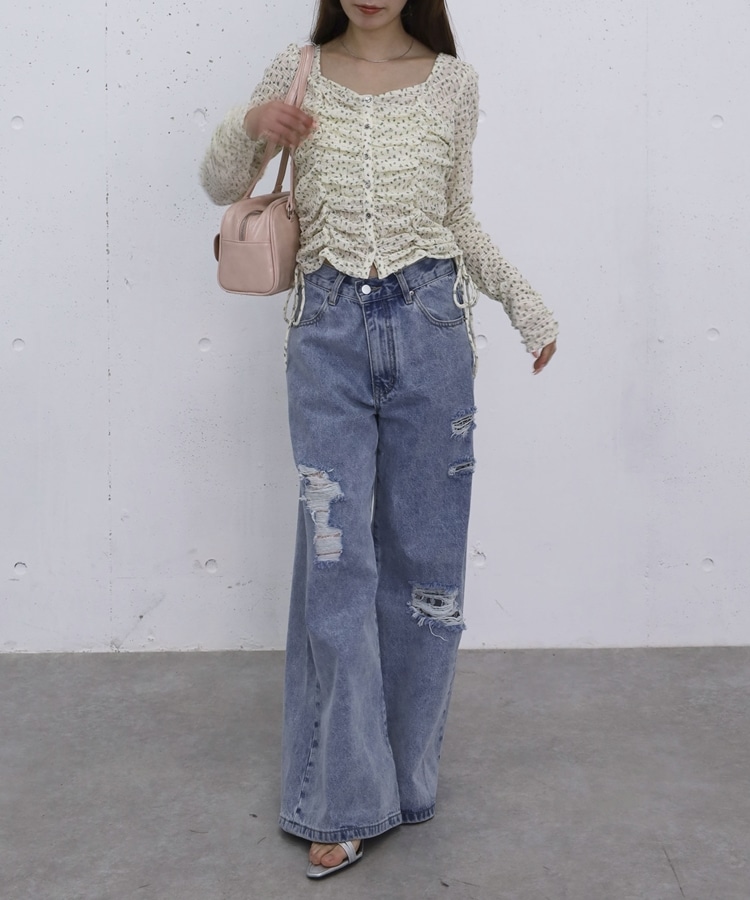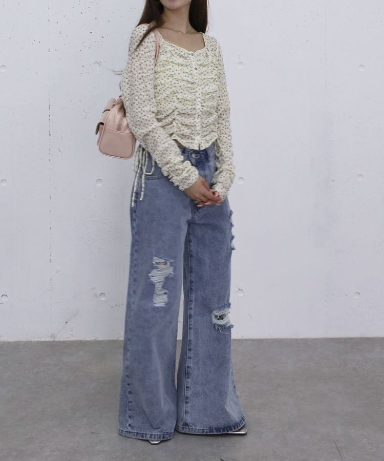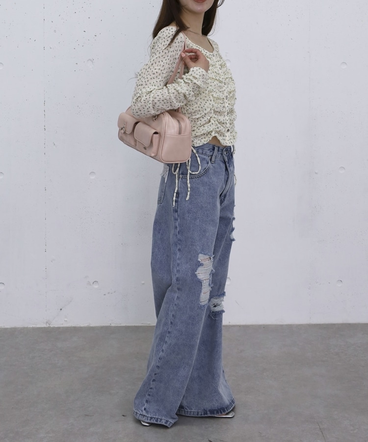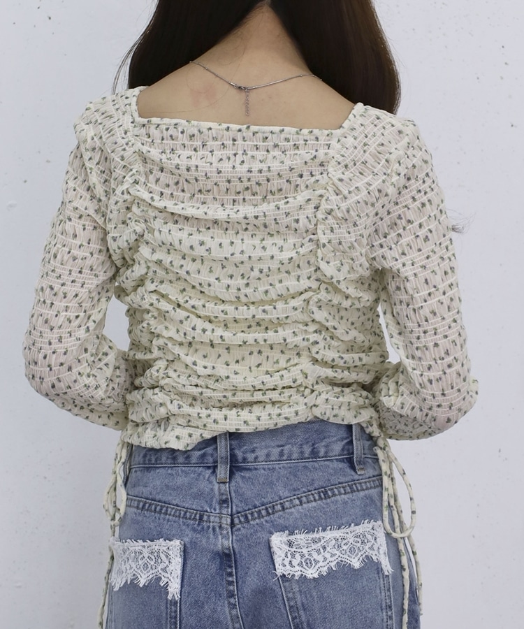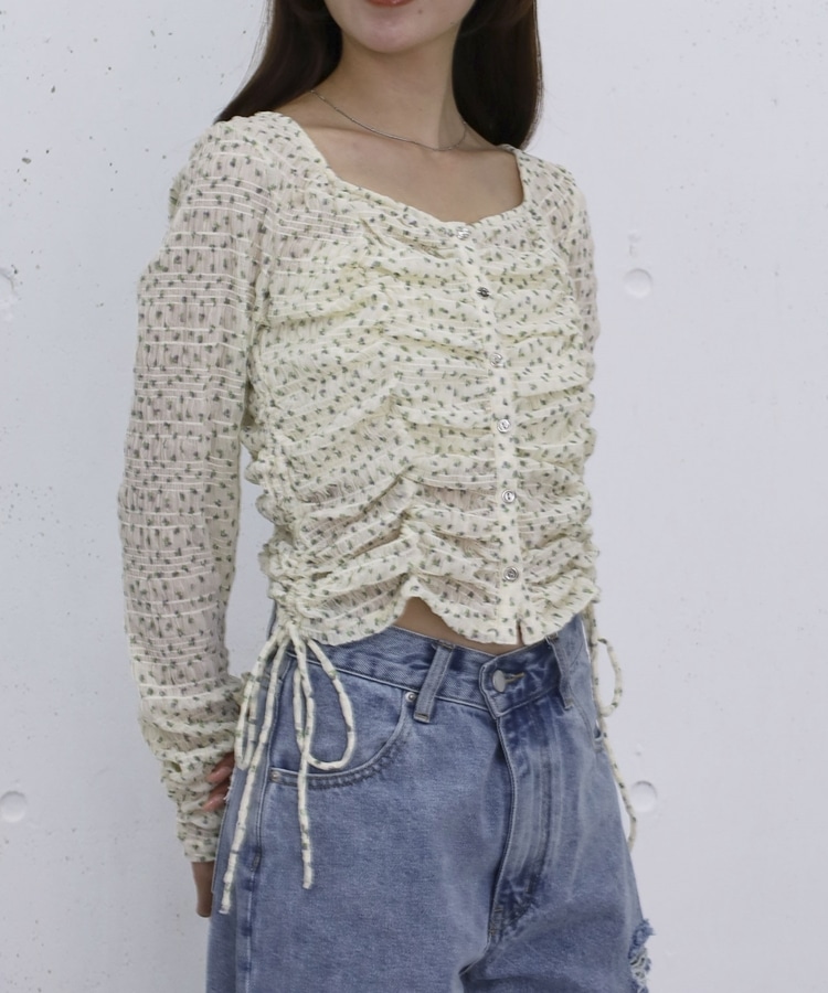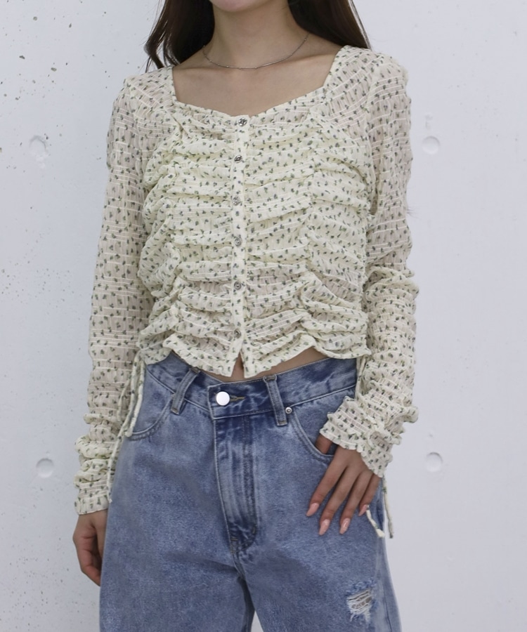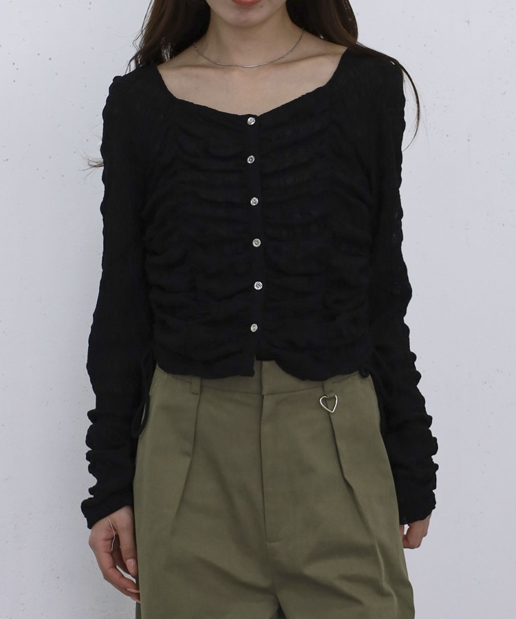 ・胸元のギャザー、サイドのドロスト、袖口のギャザーと、全体にくしゅっと感をプラスしたデザイン