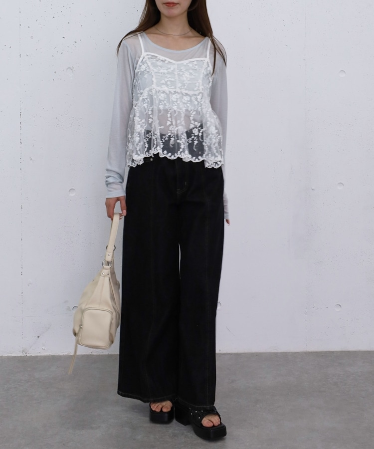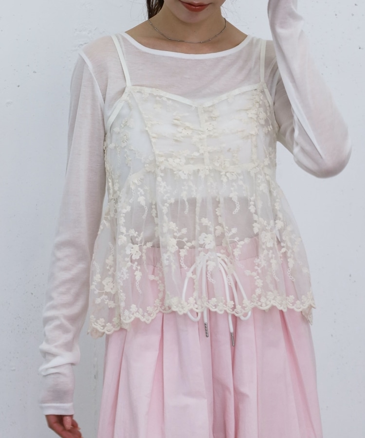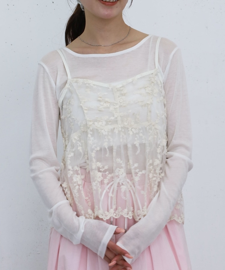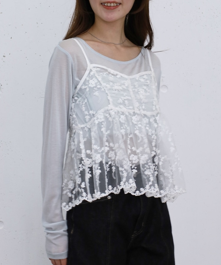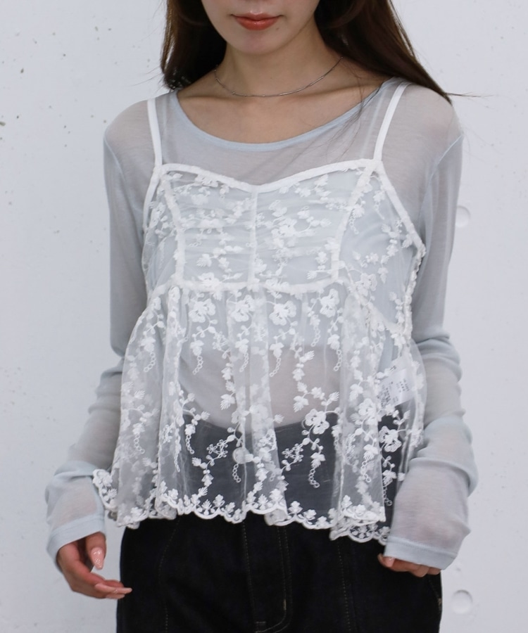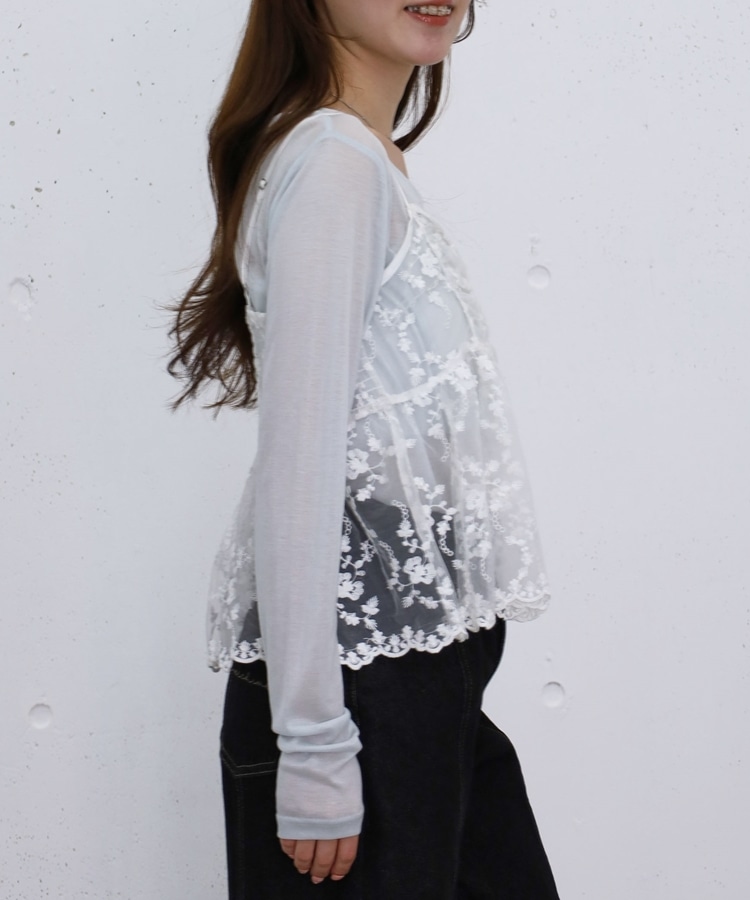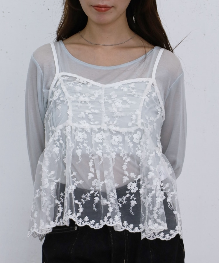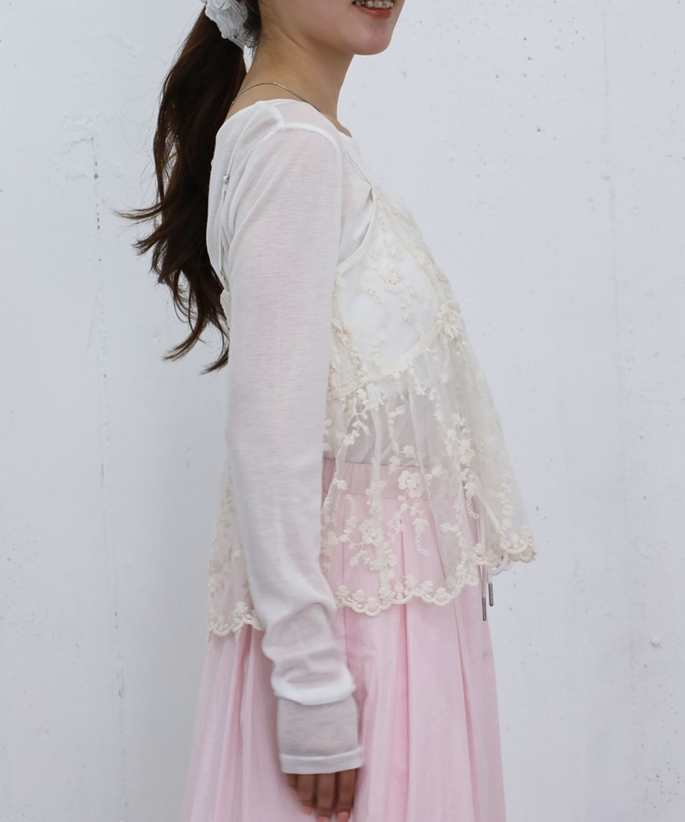 ■華やかさと着回しを叶える、刺繍レースペプラムビスチェ×シアーカットトップス■【デザイン】・繊細な刺繍レースが目を引くビスチェとシアートップスのセットアイテム・ビスチェは胸下切り替えのペプラムシルエットで、ふんわりとした立体感が可愛いデザイン・刺繍レースの上品さと華やかさでコーデの主役になる一枚・シアートップスはベーシックで使いやすく、抜け感のあるスタイリングに・セットでの着用はもちろん、それぞれ単体でも活躍する万能アイテム【素材感】・ビスチェは繊細で立体感のある刺繍レース素材・シアートップスは軽やかで柔らかい着心地・程よい透け感で春夏らしい涼しげな印象にーーーーーーーーーーーーーーー透け感:あり裏地:なし伸縮性:あり光沢感:なし生地厚さ:薄手洗濯方法:洗濯可※詳しいお手入れ方法は商品についているタグをご覧くださいーーーーーーーーーーーーーーー※ご利用のモニター環境により、実際の色味と多少異なる場合がございます。【スタイリング】・セットで着て華やかなレイヤードコーデに・デニムやカーゴパンツと合わせてカジュアルミックスに・スラックスと合わせて大人っぽいきれいめコーデにも◎・シアートップスはキャミワンピや他のビスチェと合わせて着回しも楽しめる▼スタッフ別の詳しい着こなしは下の COORDINATE をチェック