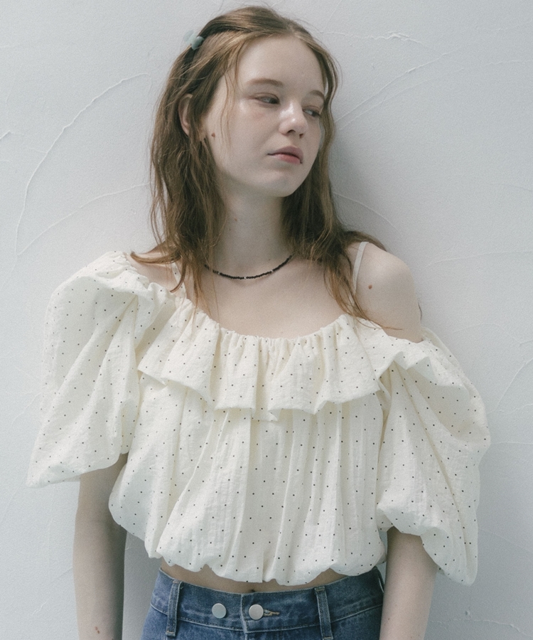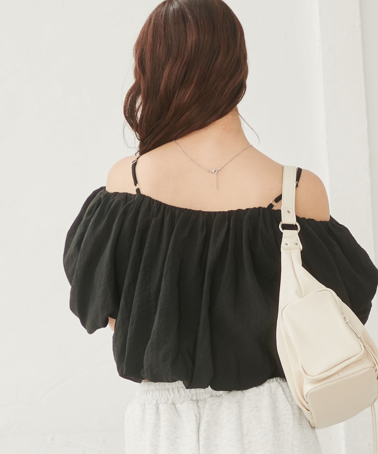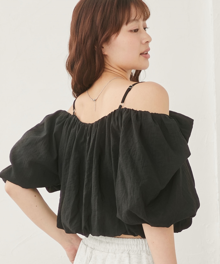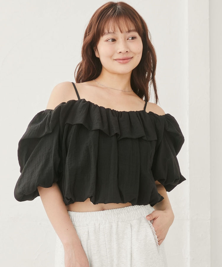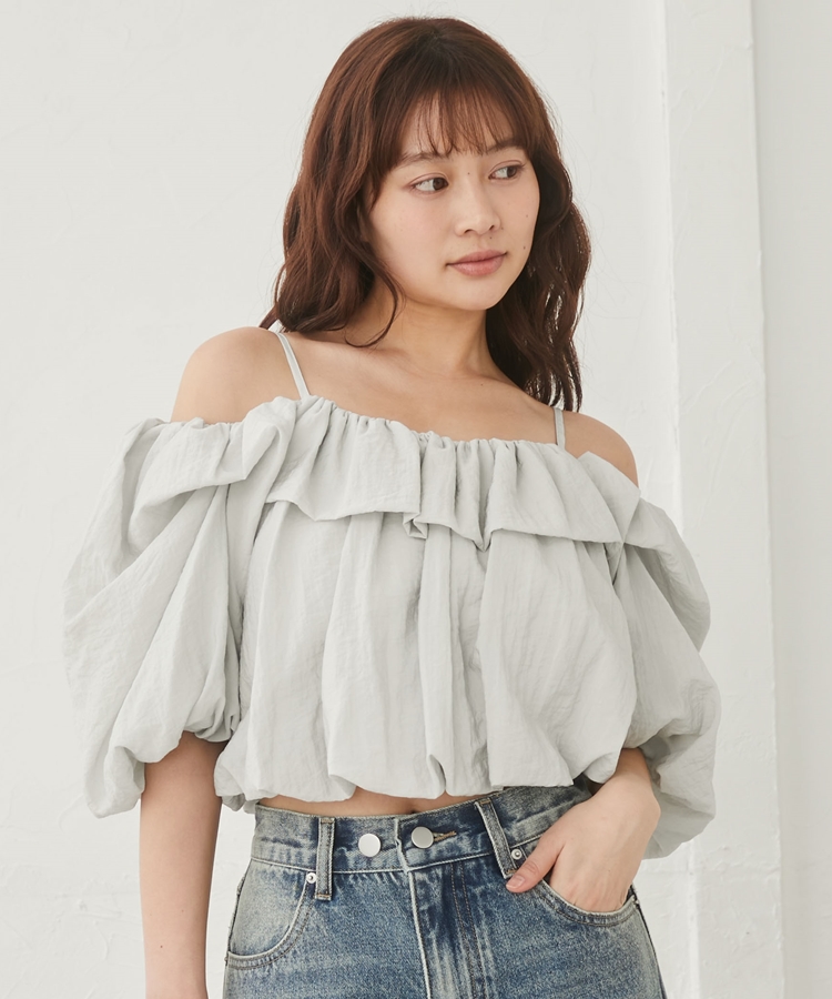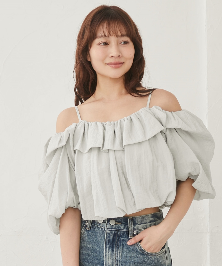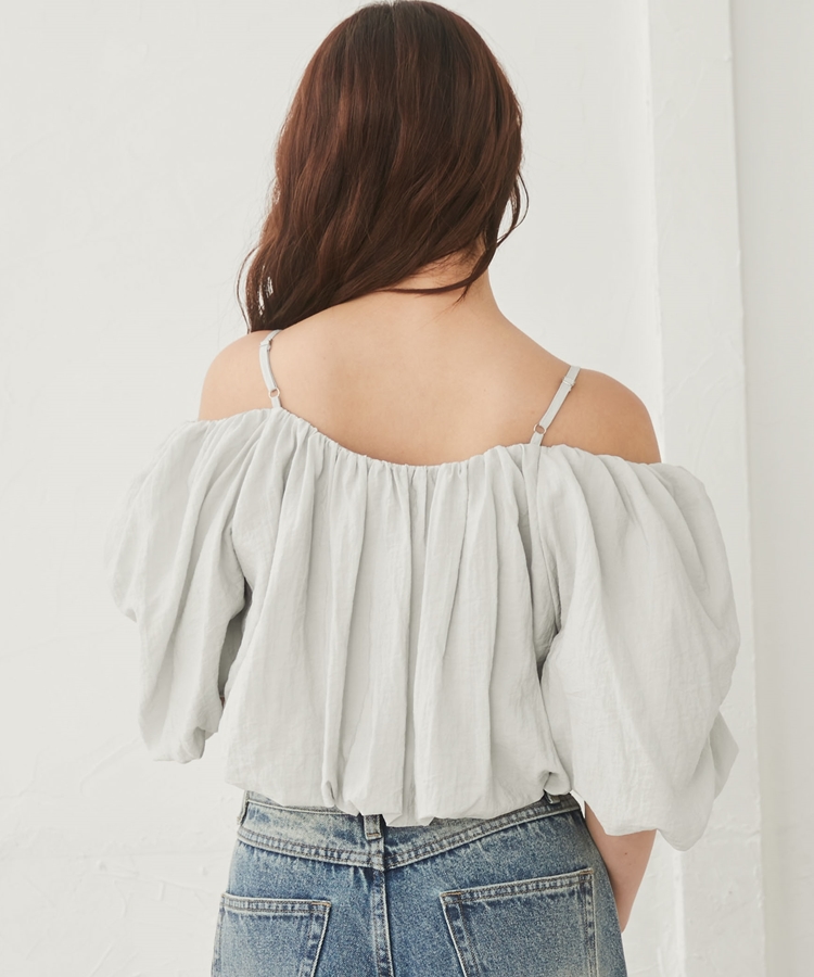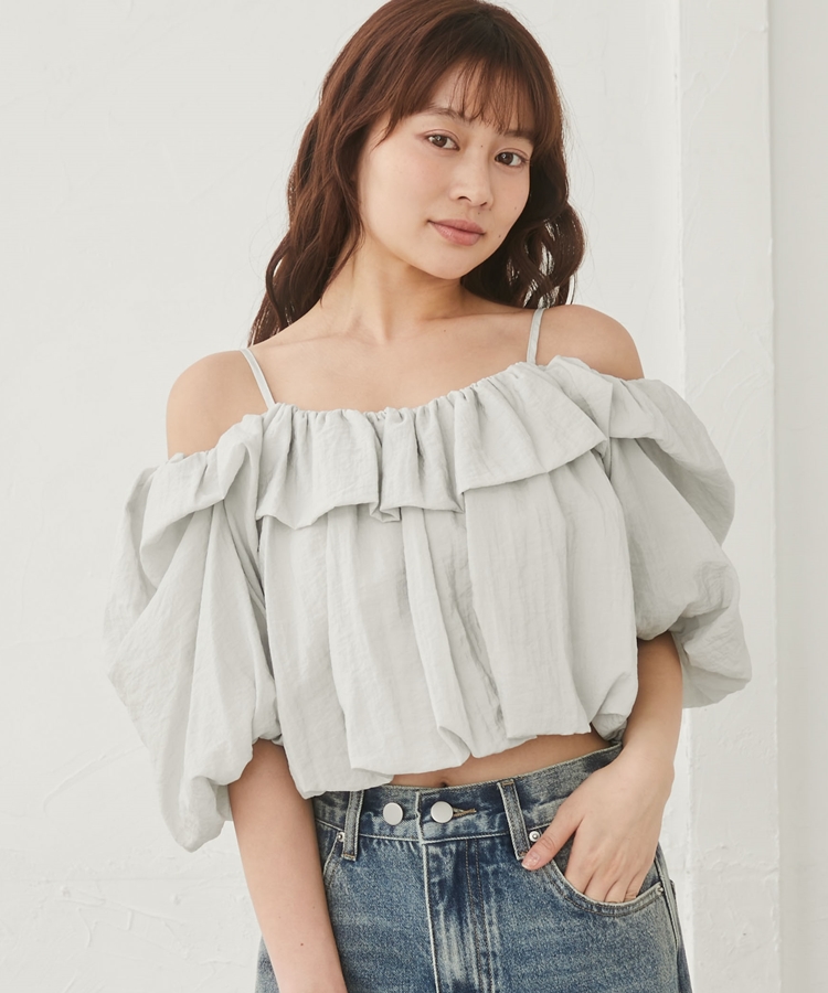 ■ボリューム×フリルで華やぐ、主役級オフショルブラウス■【デザイン】・たっぷりのタックとフリルで立体感のある華やかなデザイン・オフショル仕様でデコルテをきれいに見せ女性らしさを演出・バルーンシルエットがトレンド感と可愛らしさをプラス・肩紐付きで安定感があり、着用しやすい仕様・表面感のあるナチュラルな風合いでこなれた印象に【素材感】・軽やかでふんわりとしたエアリーな素材感・柔らかく肌当たりのいい着心地・程よいハリ感でバルーンシルエットをきれいにキープーーーーーーーーーーーーーーー透け感:なし裏地:あり伸縮性:あり光沢感:なし生地厚さ:普通洗濯方法:洗濯可※詳しいお手入れ方法は商品についているタグをご覧くださいーーーーーーーーーーーーーーー※ご利用のモニター環境により、実際の色味と多少異なる場合がございます。【スタイリング】・デニムと合わせてカジュアルに大人可愛く・スラックスと合わせてきれいめコーデに・ミニボトムと合わせてトレンド感のあるスタイリングも◎▼スタッフ別の詳しい着こなしは下の COORDINATE をチェック