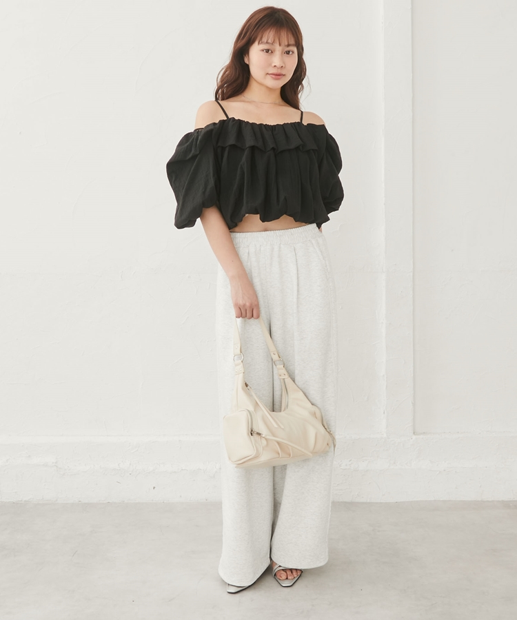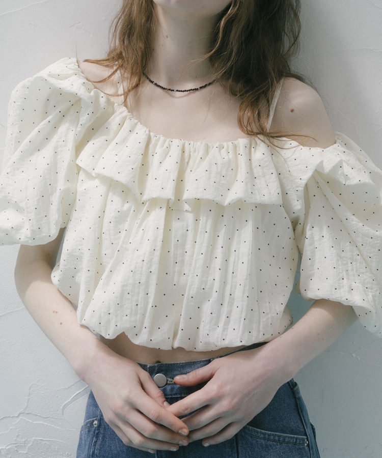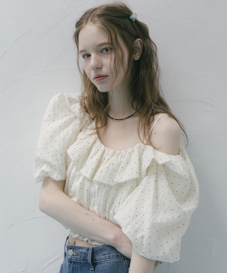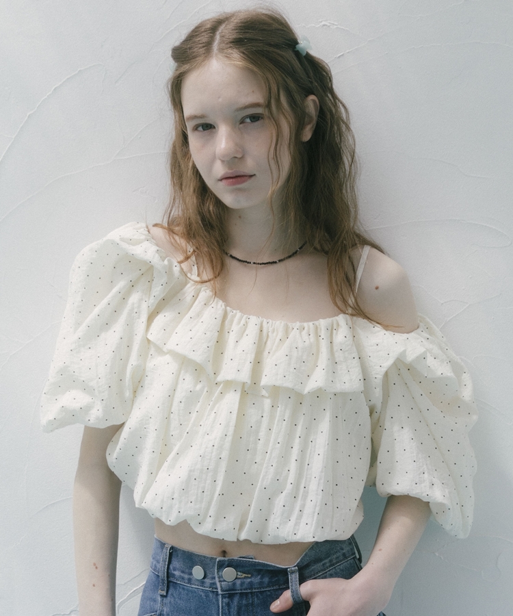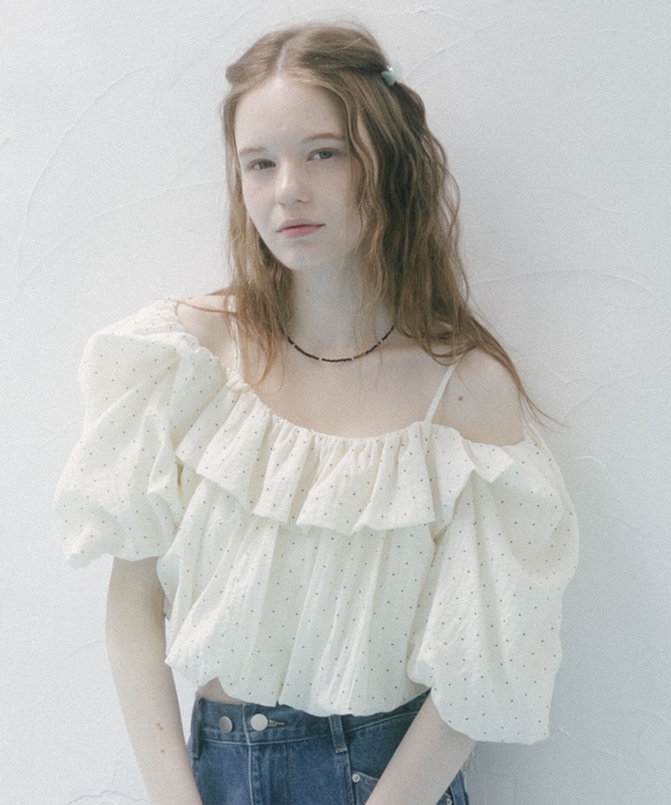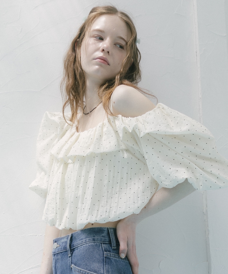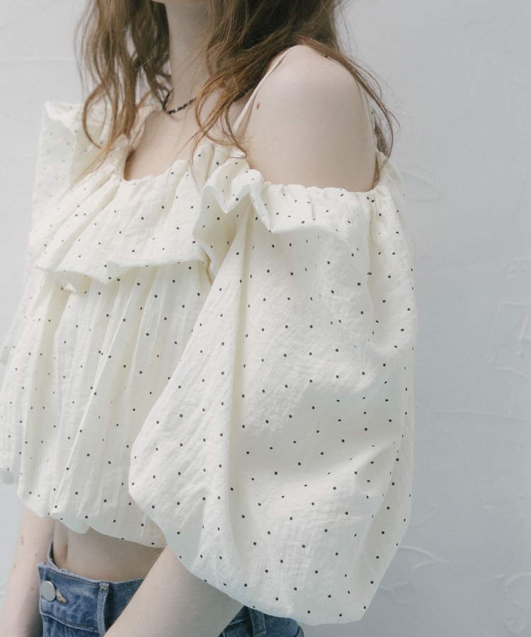 ■ボリューム×フリルで華やぐ、主役級オフショルブラウス■【デザイン】・たっぷりのタックとフリルで立体感のある華やかなデザイン・オフショル仕様でデコルテをきれいに見せ女性らしさを演出・バルーンシルエットがトレンド感と可愛らしさをプラス・肩紐付きで安定感があり、着用しやすい仕様・表面感のあるナチュラルな風合いでこなれた印象に【素材感】・軽やかでふんわりとしたエアリーな素材感・柔らかく肌当たりのいい着心地・程よいハリ感でバルーンシルエットをきれいにキープーーーーーーーーーーーーーーー透け感:なし裏地:あり伸縮性:あり光沢感:なし生地厚さ:普通洗濯方法:洗濯可※詳しいお手入れ方法は商品についているタグをご覧くださいーーーーーーーーーーーーーーー※ご利用のモニター環境により、実際の色味と多少異なる場合がございます。【スタイリング】・デニムと合わせてカジュアルに大人可愛く・スラックスと合わせてきれいめコーデに・ミニボトムと合わせてトレンド感のあるスタイリングも◎▼スタッフ別の詳しい着こなしは下の COORDINATE をチェック