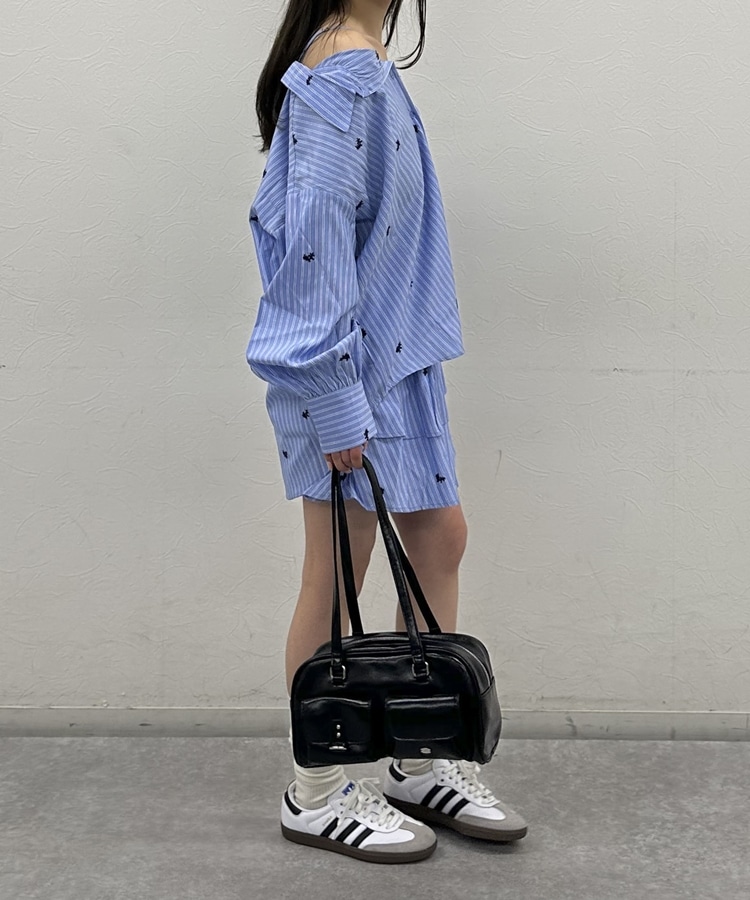 ・先程のシャツとセットアップで着られるアイテムで、より今っぽいスタイリングが完成