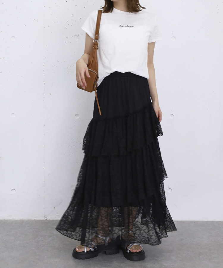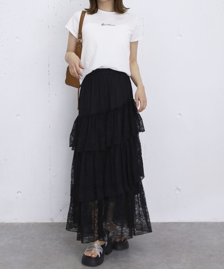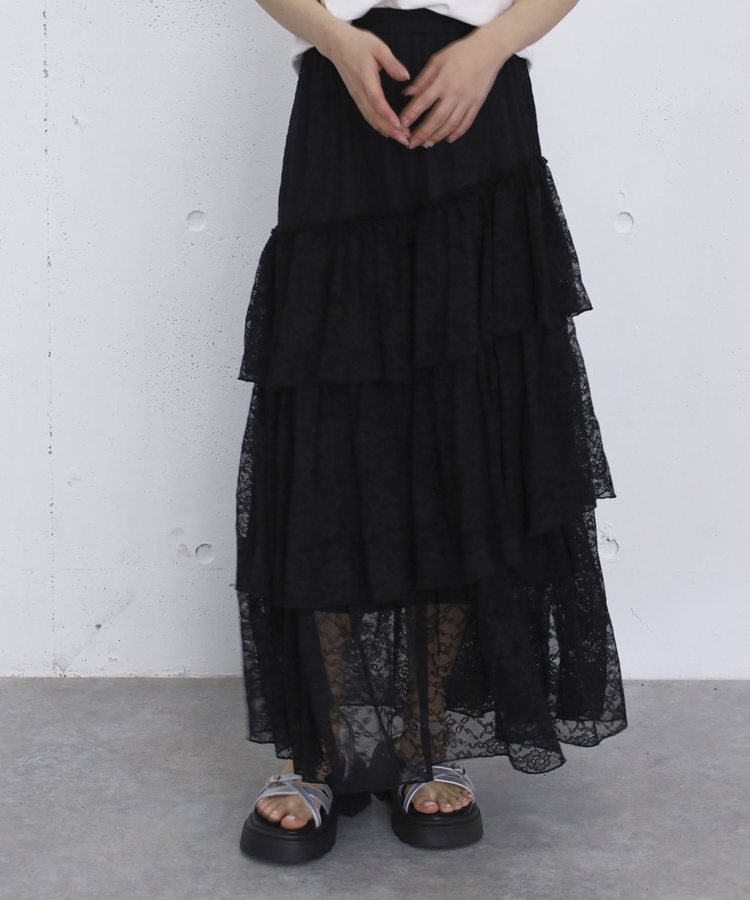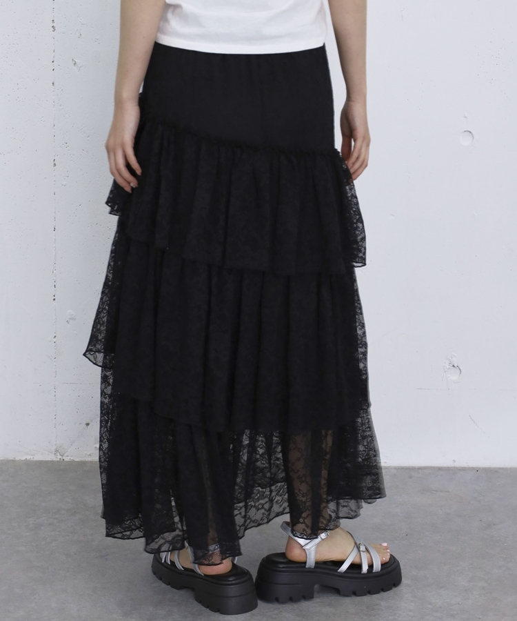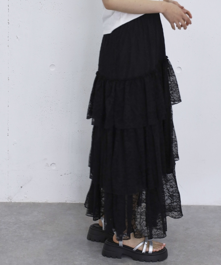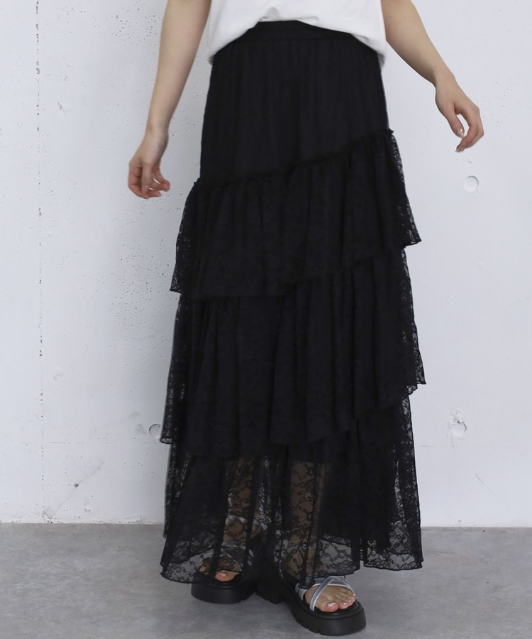 アシンメトリーレースフリルティアードスカート BLACK