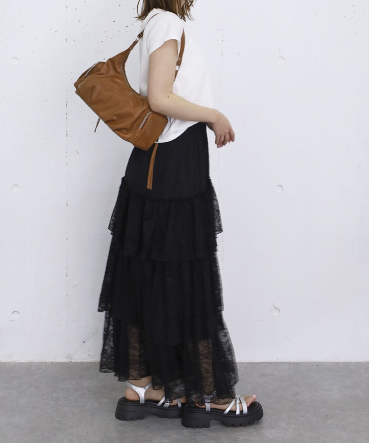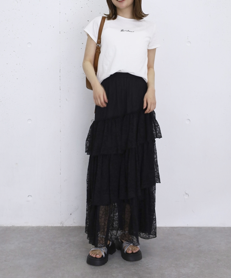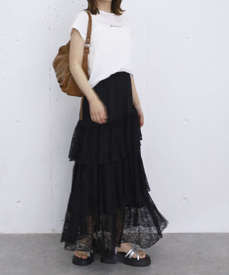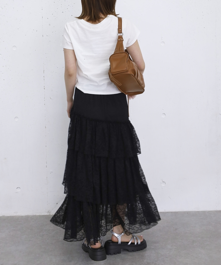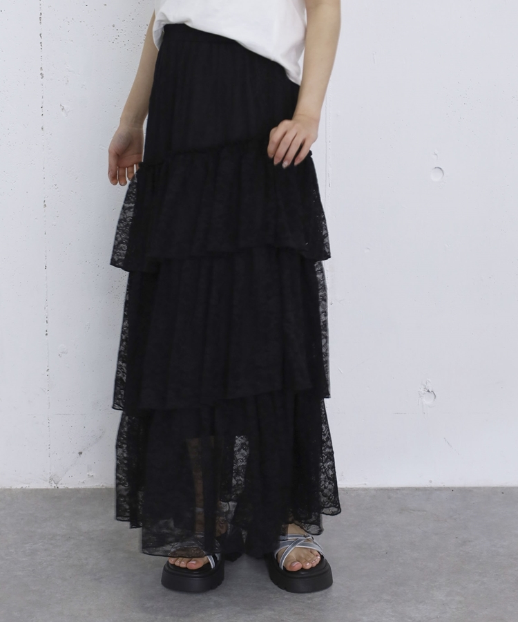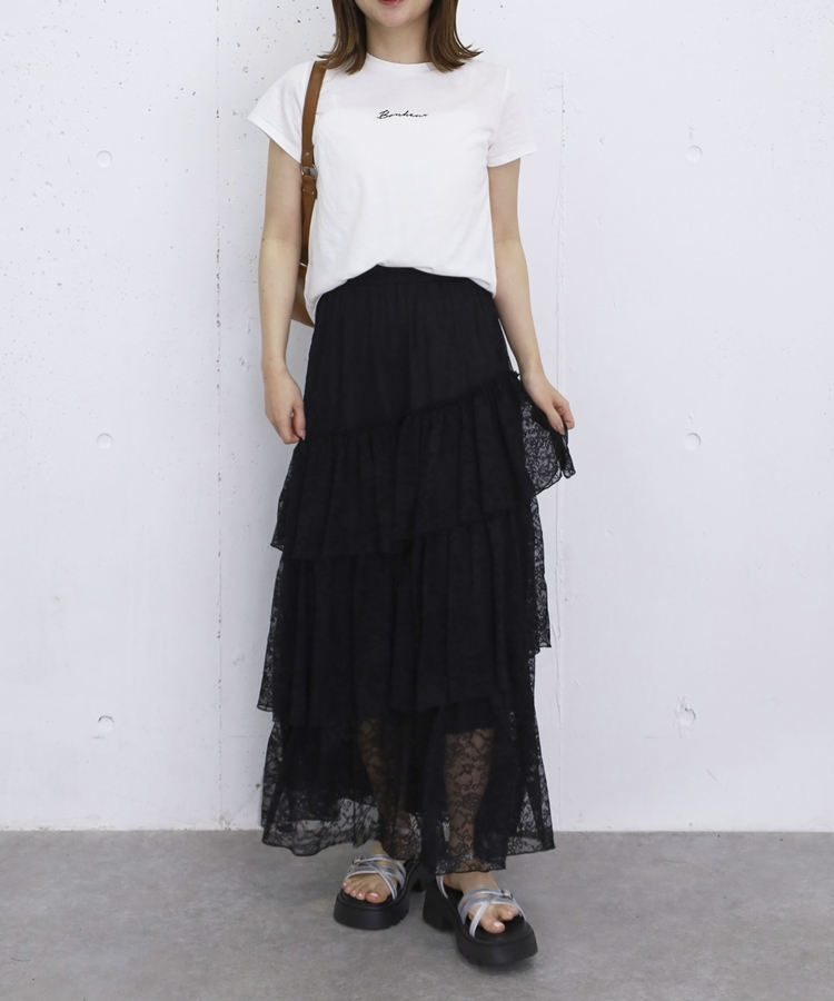 アシンメトリーレースフリルティアードスカート BLACK