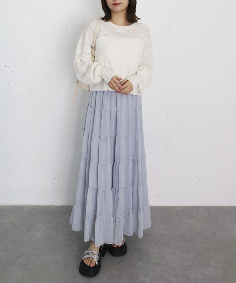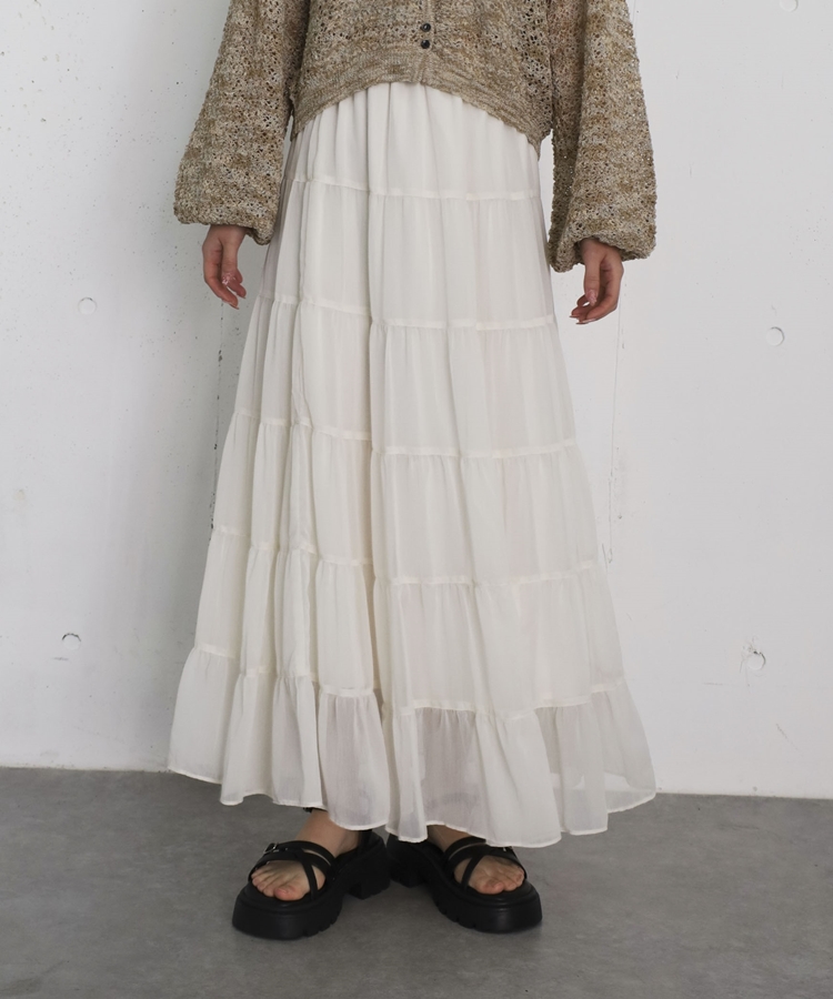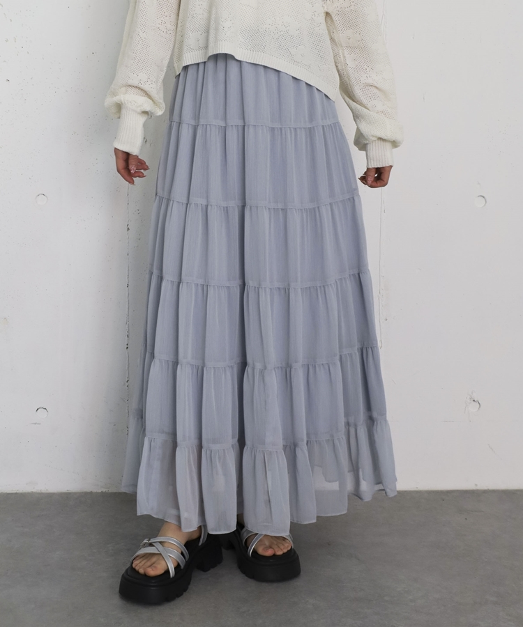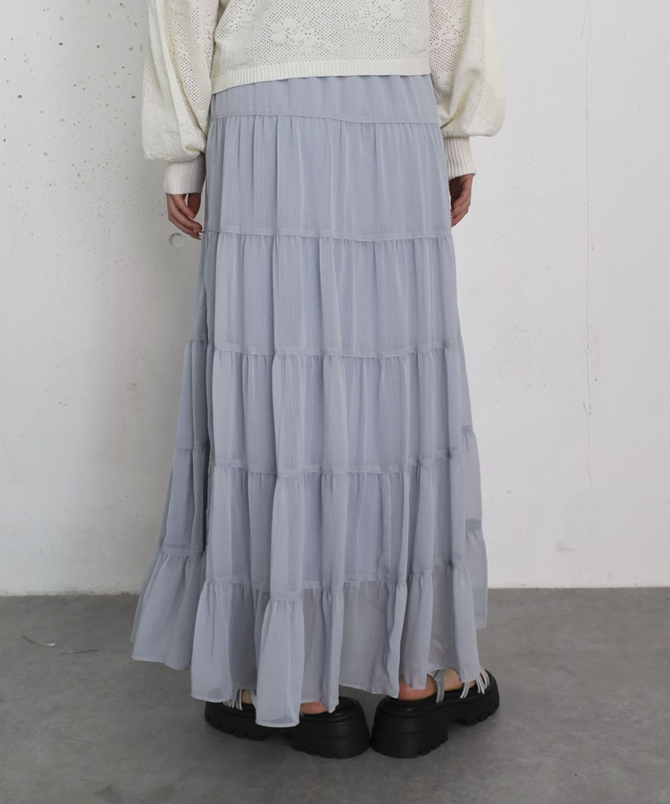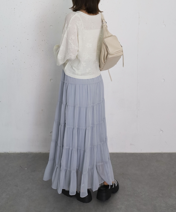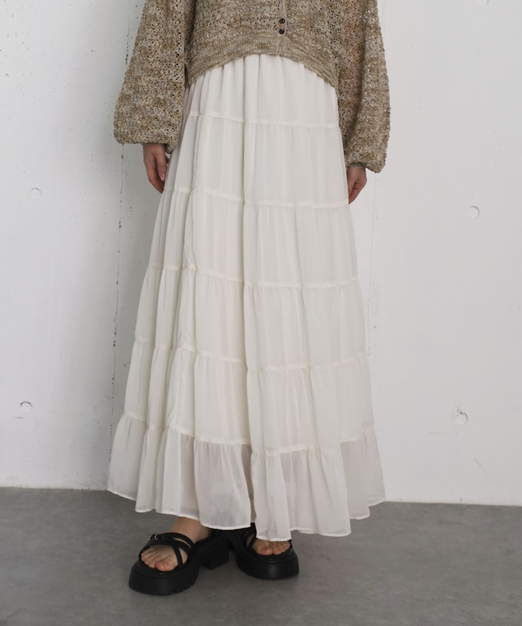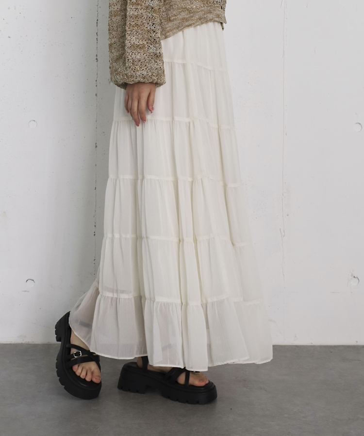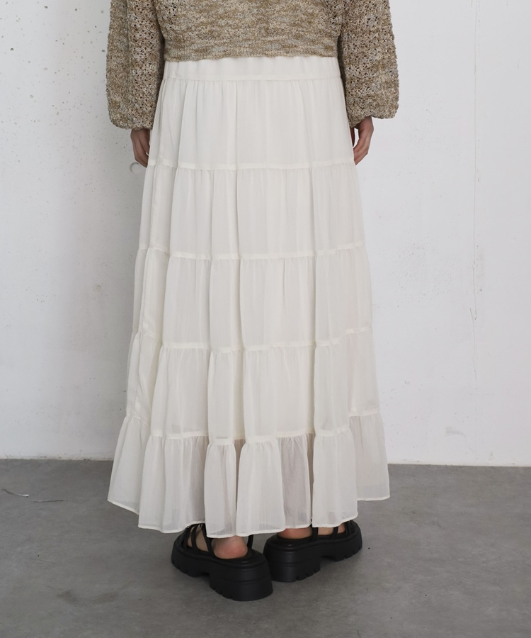 ■ふんわり揺れて映える、シアー楊柳ボリュームティアードスカート■【デザイン】・透け感のある楊柳素材が爽やかな印象のティアードスカート・ボリュームたっぷりのティアードデザインで、華やかなシルエットに・動くたびにふわっと揺れる軽やかさが魅力・シンプルなトップスと合わせるだけでコーデが決まる主役アイテム【素材感】・表面感のある楊柳生地でナチュラルな風合い・軽くてエアリーな着心地で春夏にぴったり・ウエストゴム仕様でストレスフリーに着用可能ーーーーーーーーーーーーーーー透け感:あり裏地:あり伸縮性:なし光沢感:なし生地厚さ:薄手洗濯方法:洗濯可※詳しいお手入れ方法は商品についているタグをご覧くださいーーーーーーーーーーーーーーー※ご利用のモニター環境により、実際の色味と多少異なる場合がございます【スタイリング】・Tシャツやカットソーと合わせてカジュアルに・ブラウスと合わせてフェミニンなスタイリングに・コンパクトトップスと合わせてメリハリのあるコーデに・サンダル合わせで抜け感のある春夏コーデがおすすめ▼スタッフ別の詳しい着こなしは下の COORDINATE をチェック