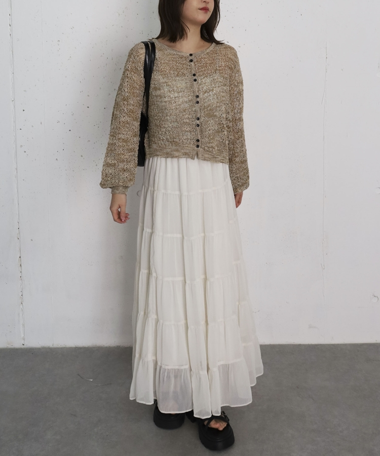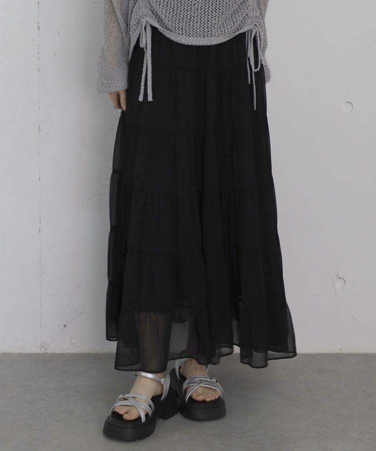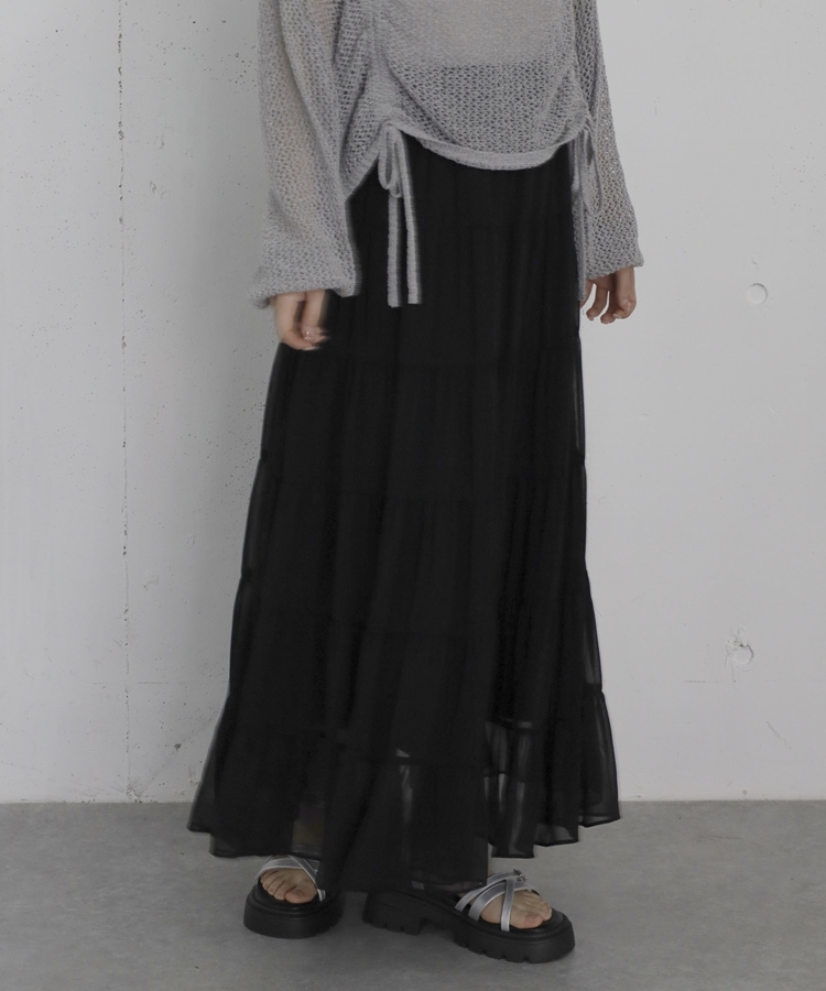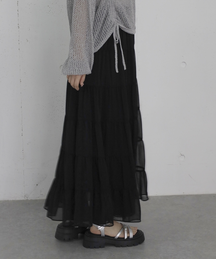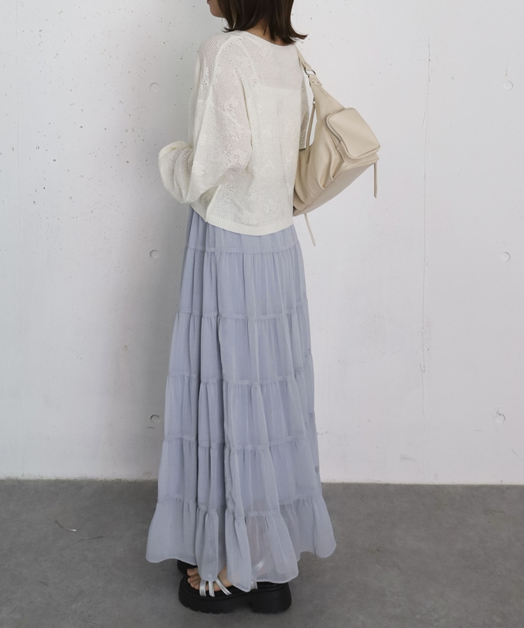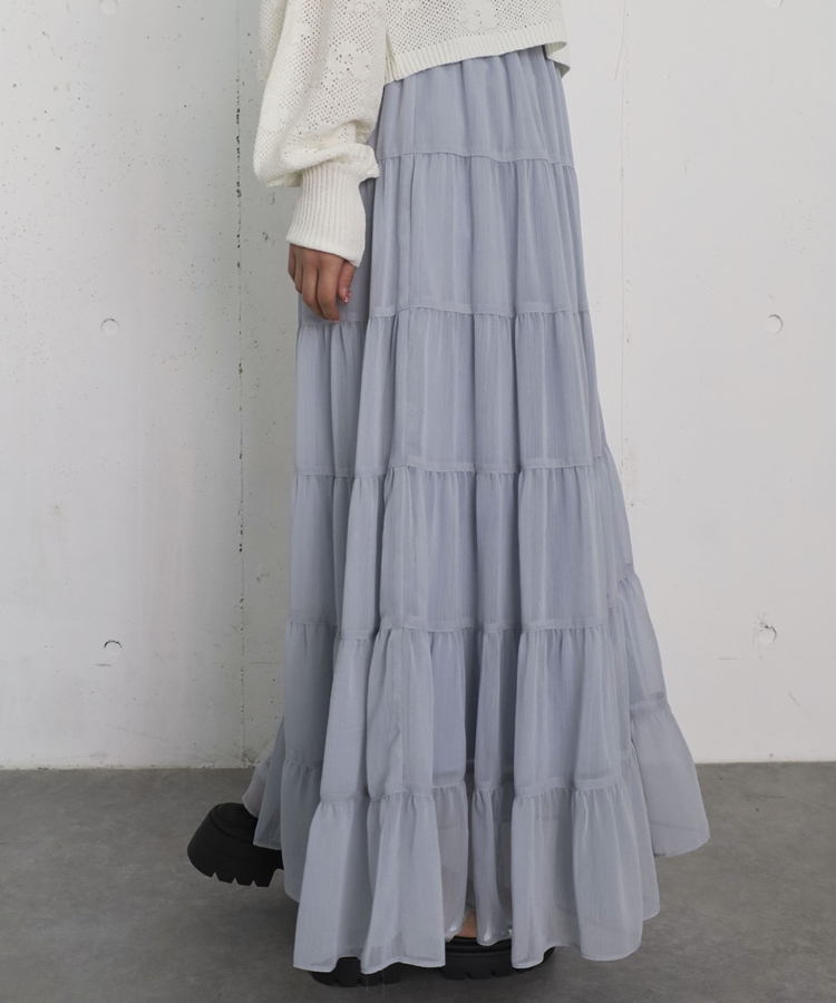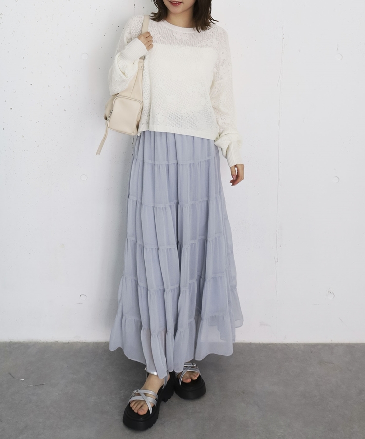 ■ふんわり揺れて映える、シアー楊柳ボリュームティアードスカート■【デザイン】・透け感のある楊柳素材が爽やかな印象のティアードスカート・ボリュームたっぷりのティアードデザインで、華やかなシルエットに・動くたびにふわっと揺れる軽やかさが魅力・シンプルなトップスと合わせるだけでコーデが決まる主役アイテム【素材感】・表面感のある楊柳生地でナチュラルな風合い・軽くてエアリーな着心地で春夏にぴったり・ウエストゴム仕様でストレスフリーに着用可能ーーーーーーーーーーーーーーー透け感:あり裏地:あり伸縮性:なし光沢感:なし生地厚さ:薄手洗濯方法:洗濯可※詳しいお手入れ方法は商品についているタグをご覧くださいーーーーーーーーーーーーーーー※ご利用のモニター環境により、実際の色味と多少異なる場合がございます【スタイリング】・Tシャツやカットソーと合わせてカジュアルに・ブラウスと合わせてフェミニンなスタイリングに・コンパクトトップスと合わせてメリハリのあるコーデに・サンダル合わせで抜け感のある春夏コーデがおすすめ▼スタッフ別の詳しい着こなしは下の COORDINATE をチェック