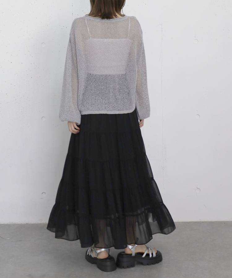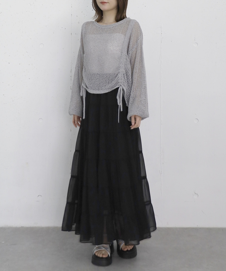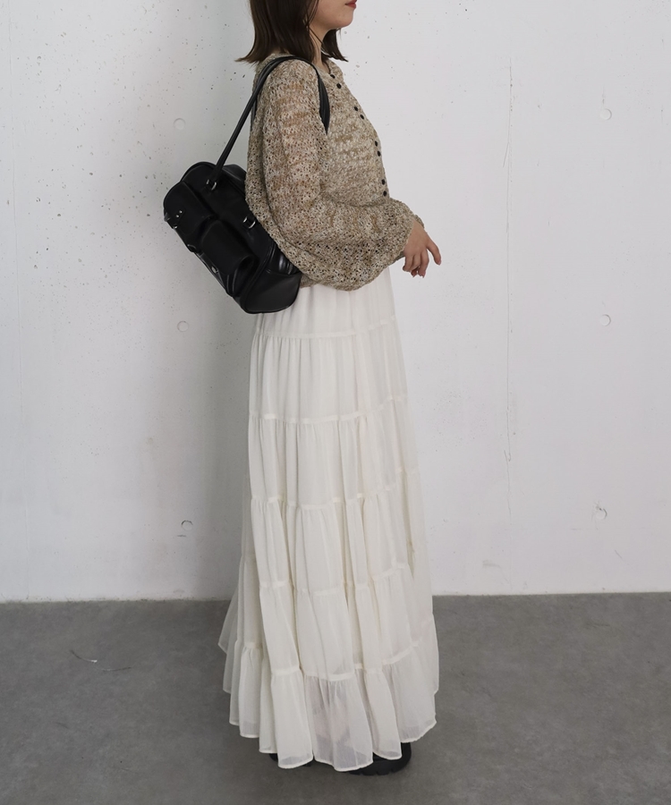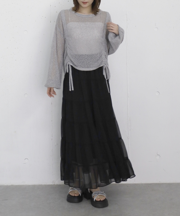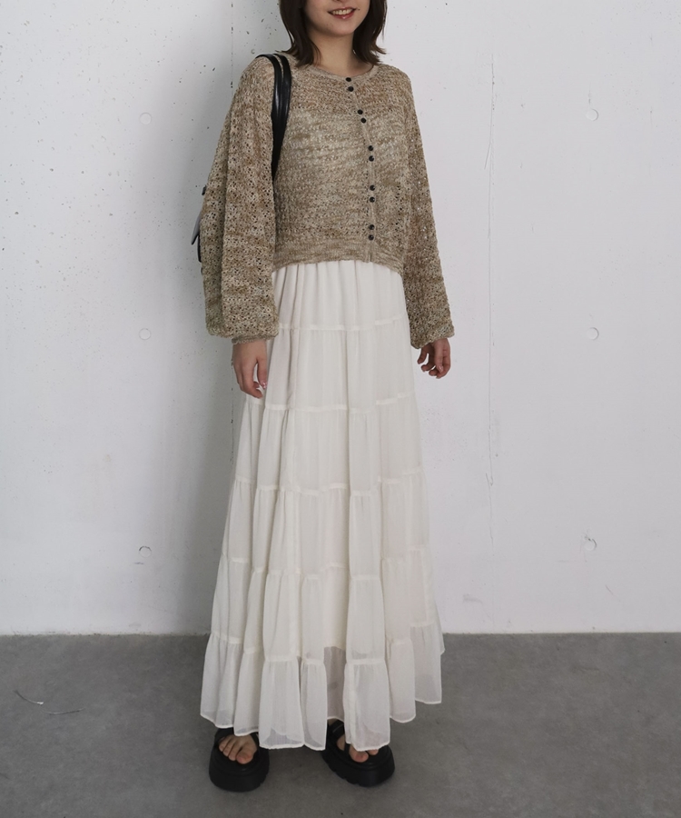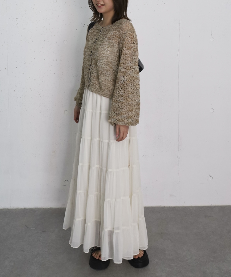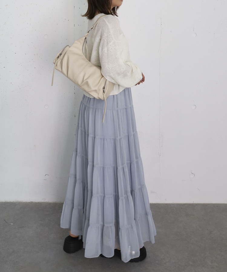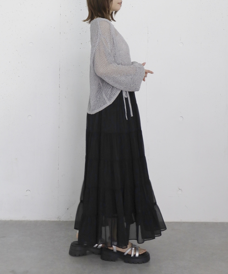 ■ふんわり揺れて映える、シアー楊柳ボリュームティアードスカート■【デザイン】・透け感のある楊柳素材が爽やかな印象のティアードスカート・ボリュームたっぷりのティアードデザインで、華やかなシルエットに・動くたびにふわっと揺れる軽やかさが魅力・シンプルなトップスと合わせるだけでコーデが決まる主役アイテム【素材感】・表面感のある楊柳生地でナチュラルな風合い・軽くてエアリーな着心地で春夏にぴったり・ウエストゴム仕様でストレスフリーに着用可能ーーーーーーーーーーーーーーー透け感:あり裏地:あり伸縮性:なし光沢感:なし生地厚さ:薄手洗濯方法:洗濯可※詳しいお手入れ方法は商品についているタグをご覧くださいーーーーーーーーーーーーーーー※ご利用のモニター環境により、実際の色味と多少異なる場合がございます【スタイリング】・Tシャツやカットソーと合わせてカジュアルに・ブラウスと合わせてフェミニンなスタイリングに・コンパクトトップスと合わせてメリハリのあるコーデに・サンダル合わせで抜け感のある春夏コーデがおすすめ▼スタッフ別の詳しい着こなしは下の COORDINATE をチェック