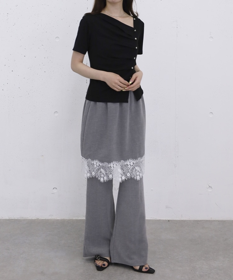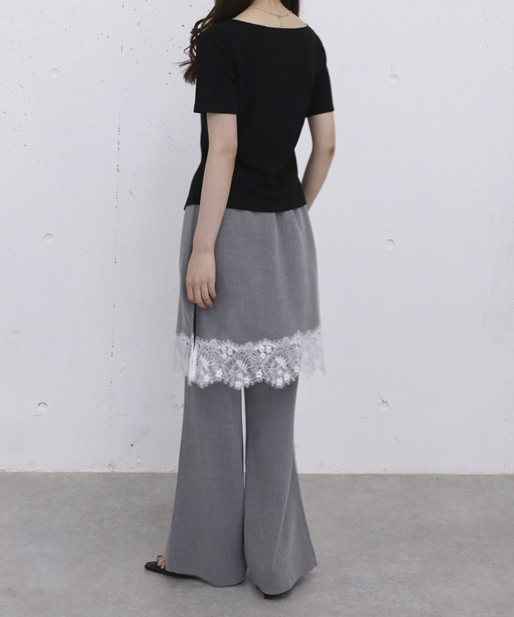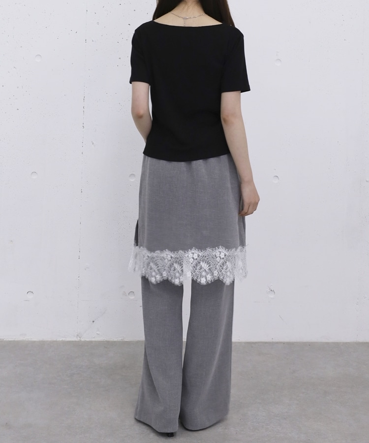 ・繊細なレースヘムが女性らしさを引き立てるミディ丈スカートとパンツのセット