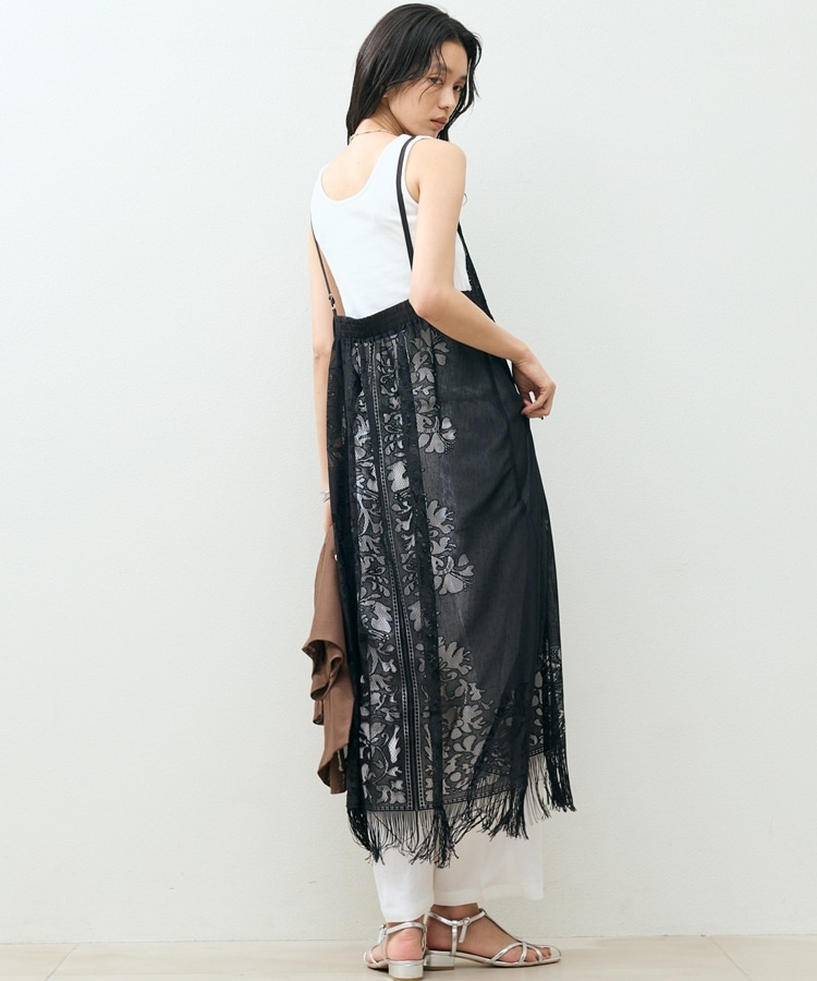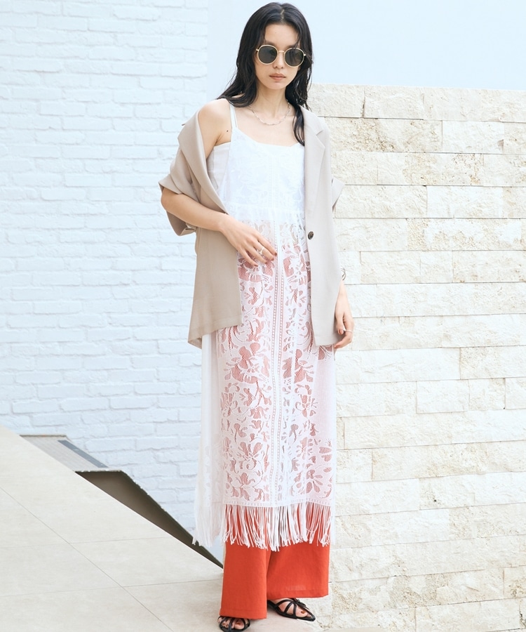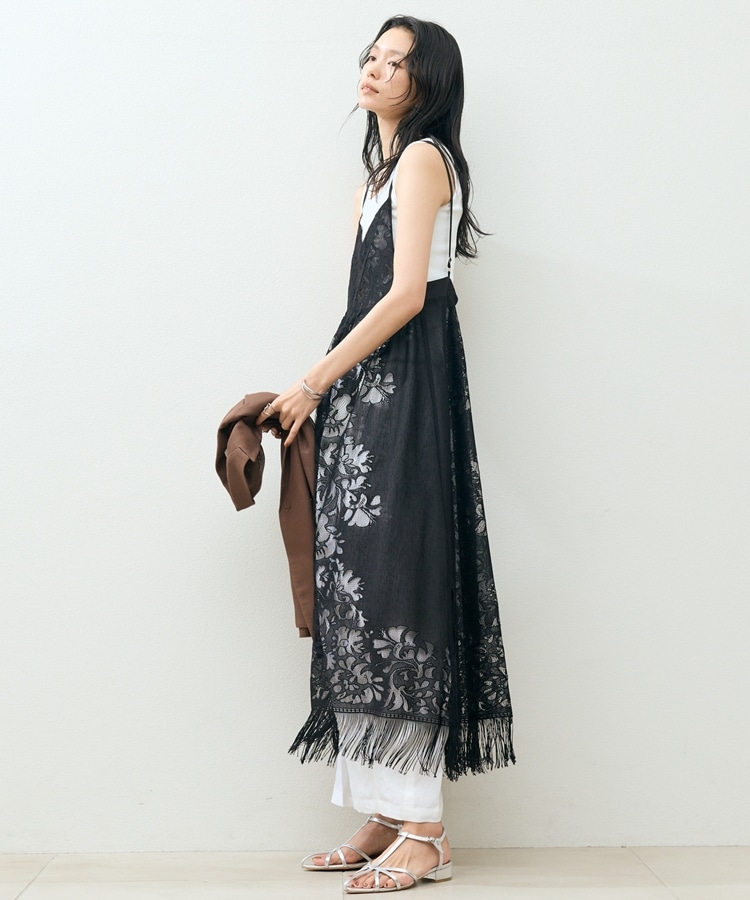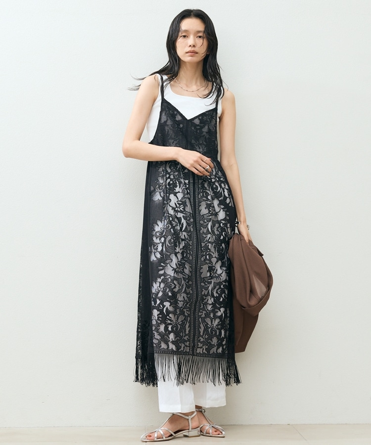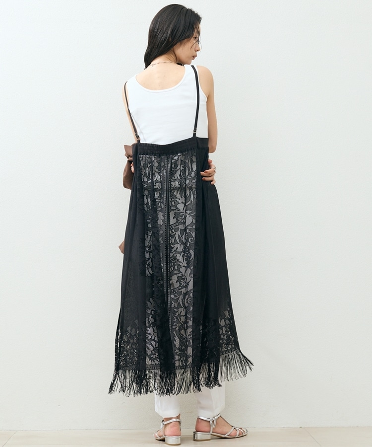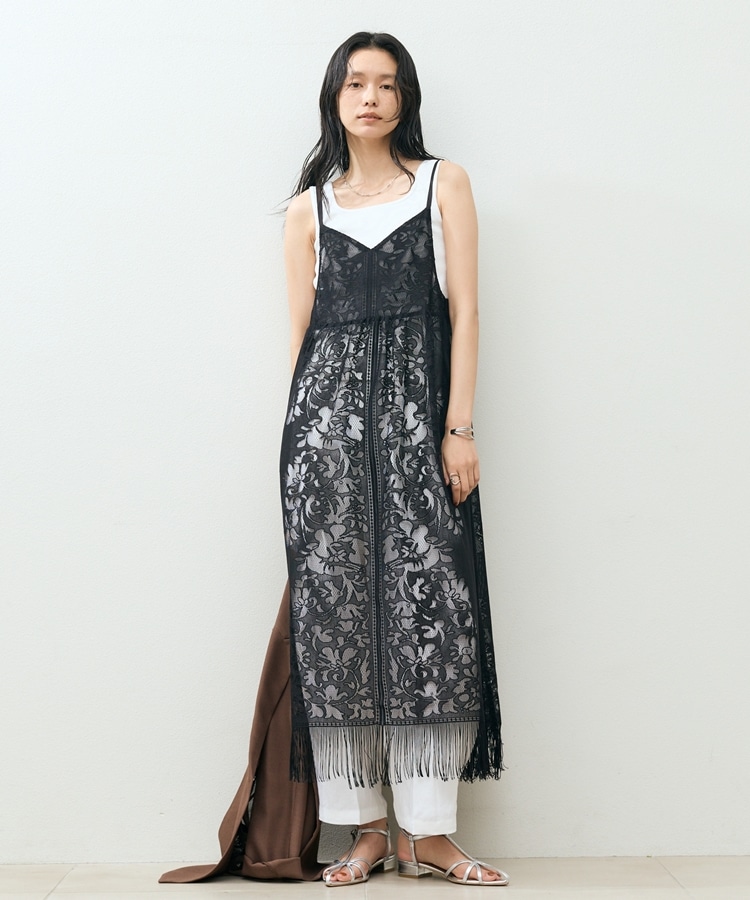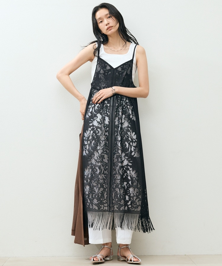 ・繊細なレースと裾のフリンジが目を引くレイヤード用のキャミワンピース